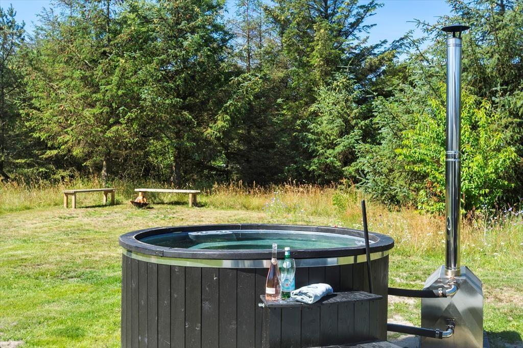 Så snart solen skinner og temperaturen stiger, er det oplagt at flytte driverlivet ud på de dejlige terrasser, der venter på flere af sider af sommerhuset. Grunden er med sine 2564 m2 ganske stor, så der er masser af plads til at boltre sig på plænen. De yngste feriegæster vil måske også sætte pris på, at der er både gynger og sandkasse i haven – mens de voksne kan glæde sig over, at bilen kan stå trygt i carporten, når der spilles bold. I haven finder I et vildmarksbad, som også kan benyttes under jeres ferie.