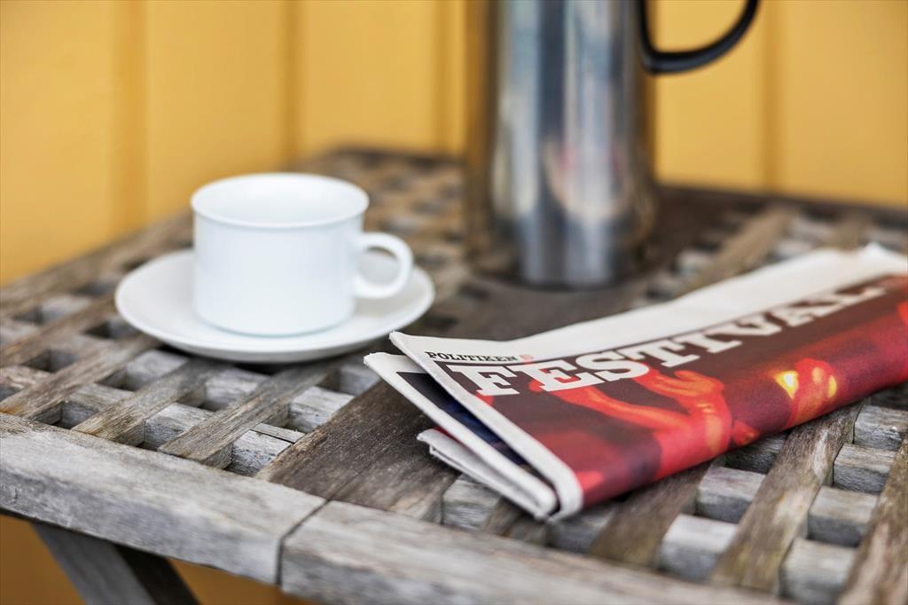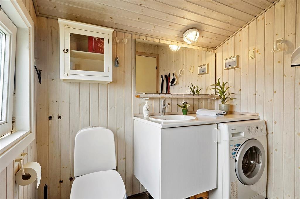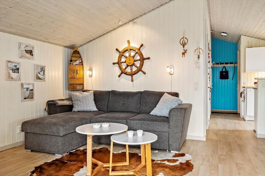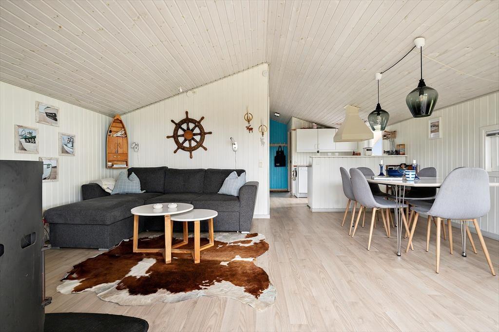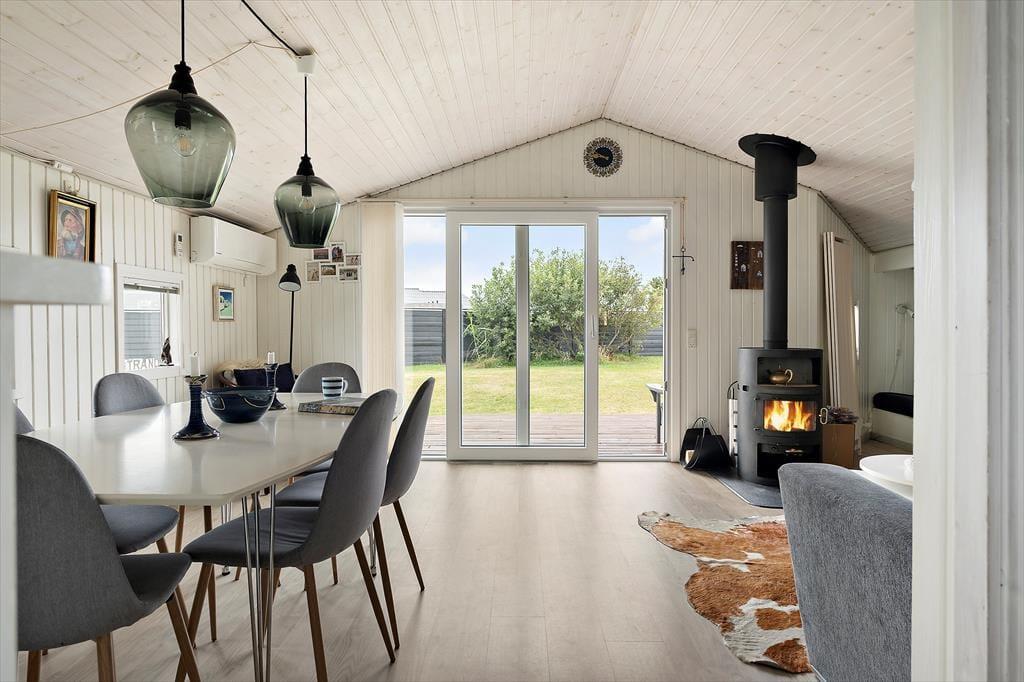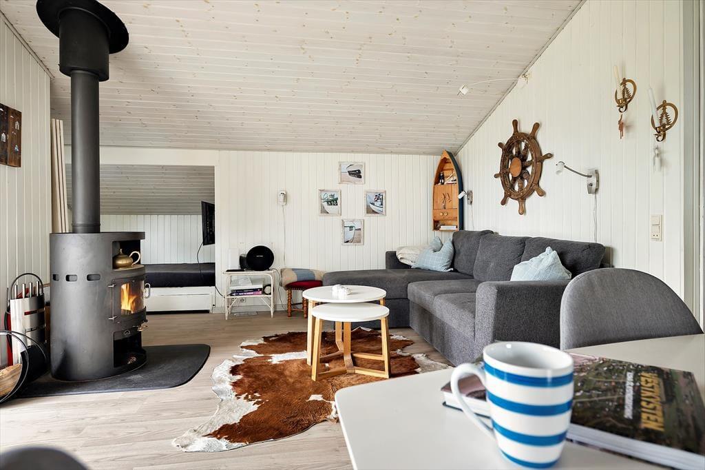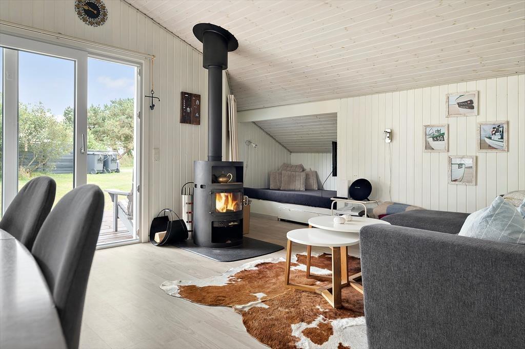 Fra køkkenet er der åbent mod spiseafdelingen og stuen, og hele huset er dejligt lyst og enkelt indrettet, og skulle vejret drille lidt en dag, kan man sidde og læse en god bog, eller tage et spil kort med børnene samtidig med, at man kan nyde varmen fra den flotte store brændeovn. I forbindelse med stuen er det 3. soveværelse bestående af en alkove med dobbeltseng, og ligesom i køkkenet er der også her udgang til den dejlige store terrasse.