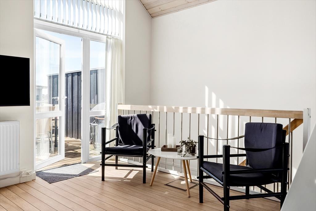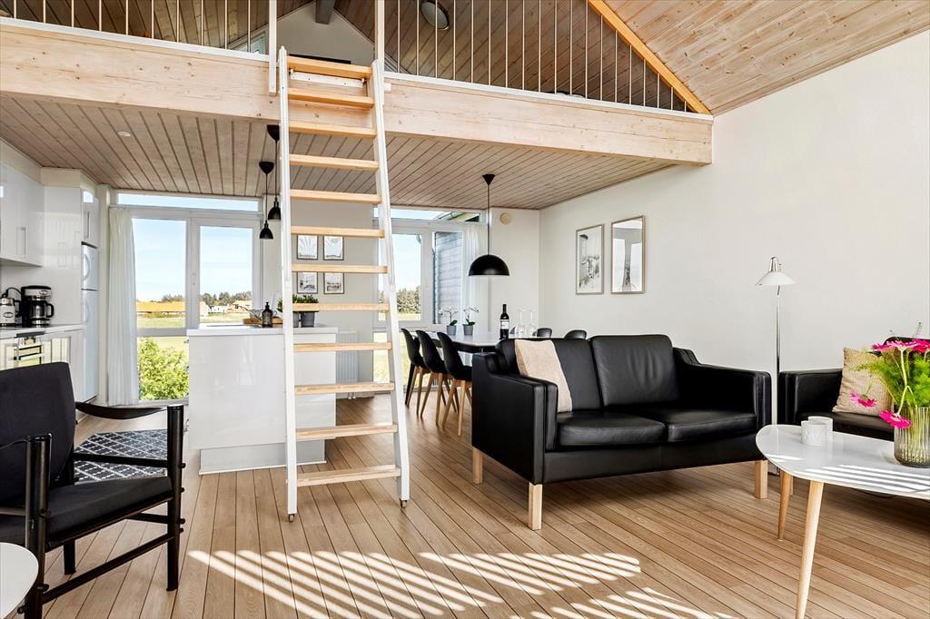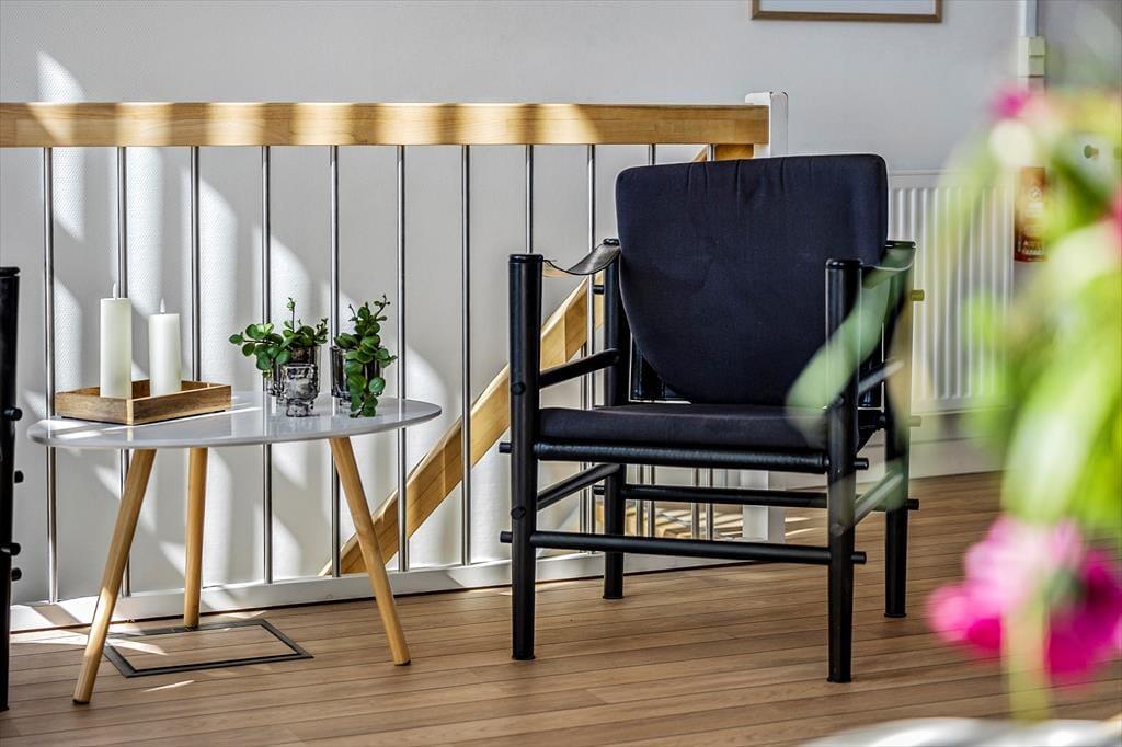 Inden døre i lejligheden kan I brede jer på 96 m2, der blandt andet rummer tre soveværelser, et badeværelse og en stor stue med integreret køkken. Sovegemakkerne er alle placeret i stueplan, mens stuen udgør hele førstesalen – og herfra går der endda en trappe op til en hems, der hurtigt kan blive udnævnt til de yngste feriegæsters foretrukne hyggekrog. Stuen er et dejligt samlingspunkt med god plads til at spille spil, læse, se film og meget mere i sofaen og det øvrige pæne møblement. Takket være den imponerende loftshøjde og de store vinduespartier er atmosfæren lys og let, og udsigten over de grønne omgivelser er glimrende.