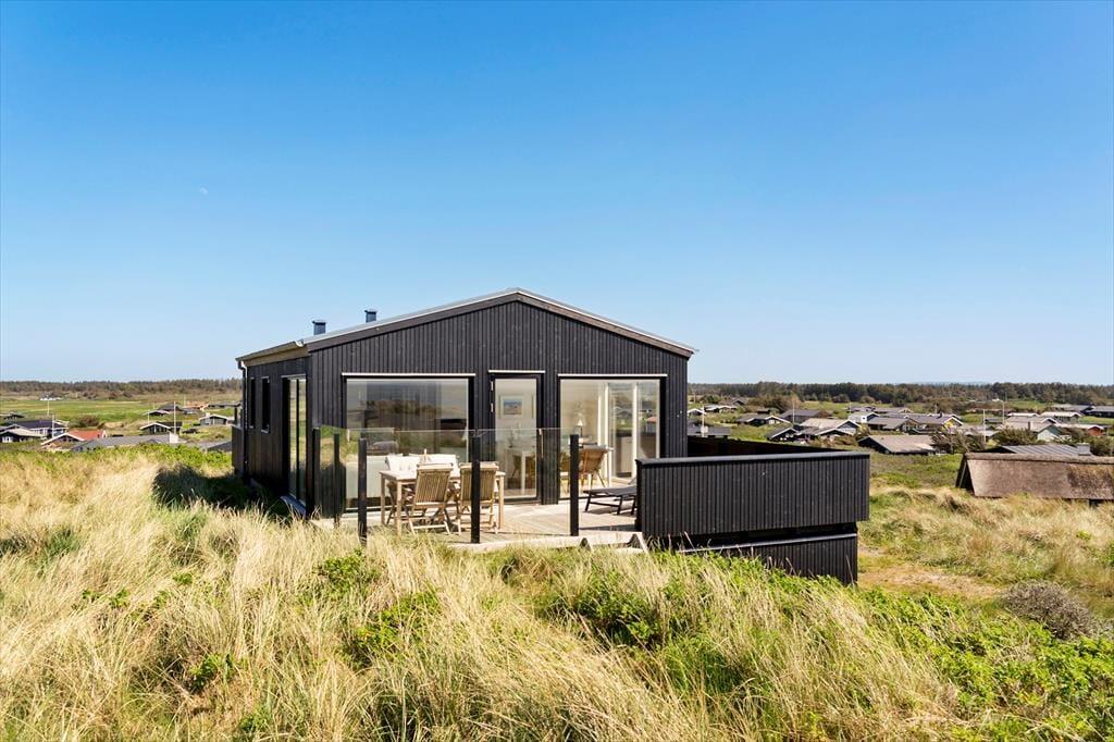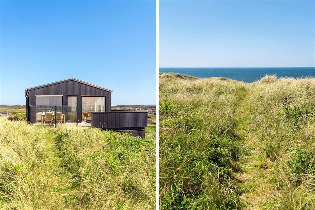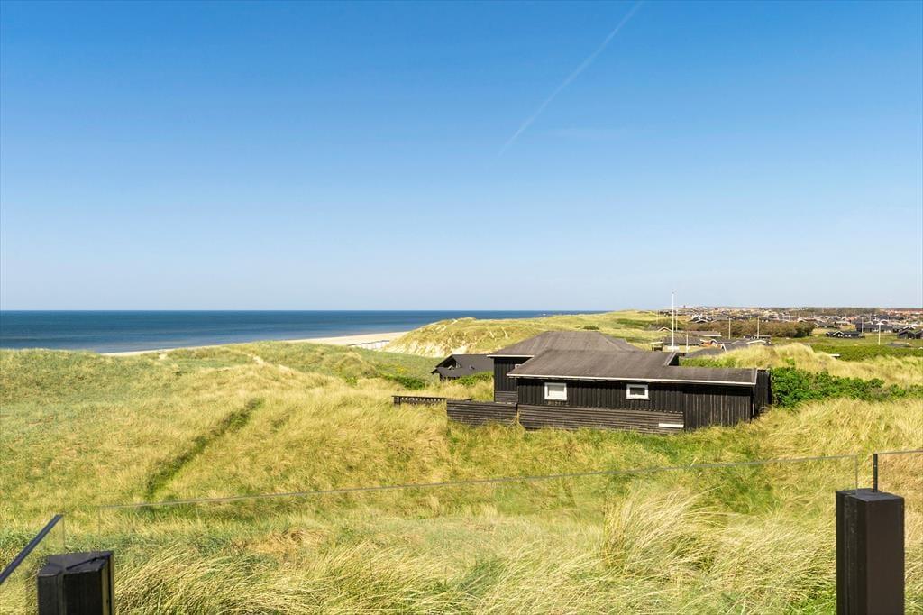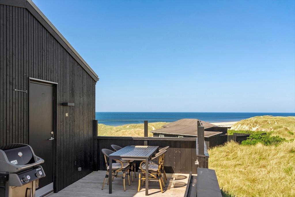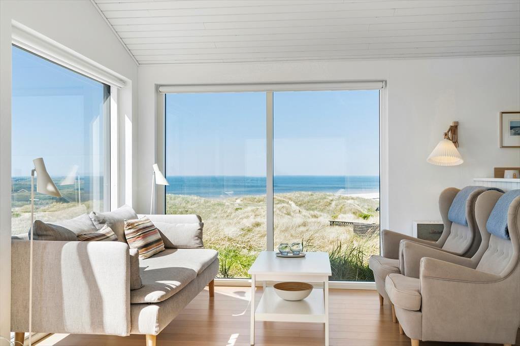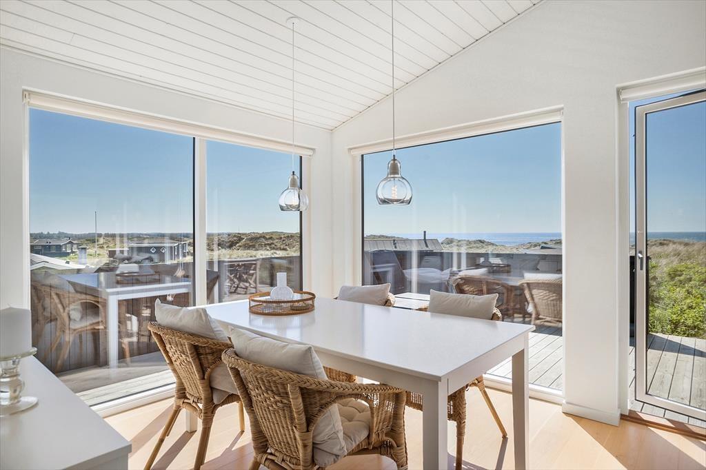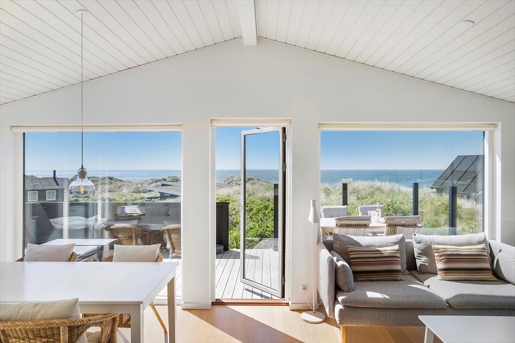 I har frit udsyn til Vesterhavet, når I holder ferie i dette lyse, stilrene og moderne sommerhus på Annavej 10. Huset ligger nemlig placeret helt oppe på toppen af klitterne syd for Løkken, og fra både huset og terrasserne får I glæde af den skønneste panoramaudsigt over vandet, stranden og det bølgende kystlandskab, og herfra kan I nyde både solopgang og solnedgang