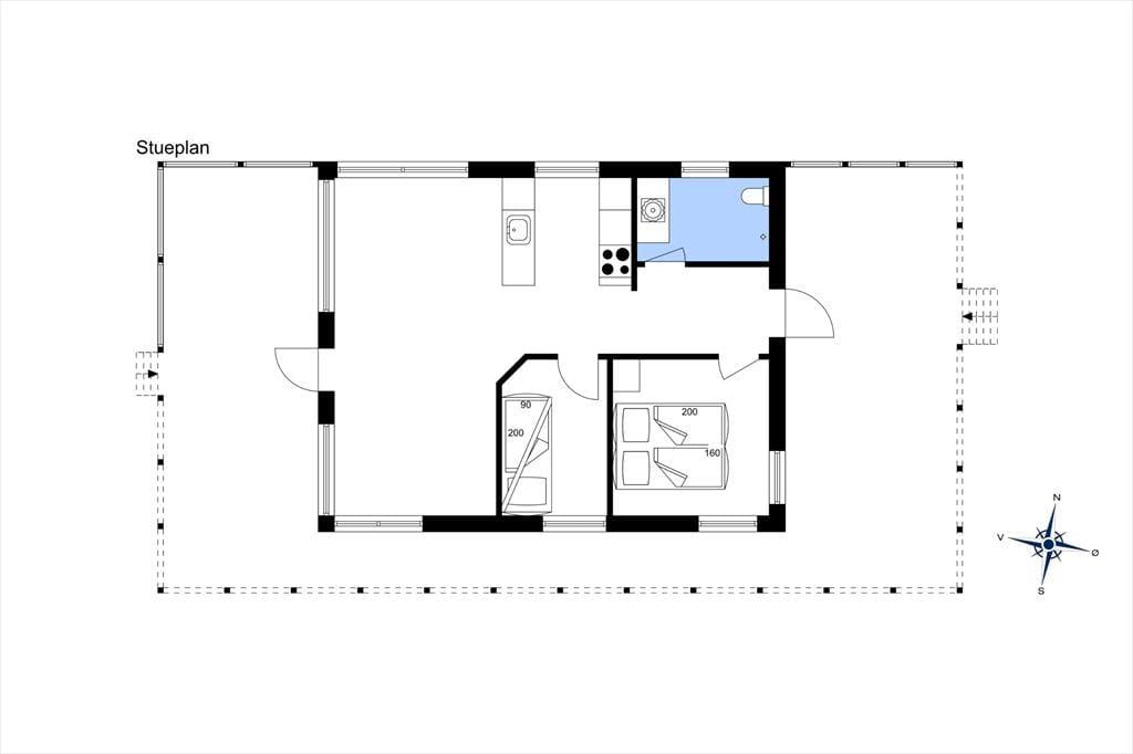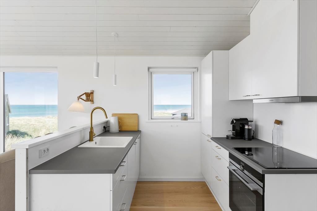 Lyset ved vestkysten er noget ganske særligt, og det oplever I hurtigt, når I holder til helt ude i de yderste klitrækker ud mod Løkken Strand. Det velindrettede hus, der måler 81 m2 fordelt på stueplan og underetage, er udstyret med store vinduespartier vendt mod nord, syd og vest, så fra stuen kan I ikke bare skue ud over havet, men har også et betagende overblik over kysten og ind mod Løkken by. Den lyse stue ligger i åben forbindelse med et velindrettet køkken, og på samme etage finder I et badeværelse med brus og to soveværelser med i alt fire sengepladser. Den rummelige og lyse underetage som I har adgang til fra klitgrunden, byder på endnu et soveværelse, et badeværelse og en stor entré samt et praktisk bryggers med vaskemaskine og tørretumbler. Ønsker I at skylle jer efter en dukkert i Vesterhavet eller blot et varmt bad under åben himmel, er det bare at hoppe under husets udebruser.