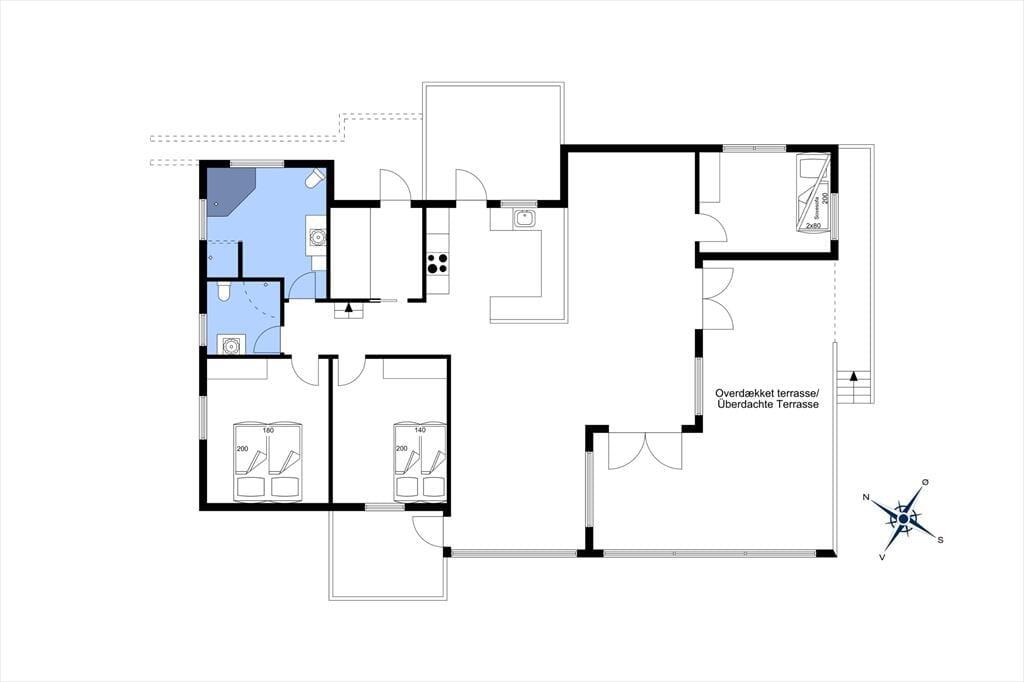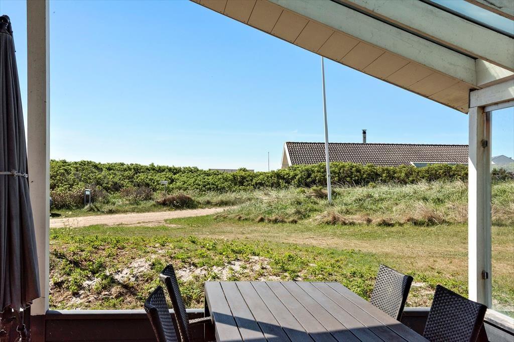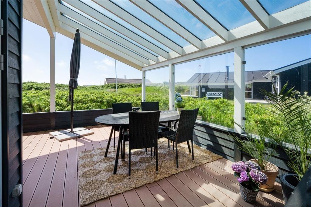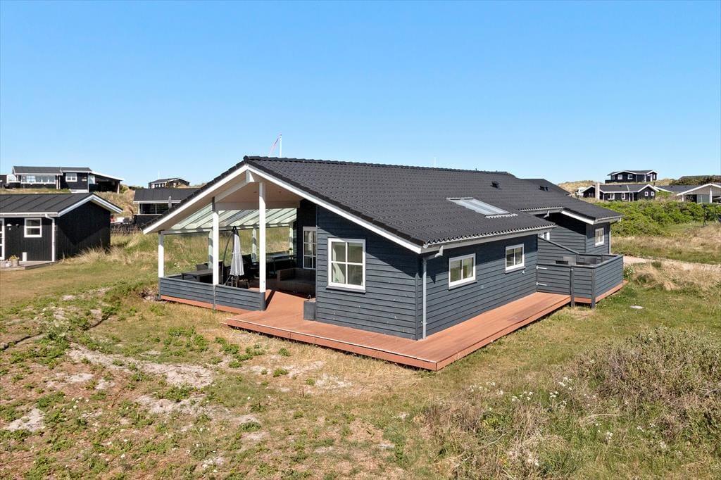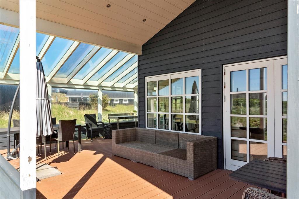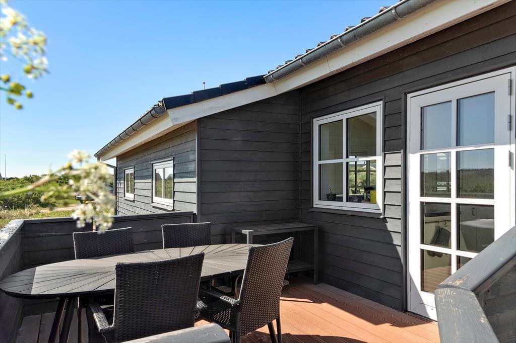Sommerhusets udearealer er mindst lige så fortrinlige, for huset er omkranset af det skønneste terrassemiljø. Det består blandt andet af en stor, overdækket og delvist afskærmet terrasse, og der er også flere åbne terrasser, hvor I kan sidde og nyde solen. For at fuldende udelivet, har I havemøbler og liggestole plus en grill og parasol til rådighed.