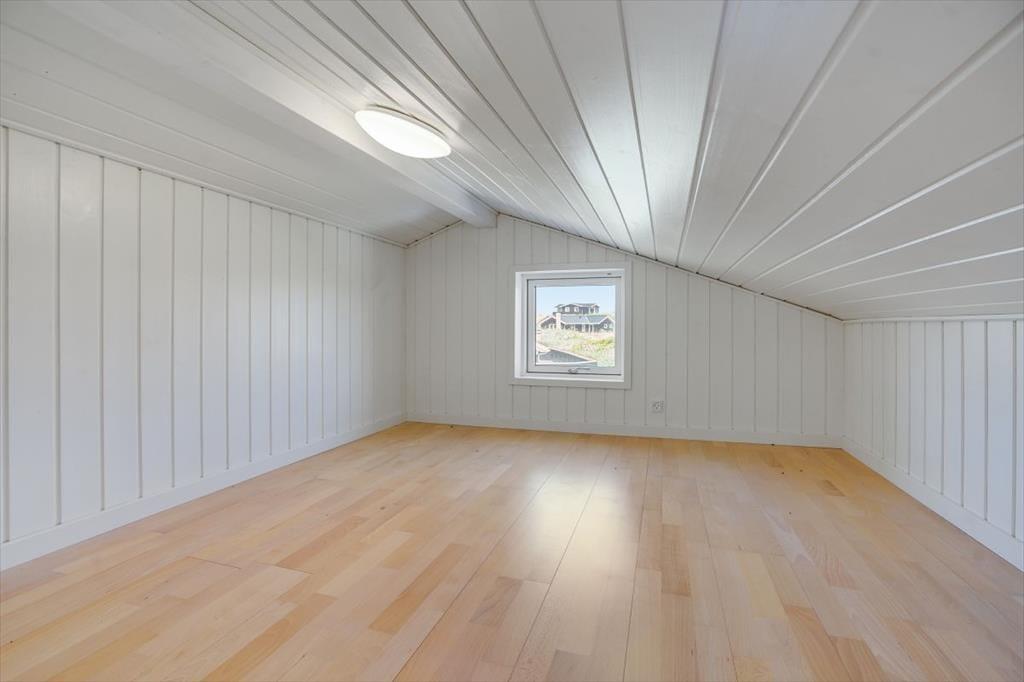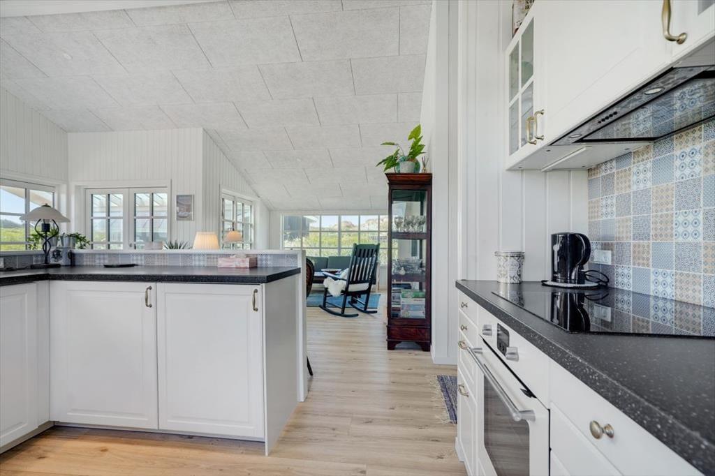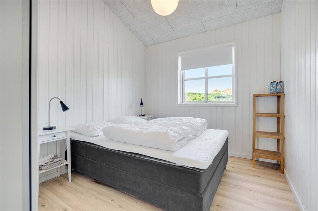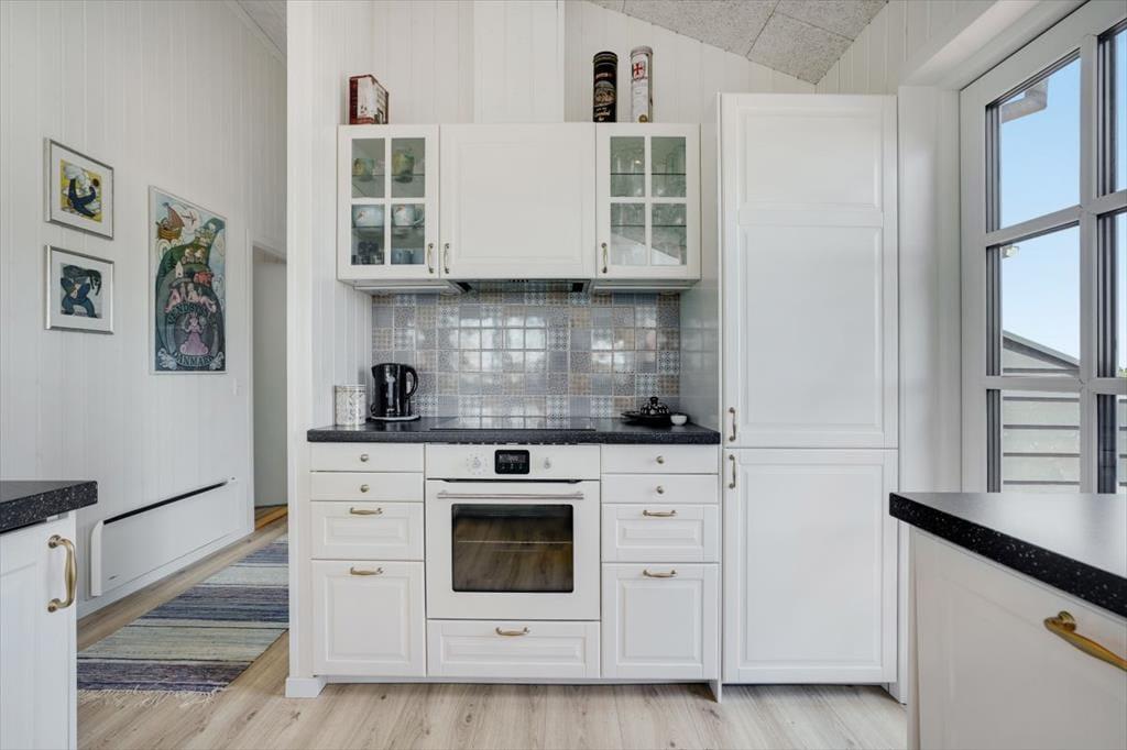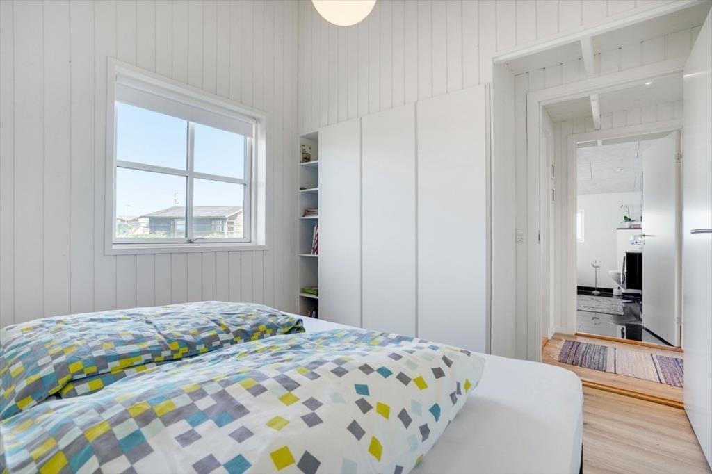 Stemningen er lys og let inden døre i sommerhuset, der har hvidmalede trælister på væggene, loft til kip og store vinduer, der giver et herligt indfaldslys. Opholdsrummet er husets hjerte, og her er der god plads til at lave mad i det åbne køkken, samles om spisebordet og slappe af i sofaafdelingen. Planløsningen byder for øvrigt på to badeværelser, hvoraf det største er udstyret med både bruser og spabad. Derudover kommer sovefaciliteterne, der består af tre værelser.