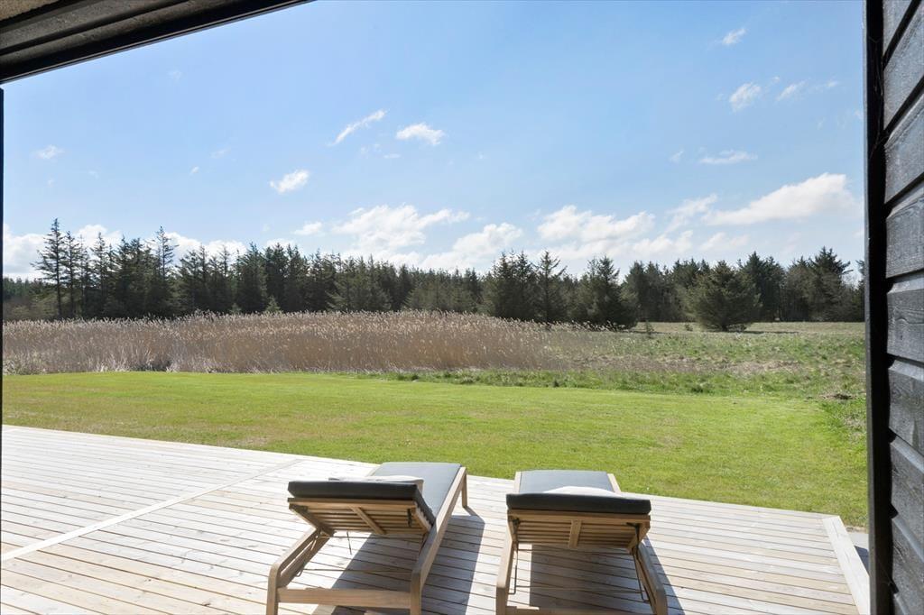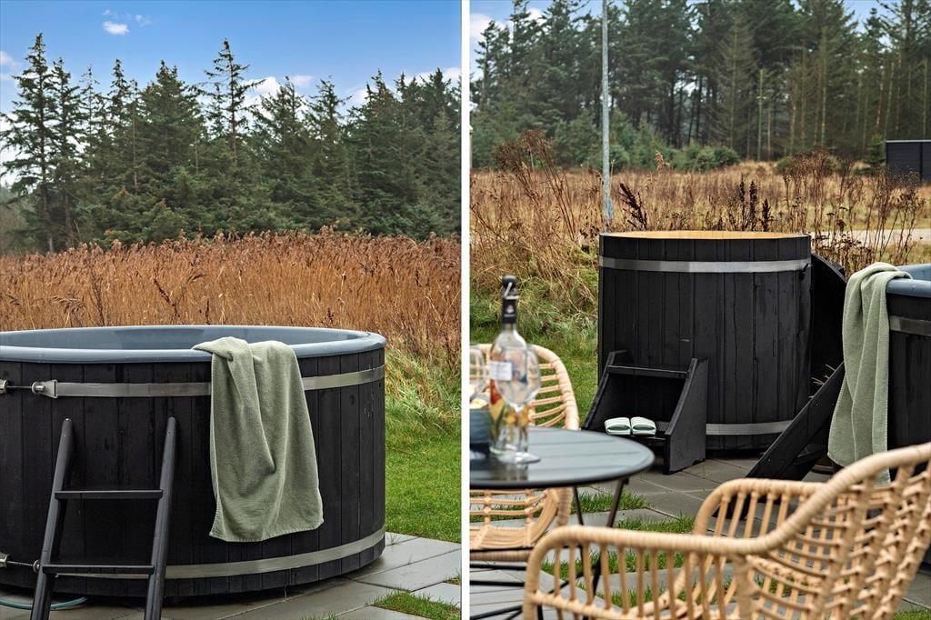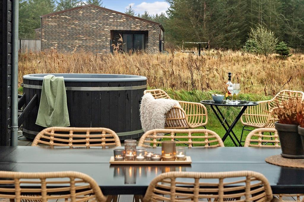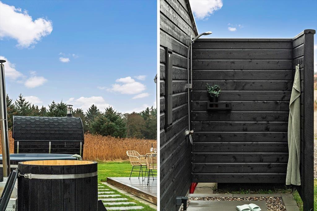 Rundt om sommerhuset er der flere terrasser at vælge imellem. Mod både øst og vest finder I overdækkede arealer, så her kan I finde skygge i løbet af dagen og ly for duggen, hvis I gerne vil blive siddende ude til langt ud på aftenen. Vil I dase i solen, er den store, sydvendte terrasse helt perfekt til formålet, og de smukke naturomgivelser er blot med til at gøre udelivet endnu skønnere. Udover de dejlige terrasser kan I også nyde godt af faciliteter som vildmarksbad, koldvandsbad, sauna og udebruser, der gør jeres udendørs ophold endnu mere luksuriøst.