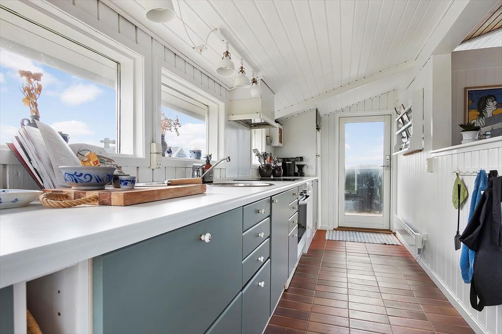 Efter seneste istandsættelse er farvetonerne lyse inden døre, og man har fundet en skøn balance mellem moderne møblement og retro elementer, der bidrager til den helt rette sommerhusstemning. I stuen kan I tilmed tænde op i pejsen, når I vil hygge jer med en god bog eller krydsogtværs i sofaen – bare husk at kigge op engang imellem, så I kan nyde udsigten over det åbne landskab, der breder sig udenfor stuevinduerne. Et funktionelt indrettet køkken ligger i forlængelse af stuen, og derudover består planløsningen af tre gode soveværelser og et badeværelse med bruser.