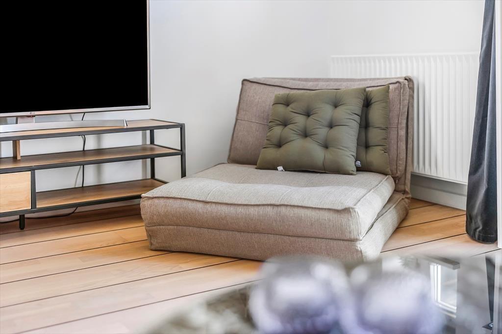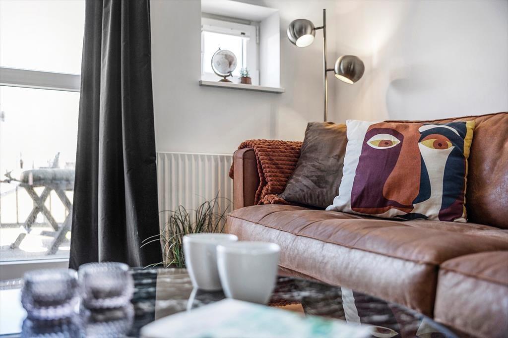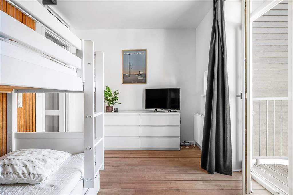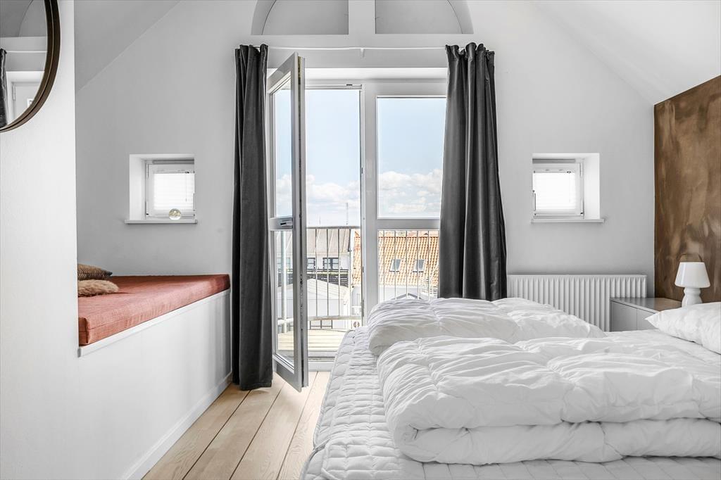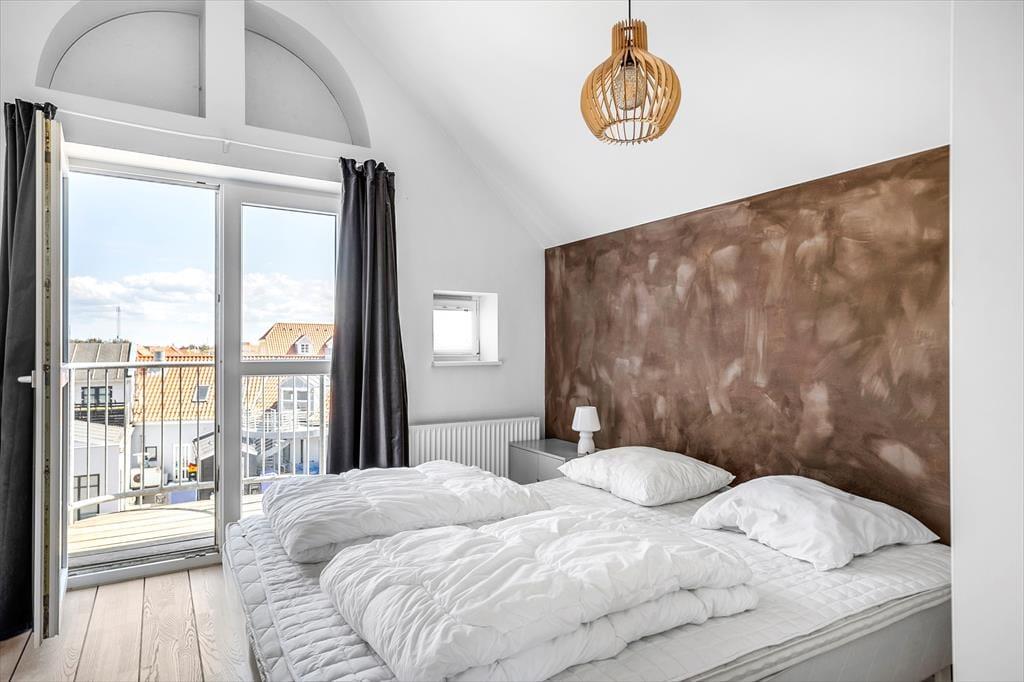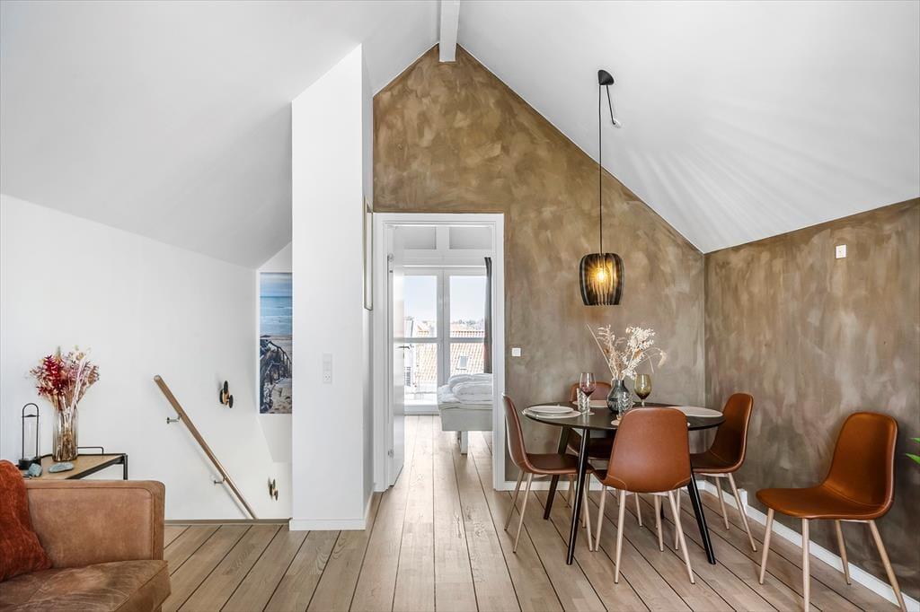 Der er plads til fire personer her i lejligheden, der breder sig over første og anden sal i en moderne etageejendom. I nederste niveau ligger et soveværelse med balkon samt et pænt brusebadeværelse og et veludstyret åbent køkken. Her er der plads til, at man kan sidde og hygge sig ved køkkendisken under madlavningen – og når det er spisetid, kan det anbefales at dække op ved stuens spisebord. Stuen ligger øverst i lejligheden, og det er et skønt opholdsrum med loft til kip og en dejligt lys atmosfære. Mod vest har I direkte adgang til en balkon, og i den anden ende af stuen fører en dør ind til et lyst soveværelse med en lille alkove/hyggekrog.