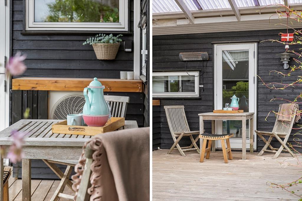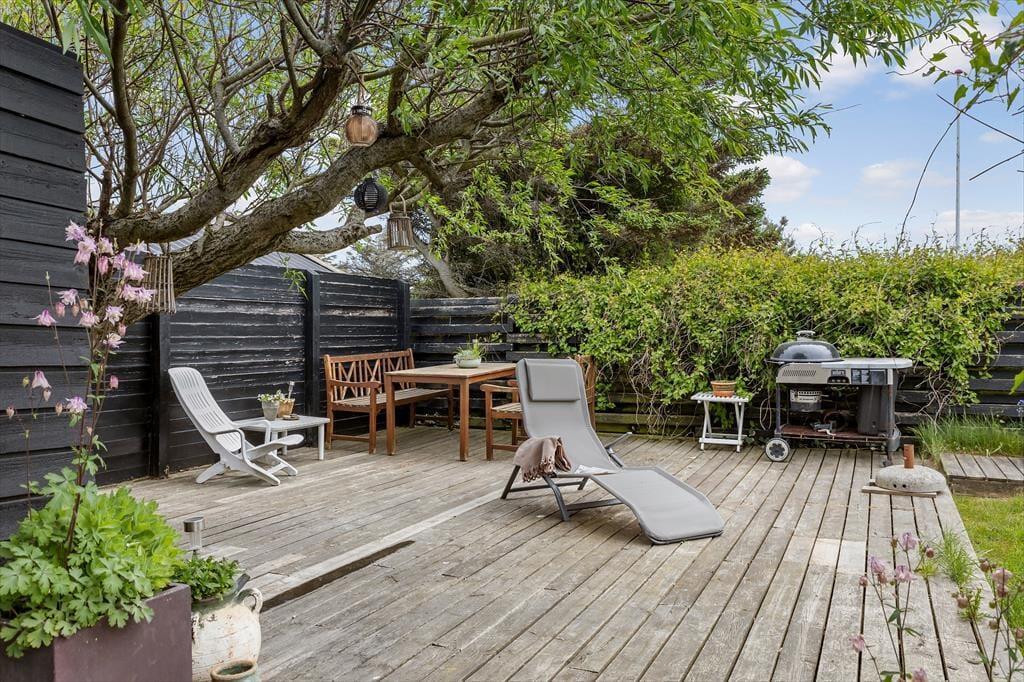 Sommerhusets grund omkranses af tætte buske, og på græsplænen er der god plads til at spille frisbee eller lege med hunden. Trænger I mest af alt til at slappe af, er det helt rigtigt at slå sig ned på det ugenerede og solrige terrassemiljø, der breder sig mod syd og øst. Der er flere gode siddepladser at vælge imellem, inklusiv et overdækket areal, og takket være bruseren kan I starte dagen med et udendørs skyl, mens fuglene kvidrer deres morgensang, og Furreby langsomt vågner.