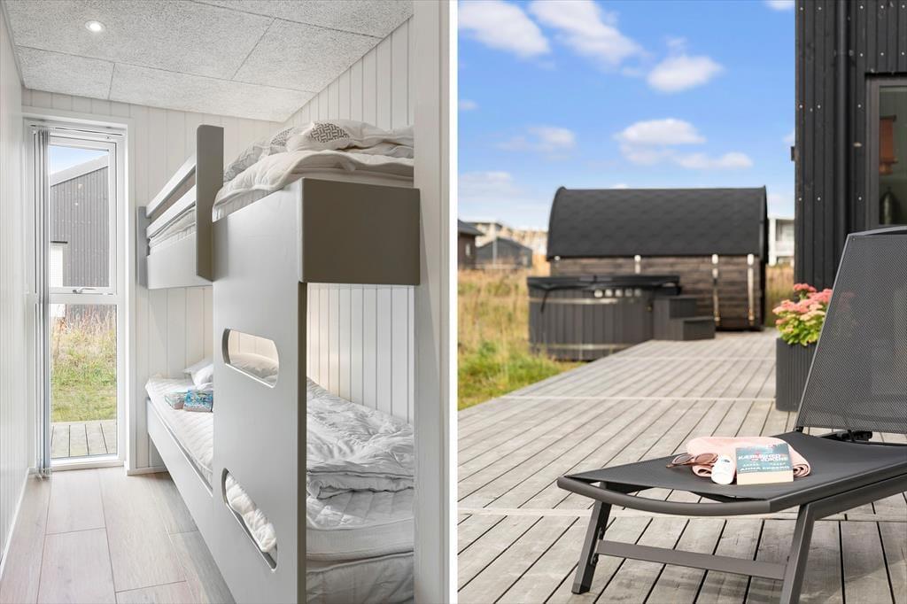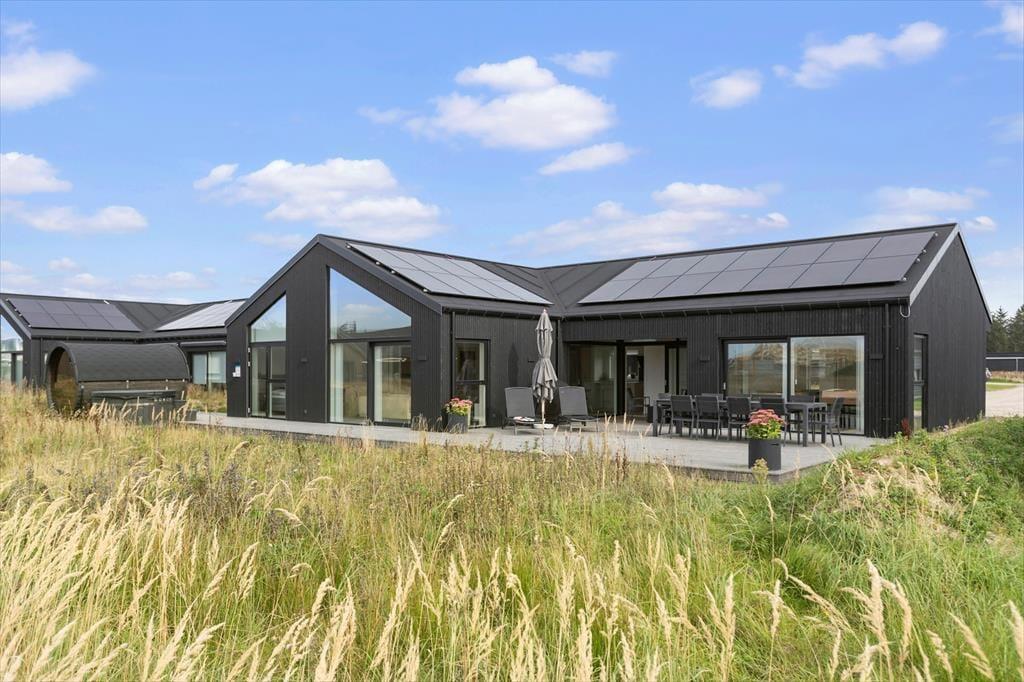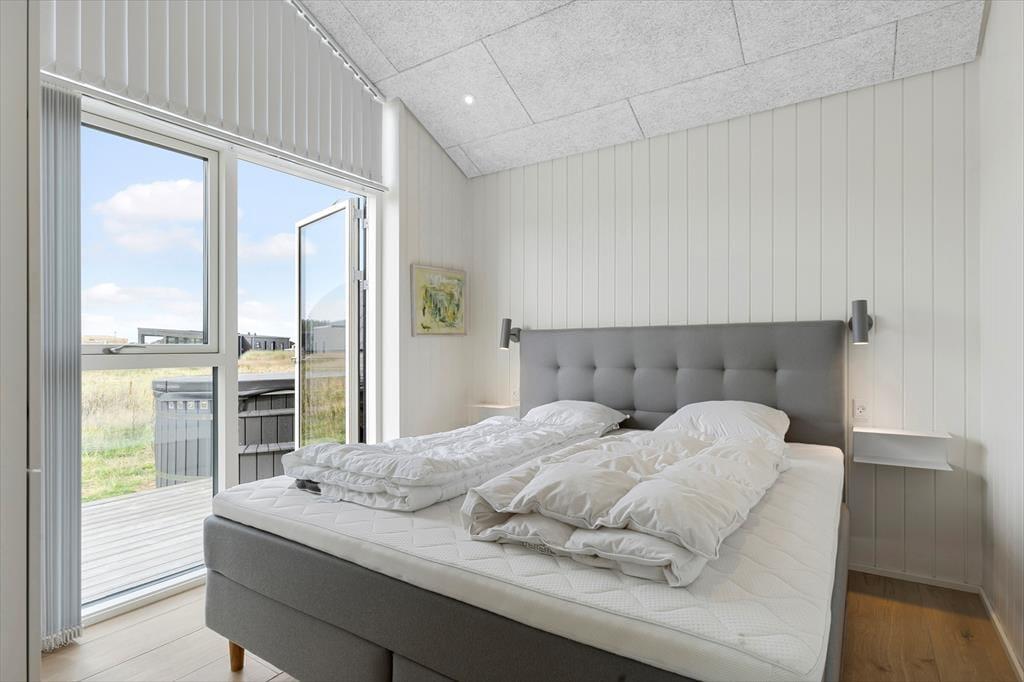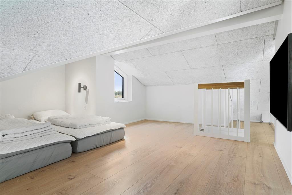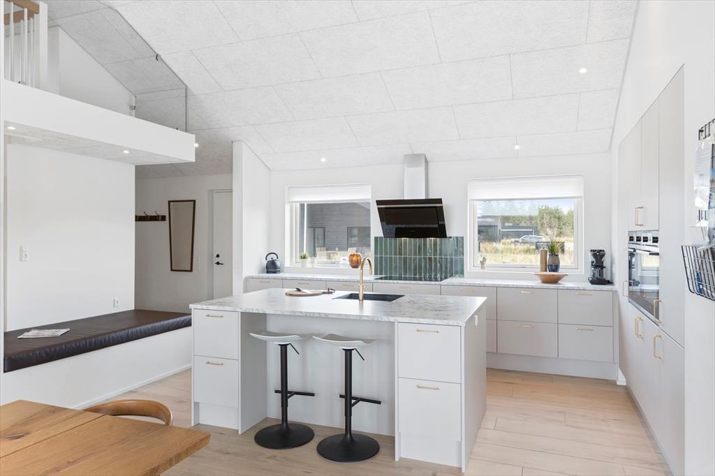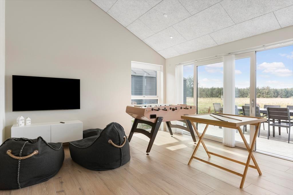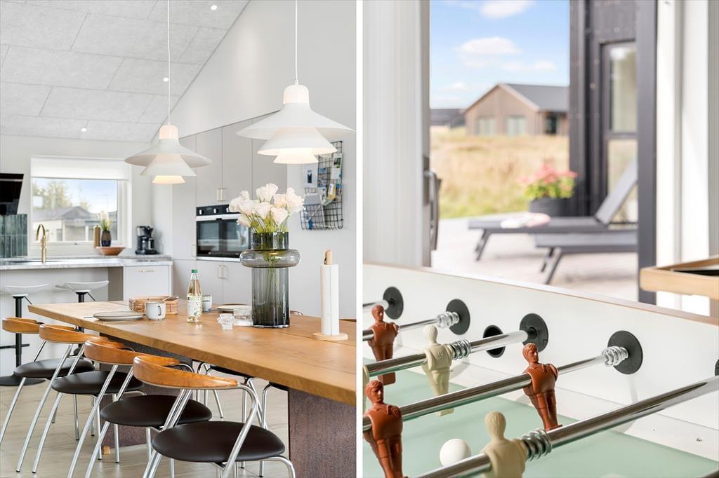 Sommerhuset og den integrerede garage er opført i 2023 med brug af de bedste materialer, og takket være en sikker stilsans fremstår alle rum lyse og indbydende. Udover de fem soveværelser, er der ekstra sovepladser på hemsen, og derfor kan I fint samles op til ti voksne og to børn. Centralt i huset danner stue og køkken tilsammen et imponerende opholdsrum med flot loftshøjde, akustiklofter og store vinduespartier. Ved det veludstyrede kvalitetskøkken er der barstole og en briks, så dele af selskabet kan samles her til en aperitif og hyggesnak, mens aftensmaden bliver færdig på komfuret. Når middagen er klar, er der plads til alle omkring langbordet, og bagefter er der fri leg i aktivitetsrummet, hvis I er i humør til at spille bob og bordfodbold. En tilbagelænet stund i stuens sofa foran fladskærmen er måske også tiltrængt – eller alternativt i badekarret på det ene af husets to badeværelser.