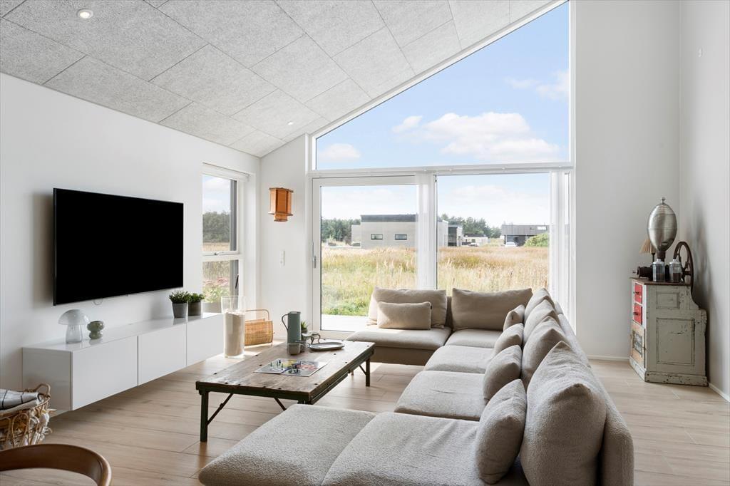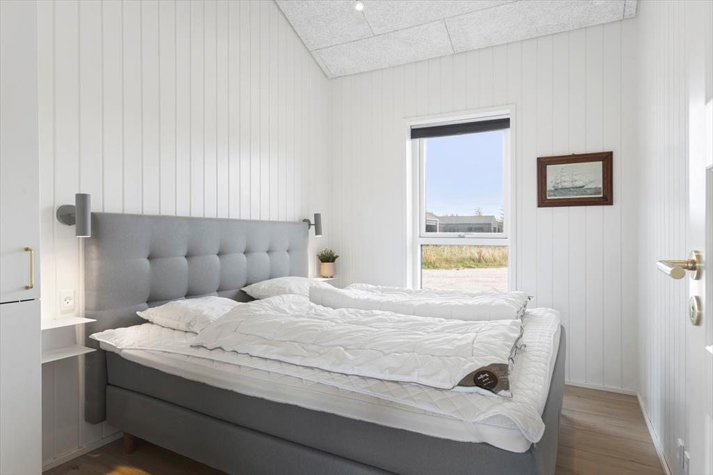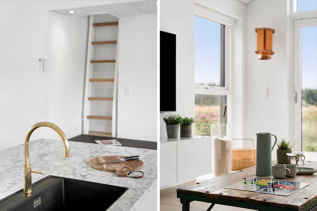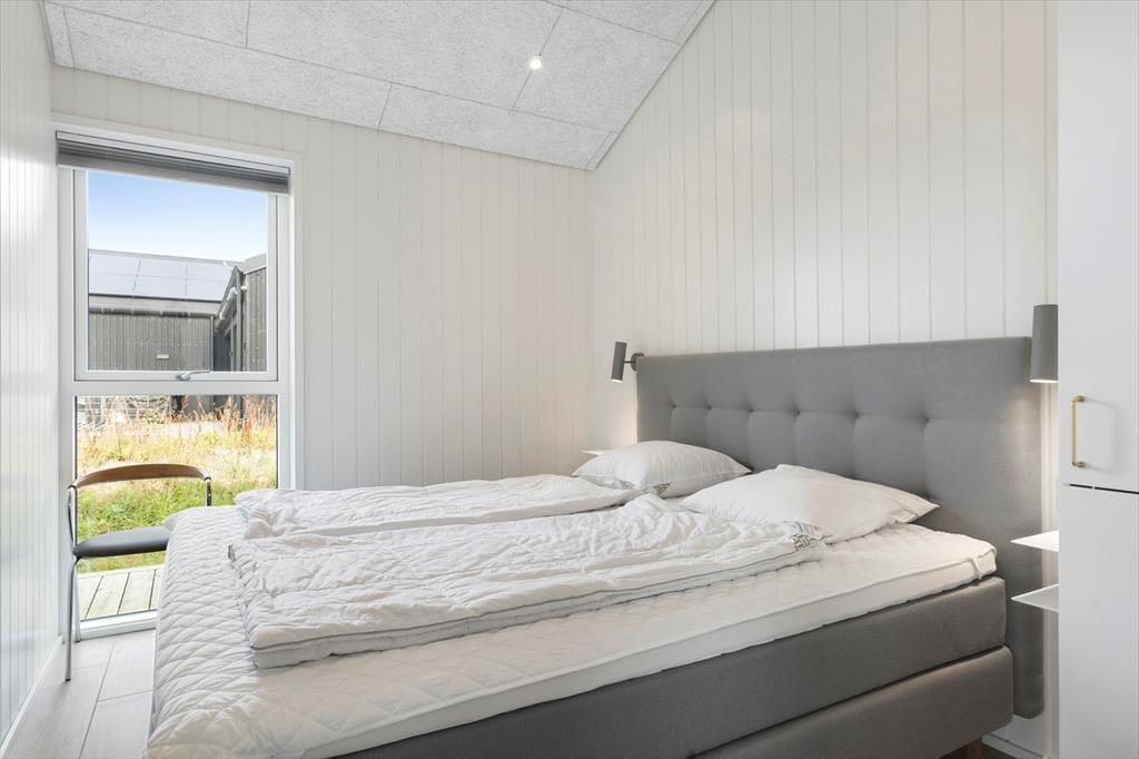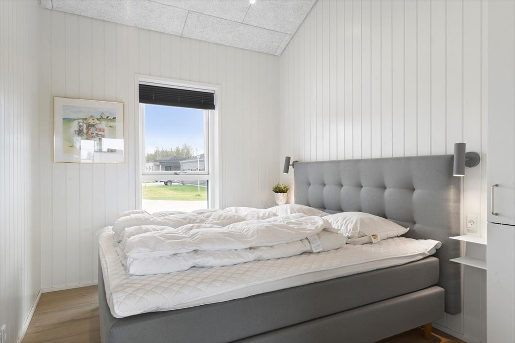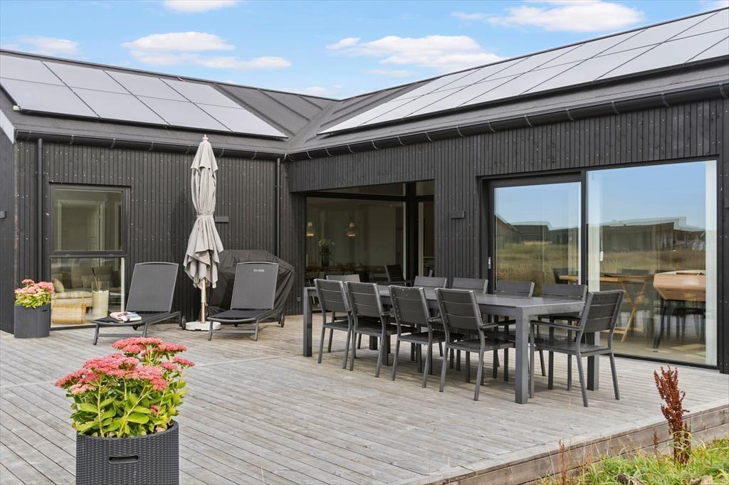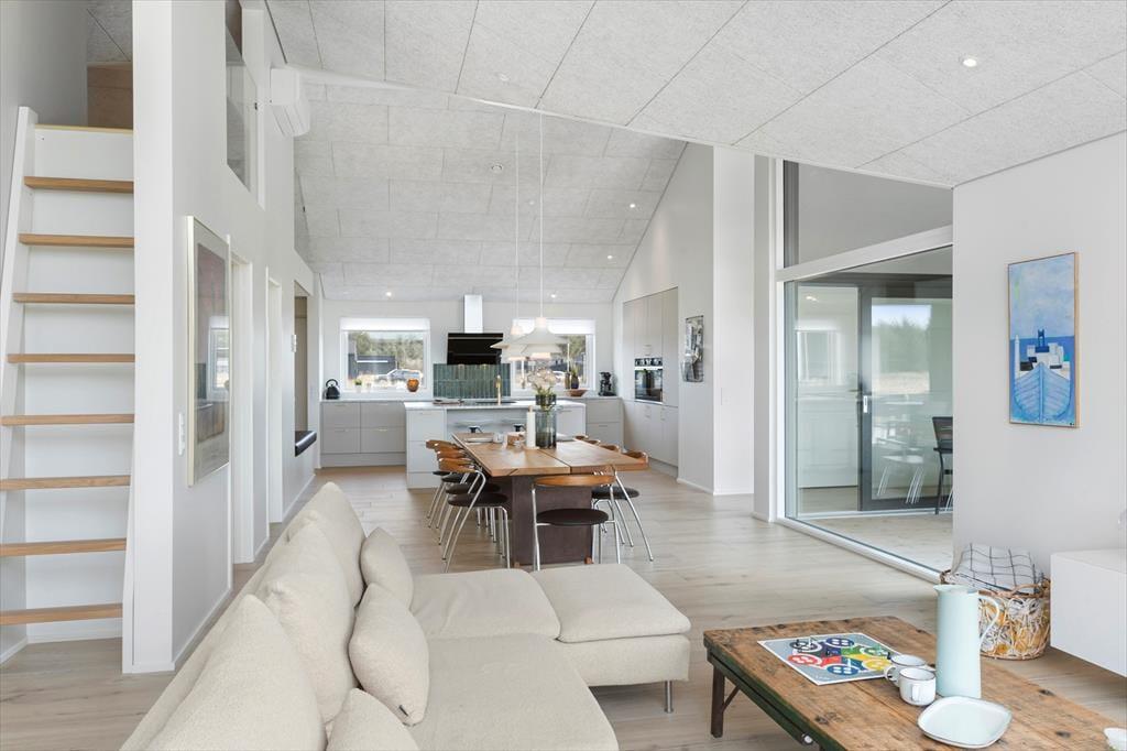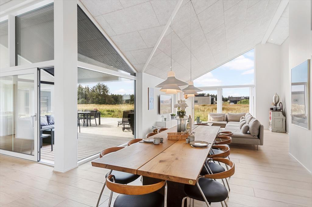 Sommerhuset og den integrerede garage er opført i 2023 med brug af de bedste materialer, og takket være en sikker stilsans fremstår alle rum lyse og indbydende. Udover de fem soveværelser, er der ekstra sovepladser på hemsen, og derfor kan I fint samles op til ti voksne og to børn. Centralt i huset danner stue og køkken tilsammen et imponerende opholdsrum med flot loftshøjde, akustiklofter og store vinduespartier. Ved det veludstyrede kvalitetskøkken er der barstole og en briks, så dele af selskabet kan samles her til en aperitif og hyggesnak, mens aftensmaden bliver færdig på komfuret. Når middagen er klar, er der plads til alle omkring langbordet, og bagefter er der fri leg i aktivitetsrummet, hvis I er i humør til at spille bob og bordfodbold. En tilbagelænet stund i stuens sofa foran fladskærmen er måske også tiltrængt – eller alternativt i badekarret på det ene af husets to badeværelser.