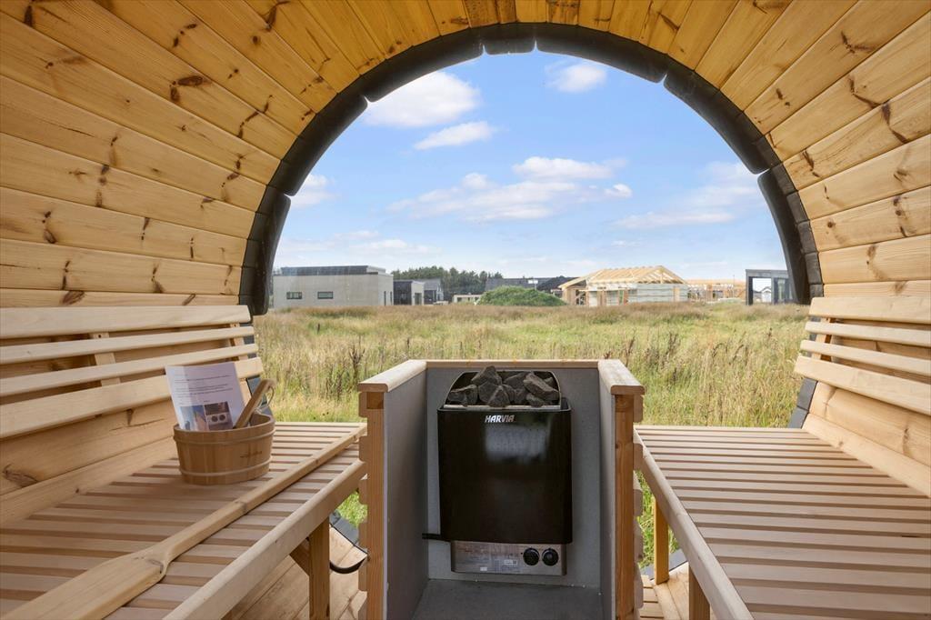 Fra badeværelset har I direkte udgang til sommerhusets udendørs bruser, og herfra er der kort afstand til saunaen og vildmarksbadet, som I kan få stor glæde af hele året rundt. Den store træterrasse, der breder sig mod syd og vest, gør sig især glimrende på solrige dage – tænk at sidde her med en god frokost eller til langt ude på på de lyse sommeraftener.