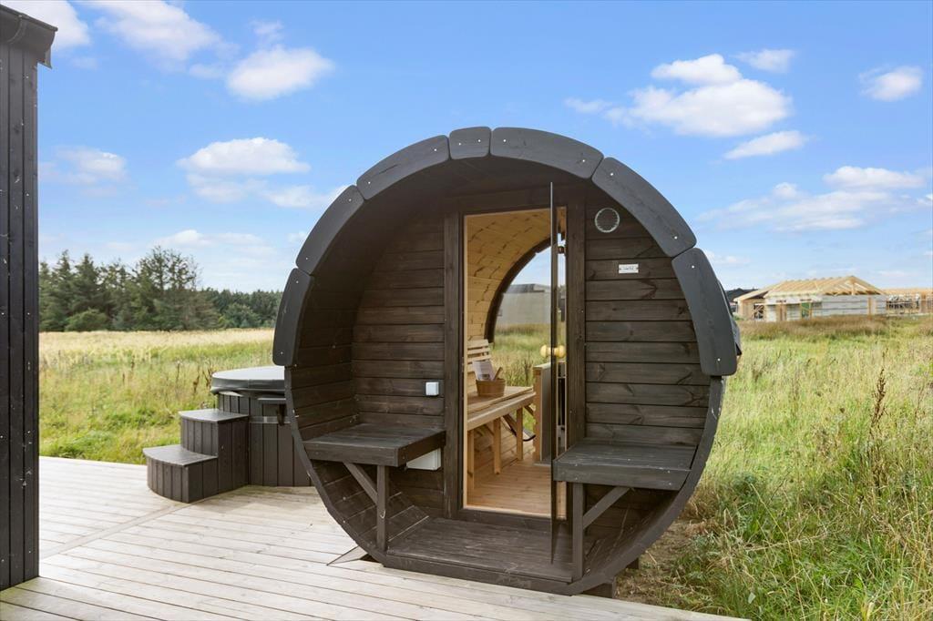 I kan se frem til en vaskeægte livsnyderferie på Karpen 6 lige udenfor Løkken by i et fredet område. Dette moderne sommerhus er på hele 172 m2 og er blandt andet indrettet med aktivitetsrum, et lækkert køkken og fem flotte soveværelser, og ude har I et skønt wellnessmiljø med tøndesauna og vildmarksbad. Selv garagen på 33 m2 er et gennemført byggeri med elbiloplader og bryggers, så alt i alt får I de bedste betingelser for at slappe af og nyde tilværelsen.