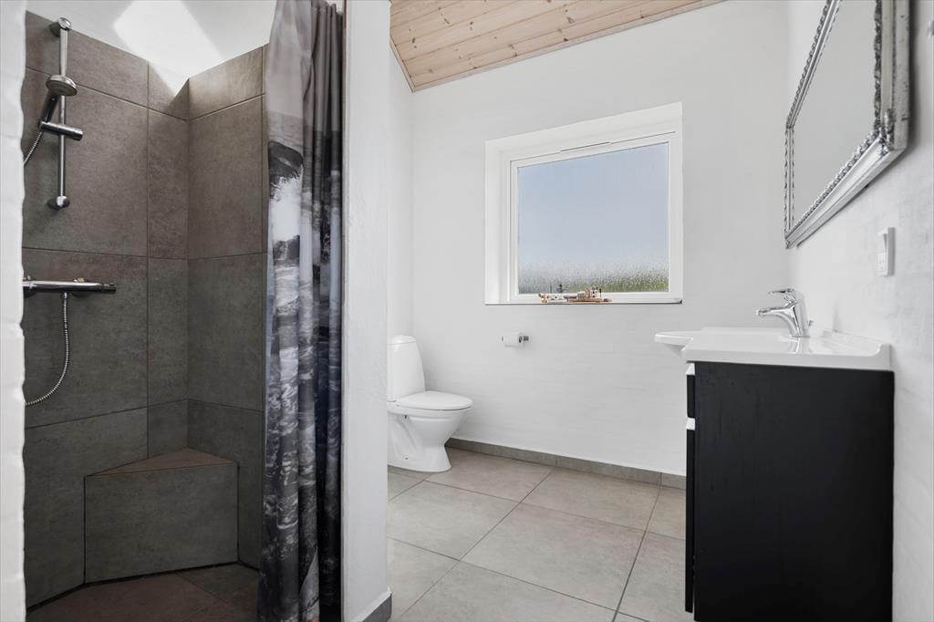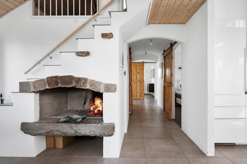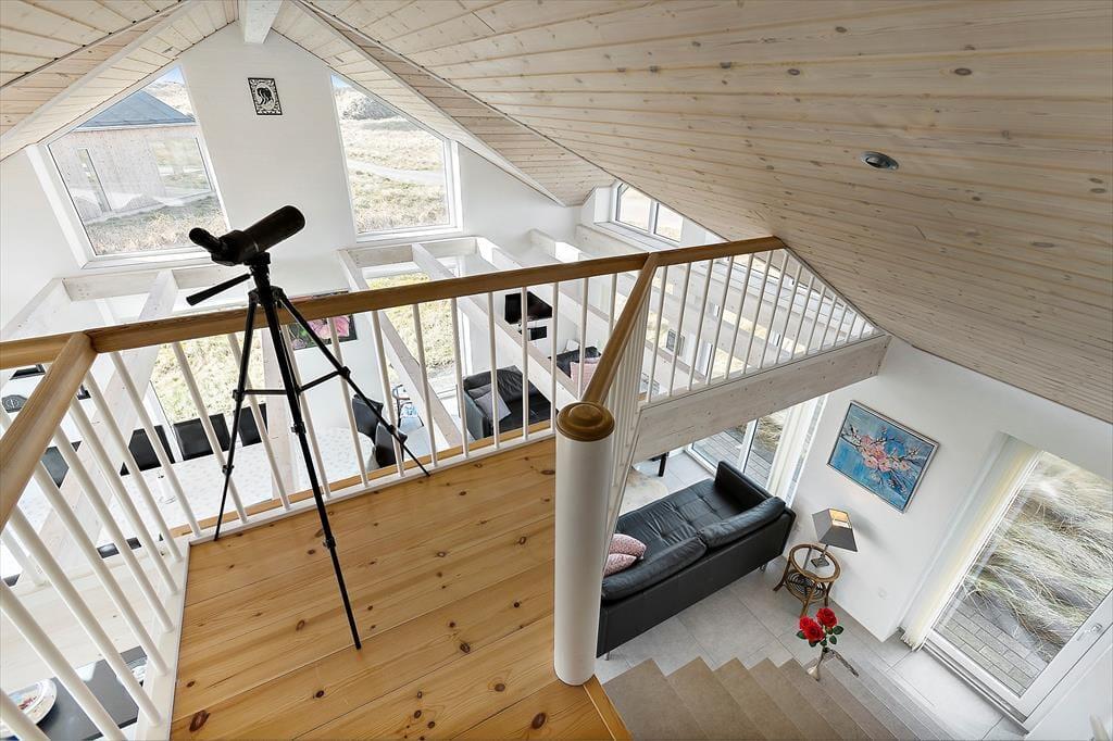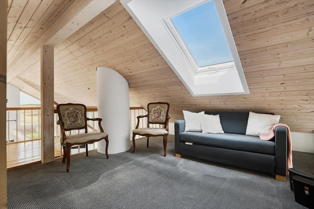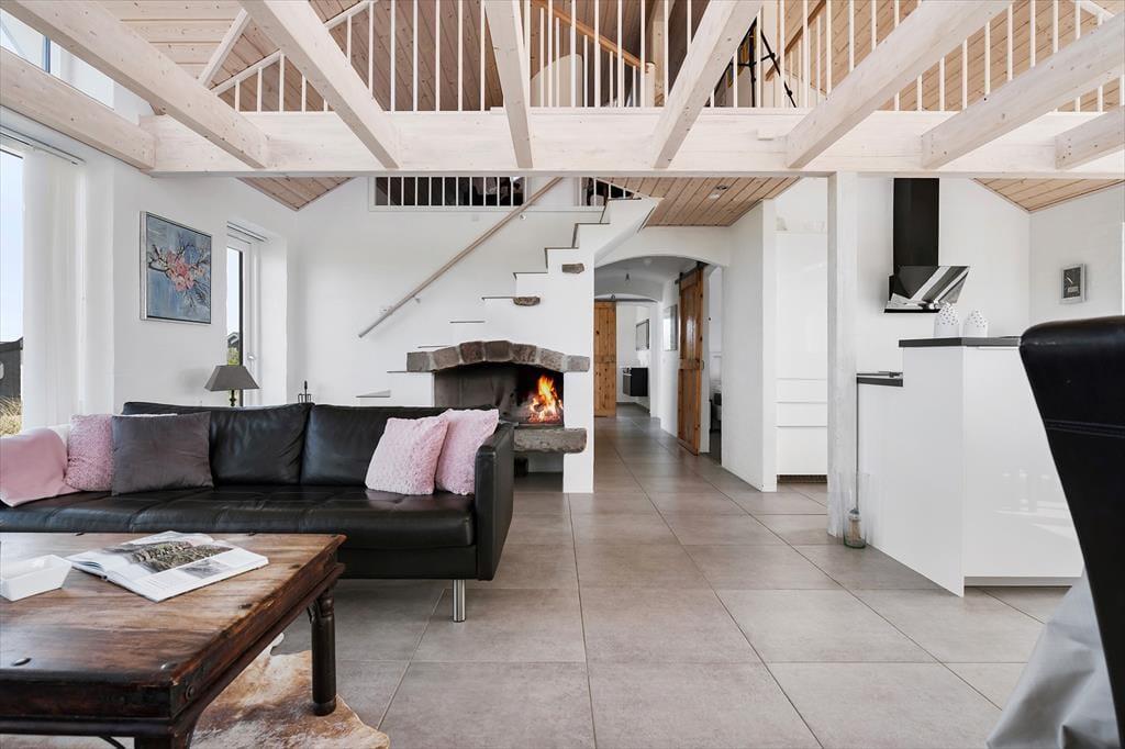 Beliggenheden i første klitrække er helt klart værd at nævne som noget af det første – men også sommerhusets lyse atmosfære og den rummelige planløsning bør fremhæves. Inden døre er der nemlig en flot loftshøjde og store vinduespartier, der inviterer solen og klitomgivelserne indenfor, og med hele 127 m2 har I masser af plads til at folde ferielivet ud. Tre soveværelser, et badeværelse og et bryggers ligger samlet i en velproportioneret afdeling, mens et fjerde soveværelse og et gæstetoilet ligger separat i et anneks med egen indgang. Sommerhusets veludstyrede køkken er integreret med en stor og stilfuld pejsestue, og herfra går der en trappe op til en stor hems, der oplagt kan bruges til en rolig læsestund, en siesta, børnenes leg eller eventuelt overnatning.