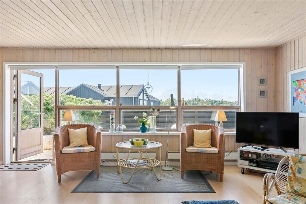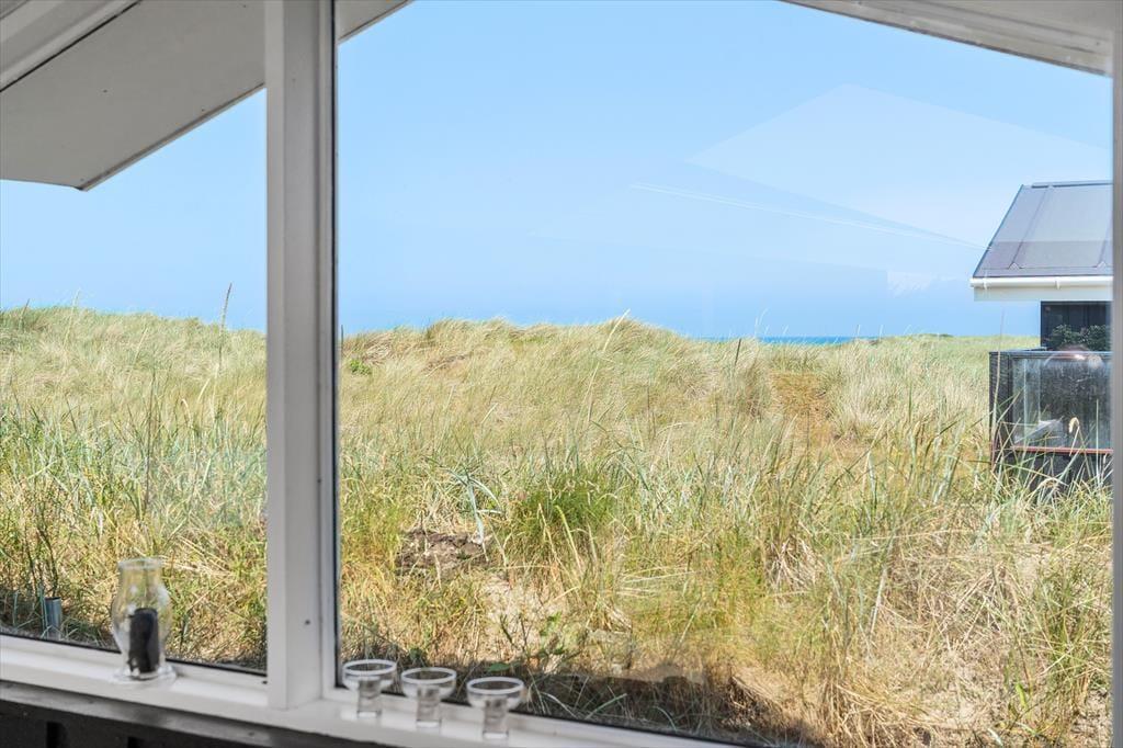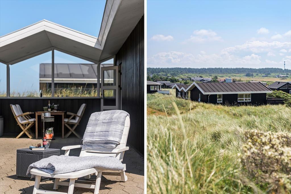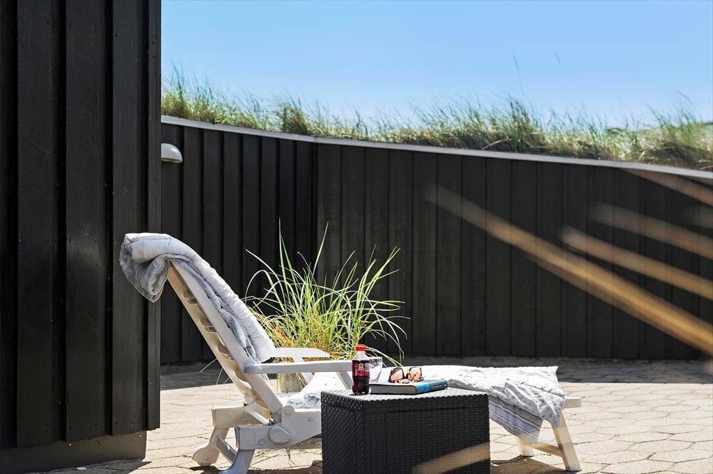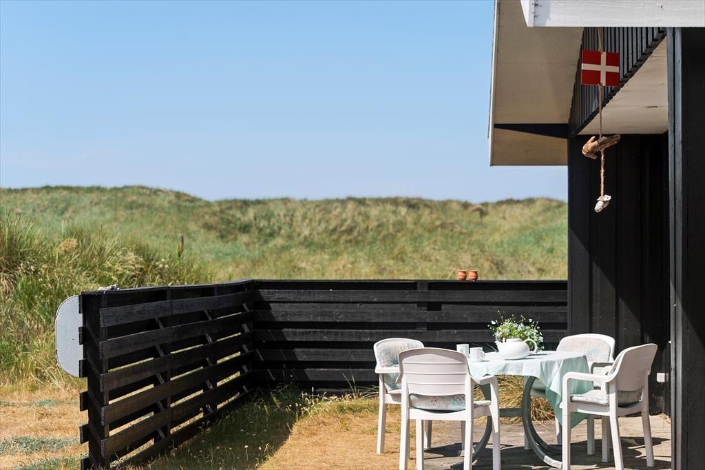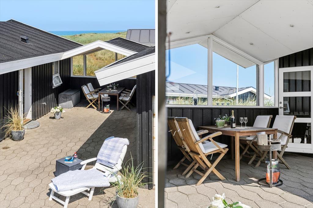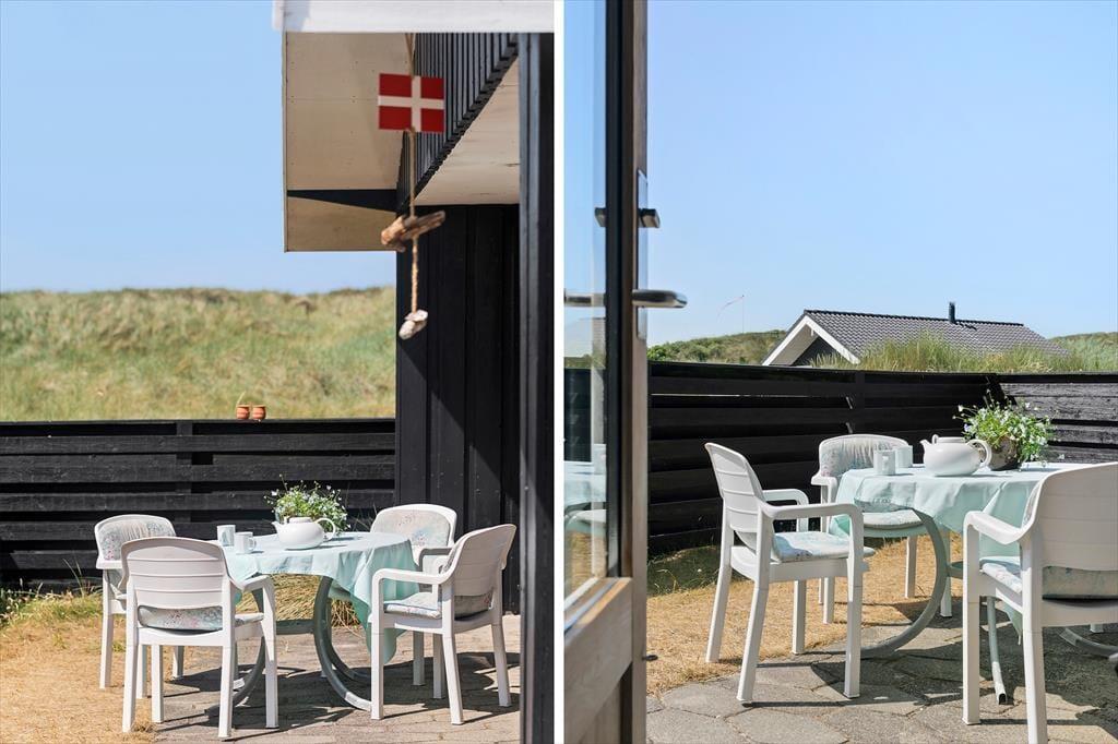 Et flisebelagt og delvist afskærmet terrassemiljø breder sig mod syd og mellem huset og annekset, så I får rig mulighed for at finde en opholdsplads med læ og sol. Fra den overdækkede terrassekrog kan I endda se havet bag klitterne, men vil I for alvor nyde havudsigten, skal I tage turen op til klitgrundens udsigtsbænk, hvorfra I har et flot panoramavue over stranden og det åbne vand.