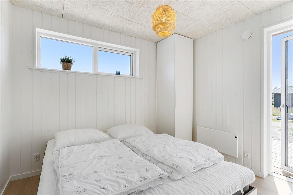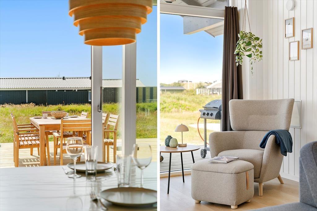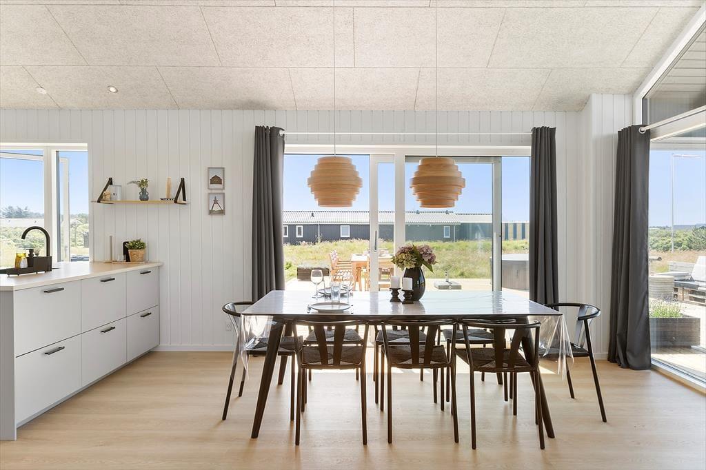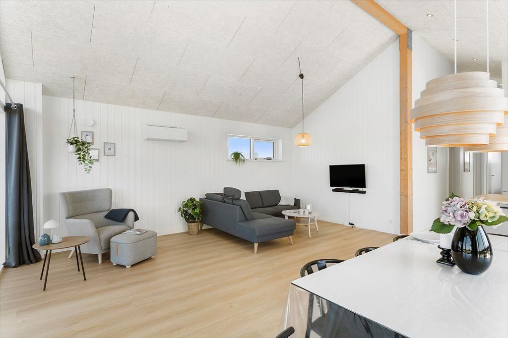 Det 105 m2 store sommerhus har en glimrende planløsning, der nemt kan rumme op til seks voksne og to børn. I den ene ende ligger soveafsnittet, der består af tre gode soveværelser og to badeværelser. Der er ikke bare en, men to hemse i huset, hvor der også er mulighed for at overnatte – og i løbet af dagen kan de sikkert blive et hit, hvis børnene vil lege eller læse lidt i fred for de voksne. Når I alle vil samles, er stuen et skønt opholdsrum. Store vinduer inviterer dagslyset indenfor, møblementet sørger for god komfort, og den åbne forbindelse til køkkenet betyder, at I sagtens kan hyggesnakke, selvom der skal skylles salat og røres i gryderne. Som man kan forvente af et nybyggeri fra 2024, er faciliteterne i orden, og der er alt, lige fra fladskærms-tv og hurtigt internet til varmepumpe med køl.