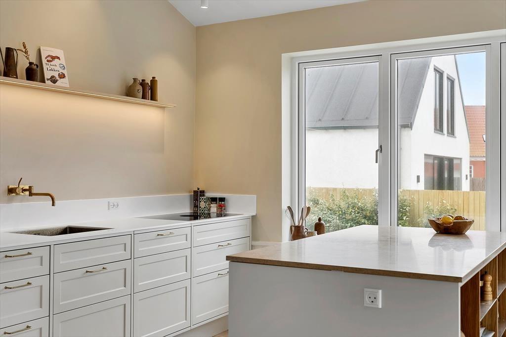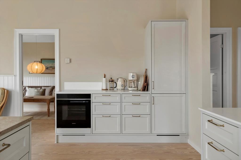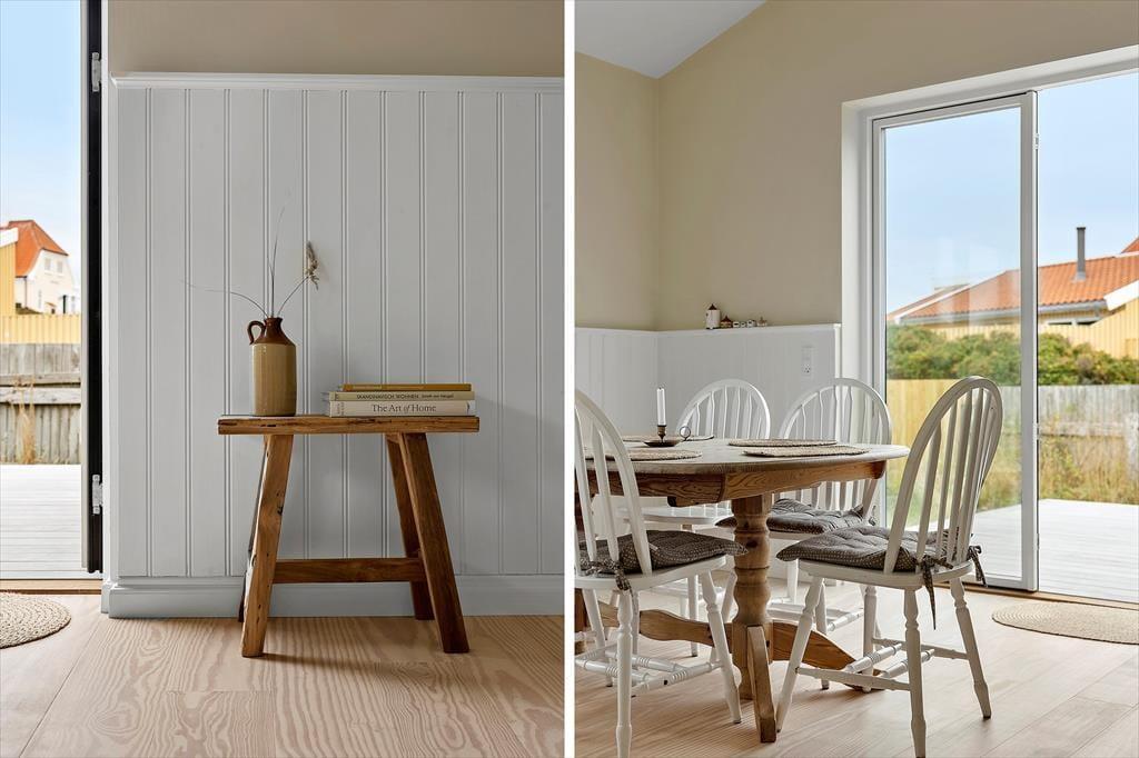 Allerede når du træder ind ad døren, mærker du den behagelige atmosfære, som huset udstråler. De lyse materialer og det gennemtænkte design gør opholdet til en fornøjelse, og overalt i huset er der gulvvarme, der sikrer komfort i alle årstider. Køkkenet ligger i åben forbindelse med stuen, hvilket giver et lyst og rummeligt opholdsmiljø, hvor feriens måltider og hyggelige stunder smelter sammen. Her kan du lave mad med lokale råvarer, mens samtalen flyder rundt om spisebordet. Når mørket falder på, inviterer brændeovnen til hygge med dens knitrende varme – perfekt til en rolig aften efter en dag fuld af oplevelser. Planløsningen rummer tre soveværelser og et badeværelse, så hele familien kan finde sig godt til rette.