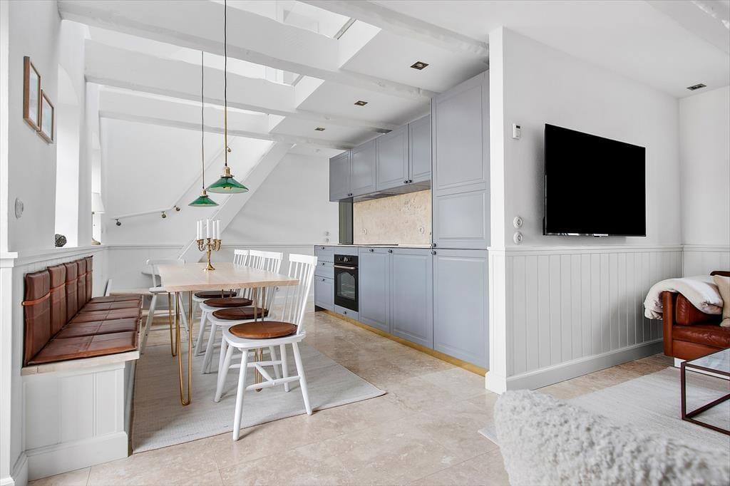 Sommerhuset er mere præcist et klassisk fiskerhus med gul facade og rødt tegltag, og allerede før, du træder indenfor, er det tydeligt at se, at ejendommen fremstår særdeles velholdt. Samme indtryk gør sig gældende inde døre, hvor et lyst og indbydende feriehjem åbenbarer sig: Alt, lige fra de smukke gulve og høje vægpaneler til det elegante køkken og den væghængte brændeovn bidrager til helhedsindtrykket, så du kan straks føle dig godt tilpas i stuen. Ikke bare her, men også på de fire soveværelser og på førstesalens gennemgangsrum minder maritime nipsgenstande og billeder dig om, at du befinder dig meget tæt på stranden – og det giver også rummene et skær af badehotel, som understreger luksusfornemmelsen af ro og hygge. Huset er godt isoleret og velegnet til udlejning hele året.