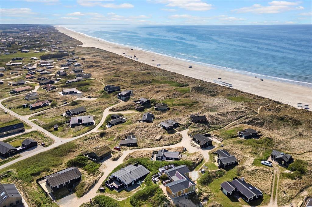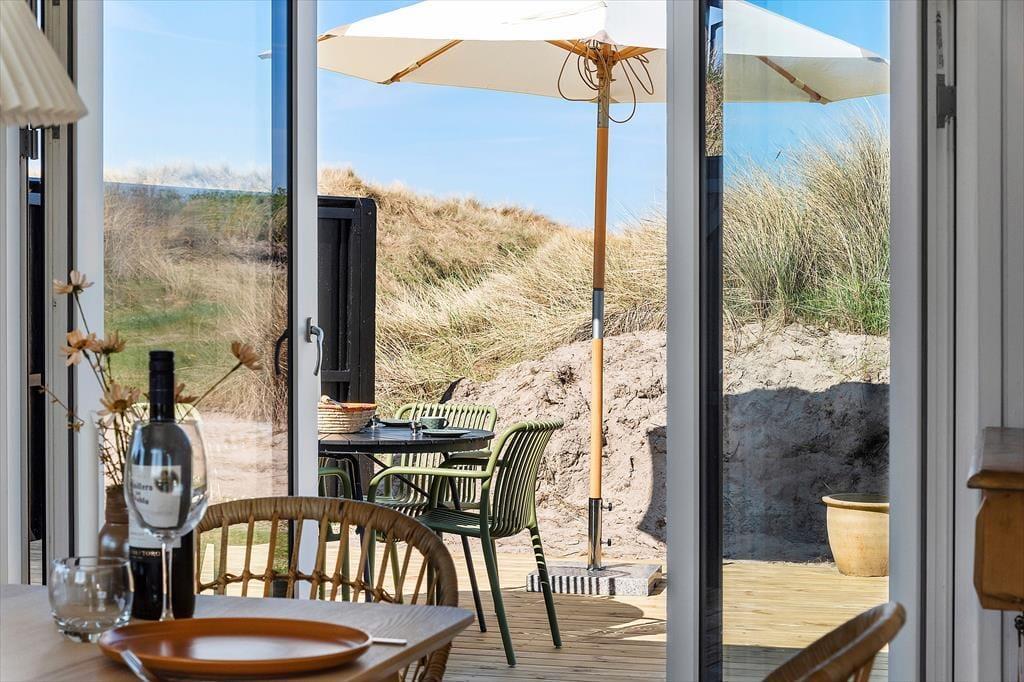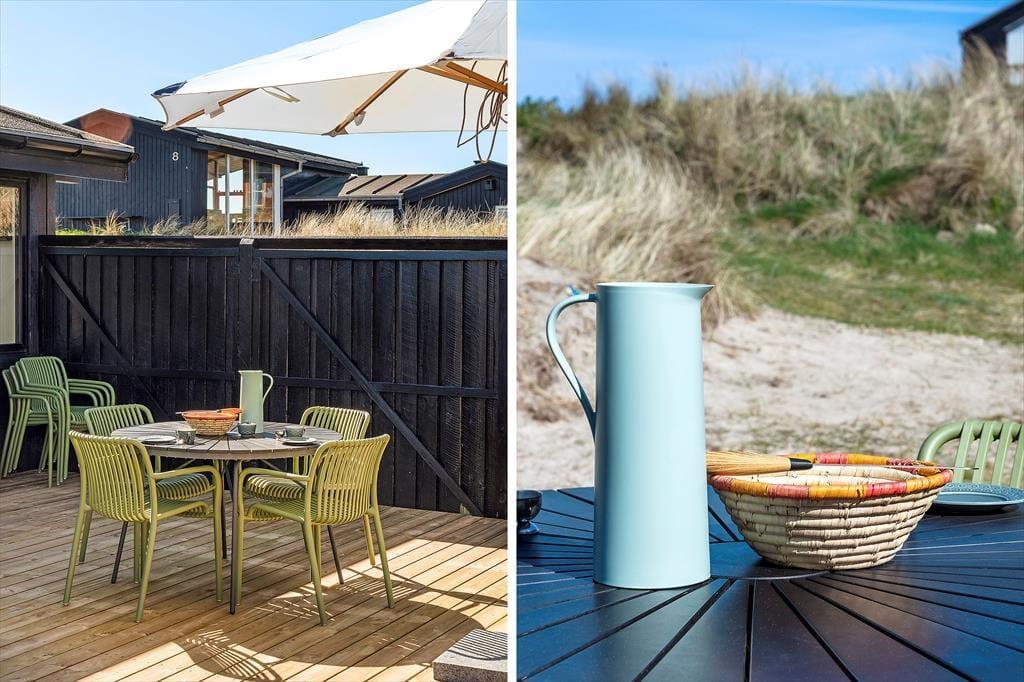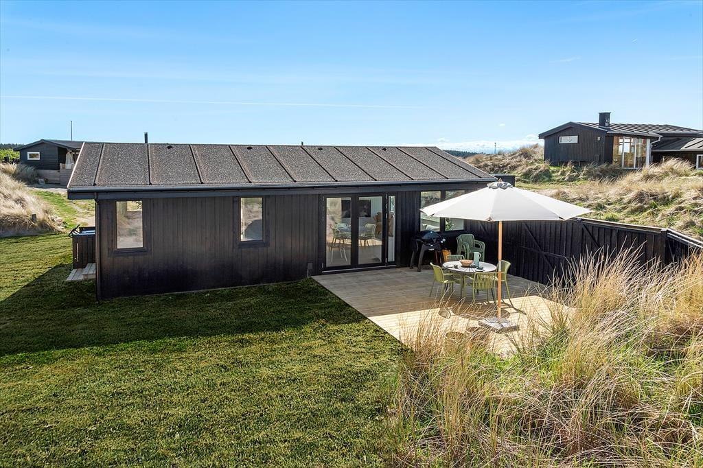 Udenfor venter en dejlig terrasse, hvor du kan tilbringe timevis med at nyde den friske luft og den hyggelige atmosfære. Den rummelige terrasse er indrettet til både afslapning og hyggelige måltider under åben himmel. Her kan du sidde med en god bog, spille kort eller grille, mens du mærker solen varme din hud. Den omkringliggende have indbyder til både afslapning og leg, og med kort afstand til stranden er det let at skifte fra solbadning til en frisk dukkert i Vesterhavet. Det er den perfekte base til at nyde både stille og aktive stunder i naturen.