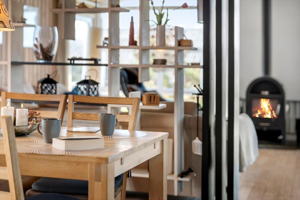Sommerhusets stue emmer af ro og hygge, og hvis du vil slappe af med en god bog, drikke kaffe med din bedre halvdel eller lægge puslespil med børnene, kan det oplagt foregå her i de stemningsfulde rammer. De komfortable sofaer og lænestole er placeret, så du kan sidde nær brændeovnen og nyde varmen og skæret fra flammerne, og spisebordet står tæt på det åbne køkken, så du ikke behøver at forlade samtalen, selvom der skal brygges mere kaffe i løbet af morgenmaden. Soveværelser er der for øvrigt tre af, og på badeværelset er der brusehjørne med massagedyser, så det daglige morgenbad kan blive ekstra luksuriøst.