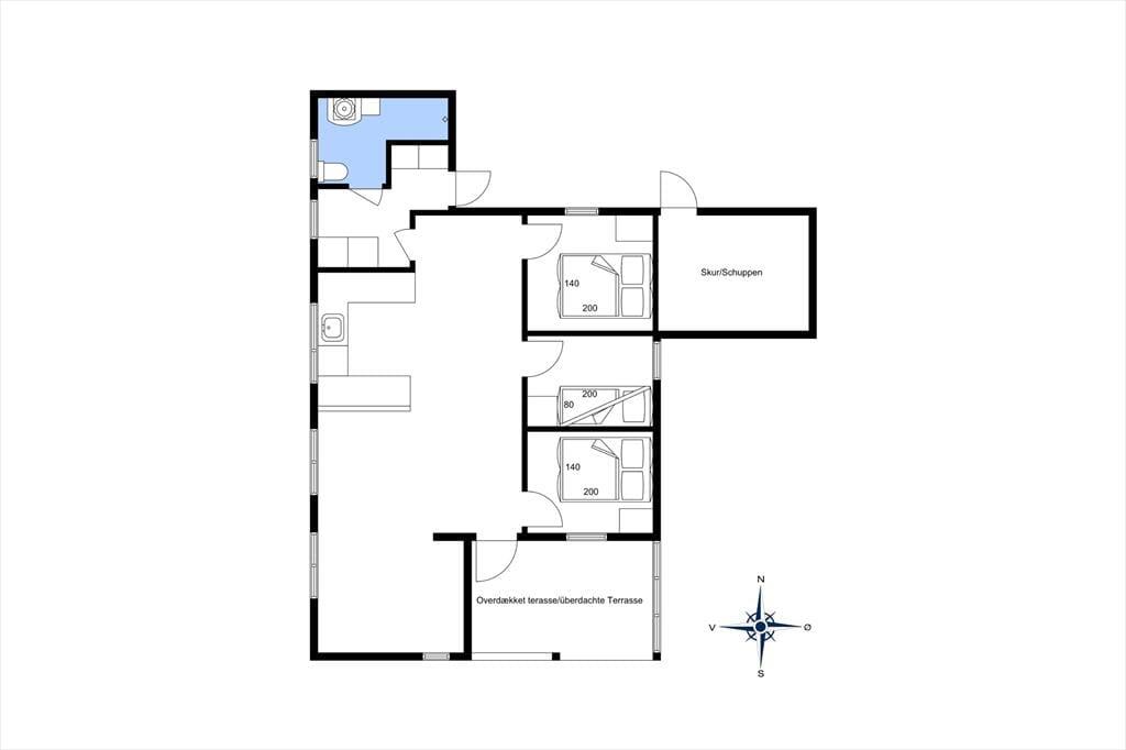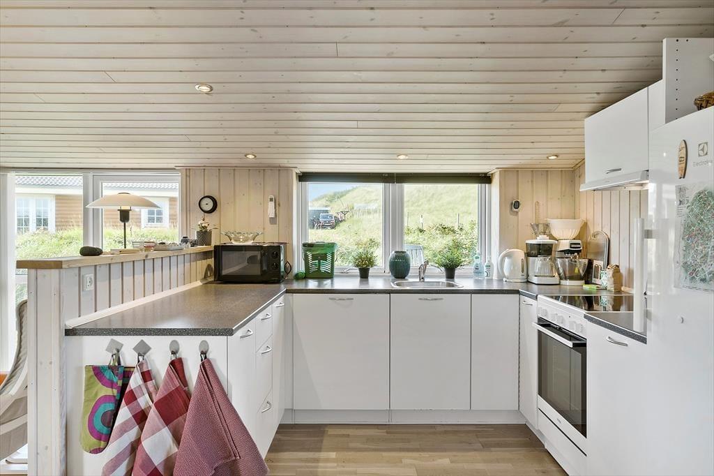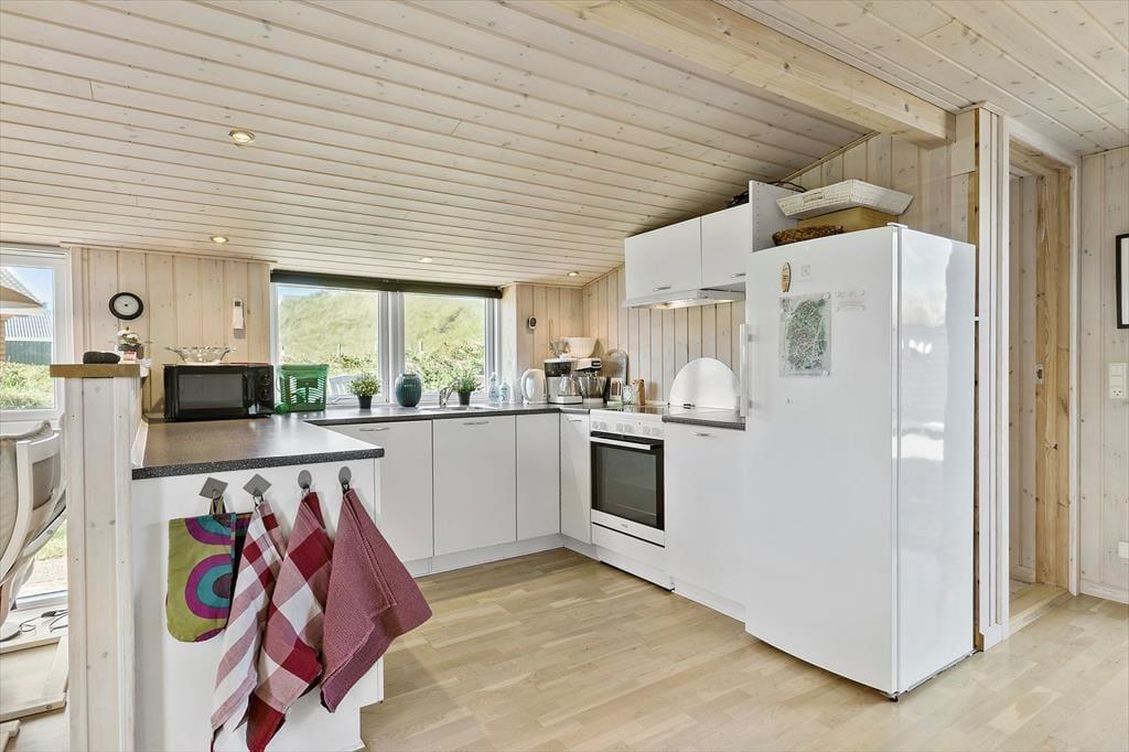 Sommerhusets rum har et lyst og indbydende indtryk – det gælder både de tre soveværelser, badeværelset og entréen, men især opholdsrummet, hvor stuen og køkkenet er forenet. En halvmur skærmer køkkenet af, så alt efter humøret kan du stå og hygge dig med madlavningen i dine egne tanker eller hyggesnakke med resten af selskabet. Spisebordet er et oplagt samlingspunkt, hvis ikke det er sofaen, der inviterer til en tilbagelænet stund med en spændende film og en stak magasiner at bladre i. Og hvis solskinnet ser alt for tillokkende ud, kan du i stedet åbne terrassedøren og flytte driverlivet ud i det fri.