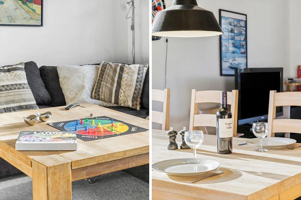 Fra det øjeblik du træder indenfor i dette hyggelige byhus, vil du mærke den varme og indbydende atmosfære. Huset byder på tre dejlige værelser og to badeværelser, hvoraf det ene er nyrenoveret og indrettet med sans for detaljer. Det veludstyrede køkken inviterer til fælles madlavning med lokale råvarer, mens den store stue er det oplagte samlingspunkt. Her kan I udfordre hinanden i bordtennis, pool eller bordfodbold og skabe mange sjove stunder sammen. De store vinduespartier sikrer et skønt lysindfald, som fylder rummene med liv og energi dagen igennem, og når mørket falder på, kan I slappe af i de bløde sofaer og planlægge næste dags eventyr.
