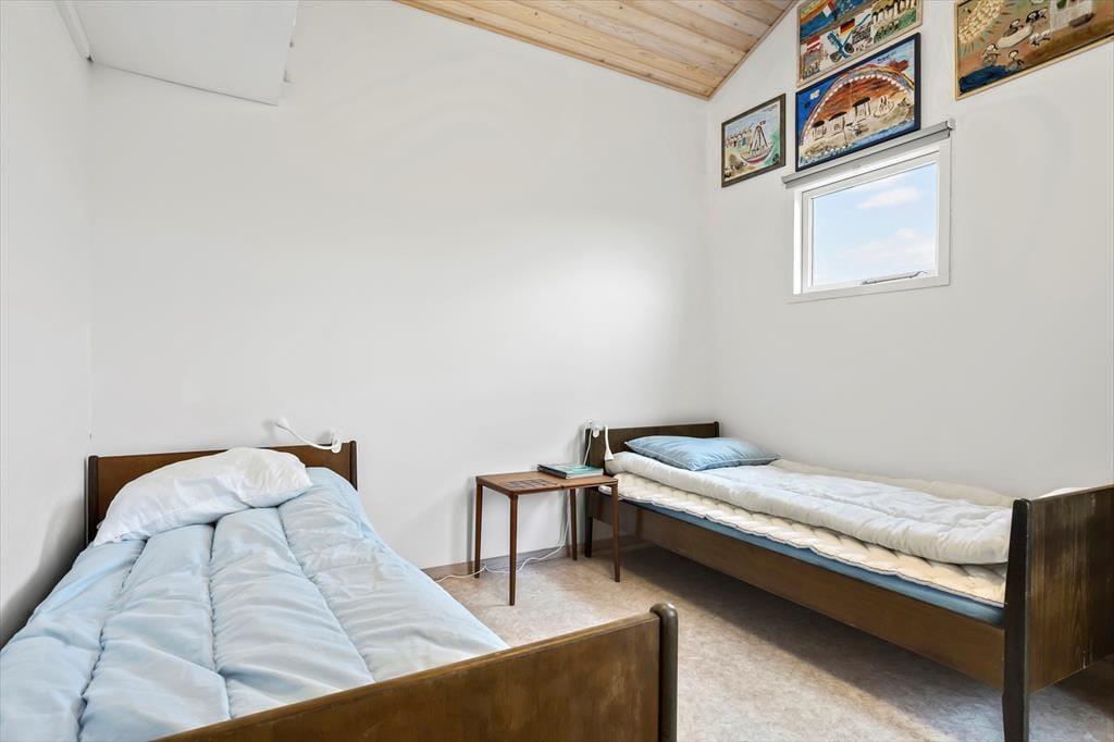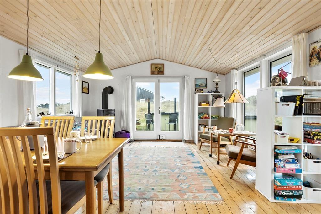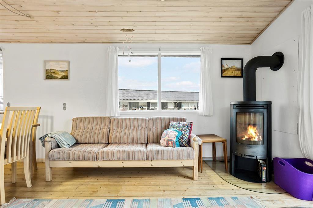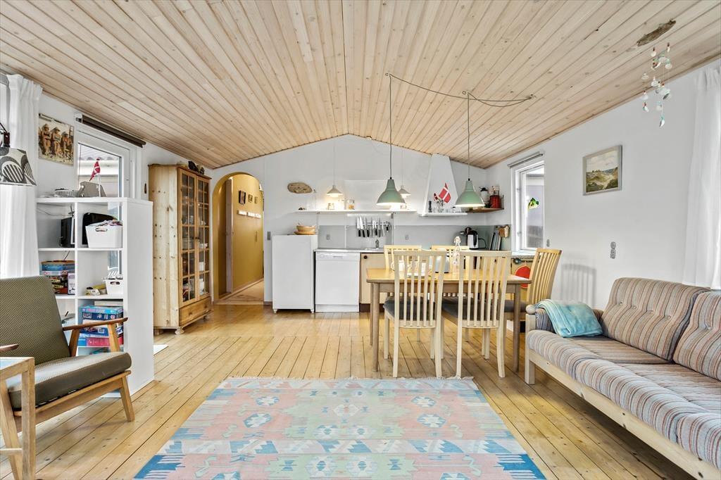Indenfor i sommerhuset mødes du af en lys og indbydende atmosfære, hvor de store vinduespartier lader dagslyset strømme ind i rummene. Køkkenet er i åben forbindelse med stuen, hvilket skaber et socialt opholdsmiljø, hvor hele familien kan samles. Mens maden tilberedes, kan du nyde udsigten til de naturskønne omgivelser, og når aftenen falder på, indbyder brændeovnen i stuen til hyggelige stunder med varme og ro. Sommerhuset har tre gode soveværelser og et badeværelse, der tilsammen giver perfekte rammer til en afslappende ferie.