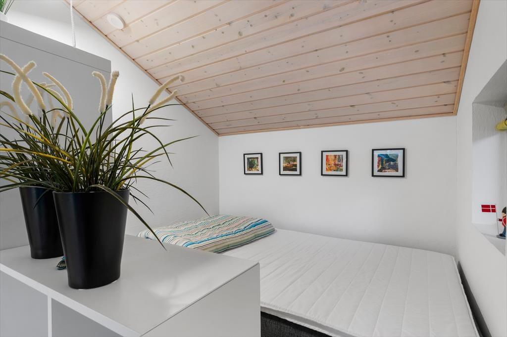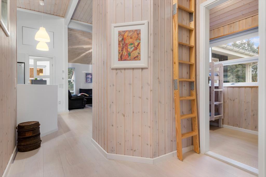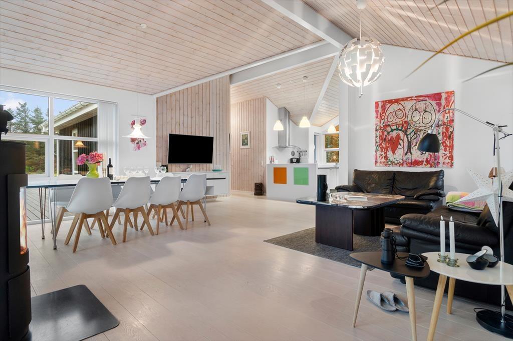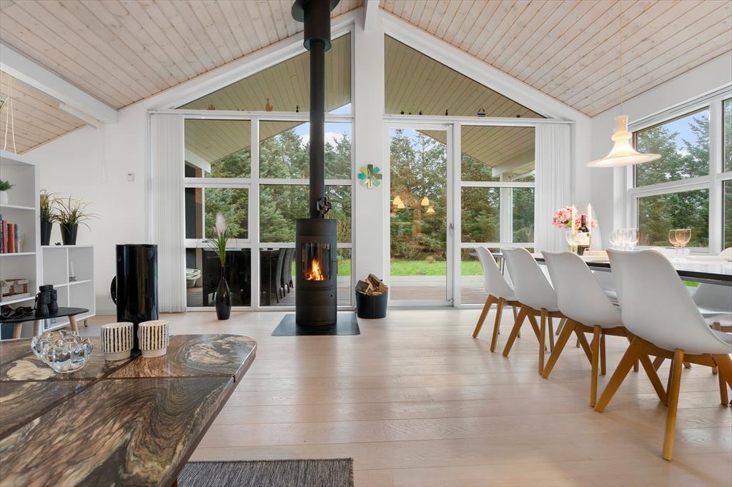 Når du træder indenfor i dette lyse sommerhus, bliver du mødt af et dejligt lysindfald fra de store vinduespartier, som giver rummene en åben og luftig atmosfære. Loftet går til kip, hvilket skaber en ekstra følelse af rummelighed og åbner op for den fine udsigt til naturen udenfor. Stuen og køkkenet er i åben forbindelse, hvilket giver den perfekte ramme for samvær med familie og venner. I stuen kan du slappe af foran den hyggelige brændeovn, der skaber varme og hygge på de køligere aftener. Sommerhuset har i alt fire soveværelser, samt en alkove i stuen så der er plads til hele familien eller en gruppe venner. Med to badeværelser, hvoraf det ene har et luksuriøst spabad, får du den perfekte mulighed for at forkæle dig selv efter en lang dag ved stranden.