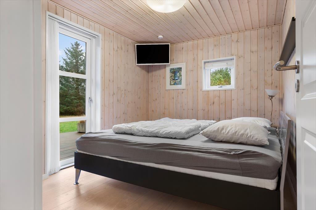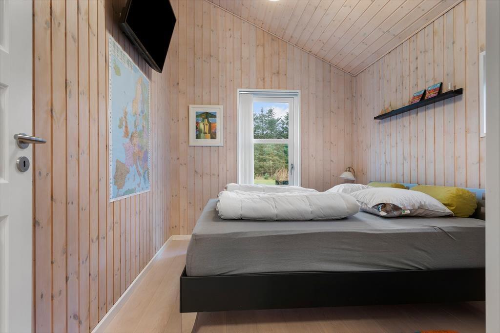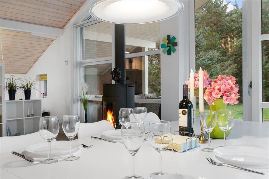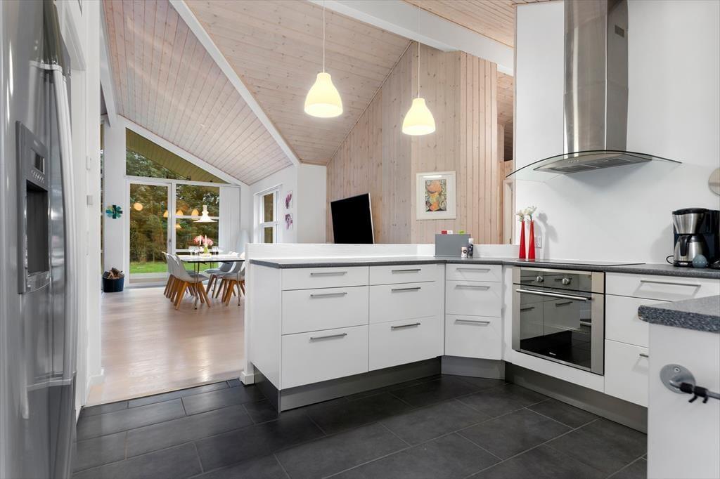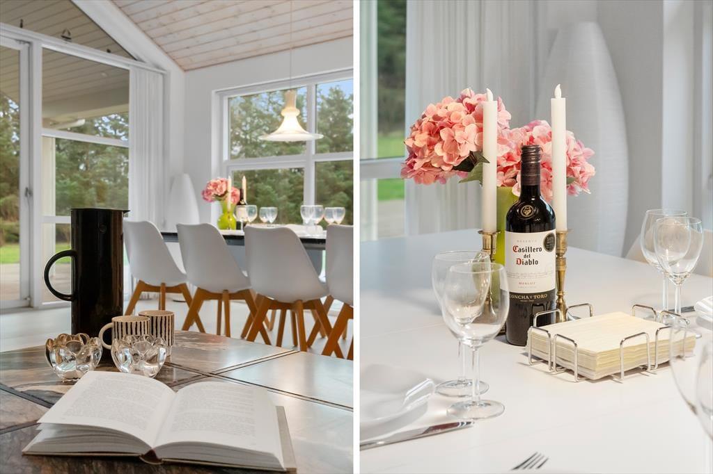 Når du træder indenfor i dette lyse sommerhus, bliver du mødt af et dejligt lysindfald fra de store vinduespartier, som giver rummene en åben og luftig atmosfære. Loftet går til kip, hvilket skaber en ekstra følelse af rummelighed og åbner op for den fine udsigt til naturen udenfor. Stuen og køkkenet er i åben forbindelse, hvilket giver den perfekte ramme for samvær med familie og venner. I stuen kan du slappe af foran den hyggelige brændeovn, der skaber varme og hygge på de køligere aftener. Sommerhuset har i alt fire soveværelser, samt en alkove i stuen så der er plads til hele familien eller en gruppe venner. Med to badeværelser, hvoraf det ene har et luksuriøst spabad, får du den perfekte mulighed for at forkæle dig selv efter en lang dag ved stranden.