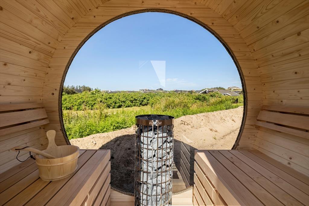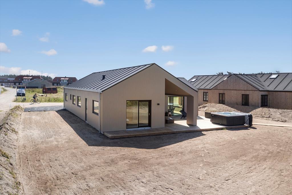 Den store terrasse er en af husets absolutte højdepunkter, hvor du kan nyde solen hele dagen. Uanset om du slapper af på den overdækkede del af terrassen eller søger solen på den åbne del, er det den perfekte base til at nyde de varme sommeraftener. Børnene kan lege på græsplænen, mens du tilbereder lækre måltider på grillen, og når mørket falder på, er der intet bedre end at samles om et glas vin under stjernerne, hvor det udendørs spabad også kan benyttes. Med terrassen tæt på huset er det let at få den bedste udsigt og samtidig være tæt på den indbydende bolig.