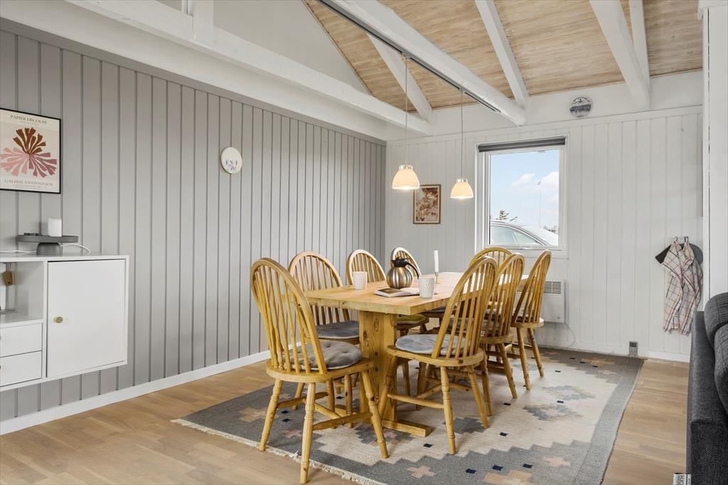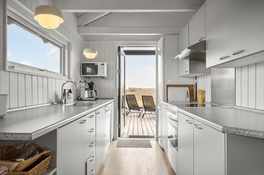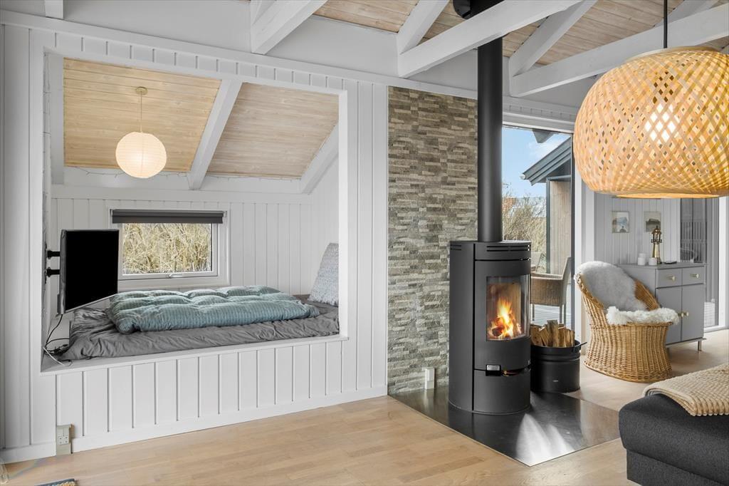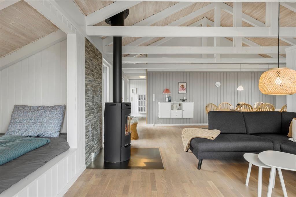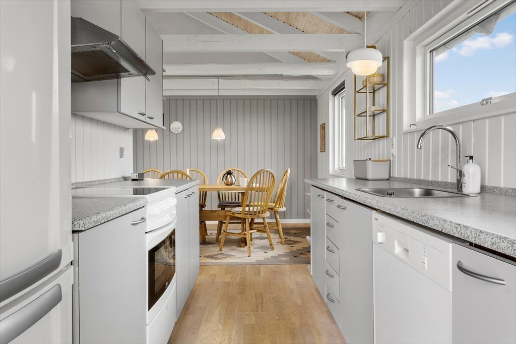 Indenfor byder sommerhuset på en lys og hyggelig indretning, hvor stemningen er afslappet og præget af klassisk dansk sommerhushygge. Her finder du alt, hvad du skal bruge for at koble af – og måske allervigtigst: plads til nærvær. Den åbne opholdsafdeling binder stue og køkken sammen, så madlavning og hyggestunder går hånd i hånd. Når duften af frisklavet kaffe spreder sig, og børnene lægger puslespil ved spisebordet, forstår man hurtigt, hvorfor dette sted er så særligt. Brændeovnen bidrager med varme og charme og sætter den helt rette stemning, når mørket falder på. Huset blev renoveret i 2022, så her er moderne komfort kombineret med autentisk sommerhusstemning.