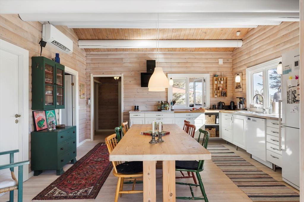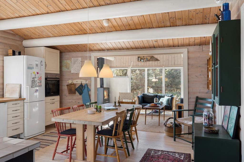 Når du træder ind i sommerhuset på Agathevej 1, mærker du straks den rolige og varme atmosfære, som kun et rigtigt sommerhus kan give. De lyse rum og den hyggelige indretning med fine detaljer og klassiske trægulve skaber en stemning, hvor skuldrene sænker sig helt automatisk. Den åbne forbindelse mellem køkken og stue lægger op til socialt samvær, og her er det nemt at samles om feriens måltider eller slappe af med kortspil og god snak. Midt i rummet står brændeovnen og knitrer – det naturlige samlingspunkt efter en lang dag ved stranden. Uanset om du besøger huset sommer eller vinter, byder det på masser af hjerterum og hjemlig hygge.