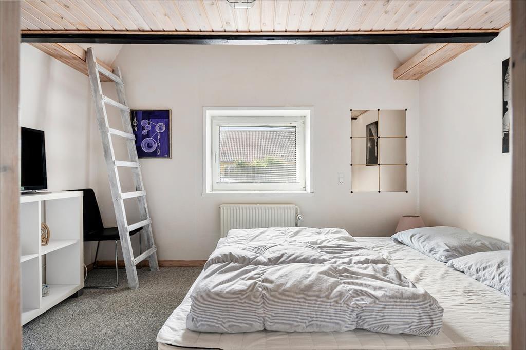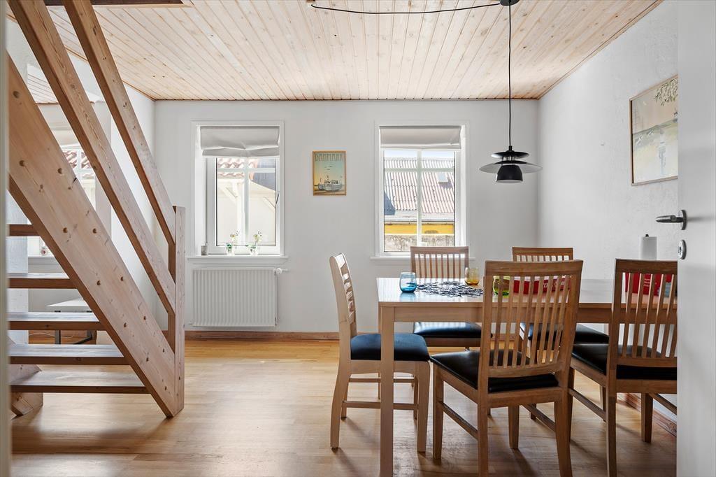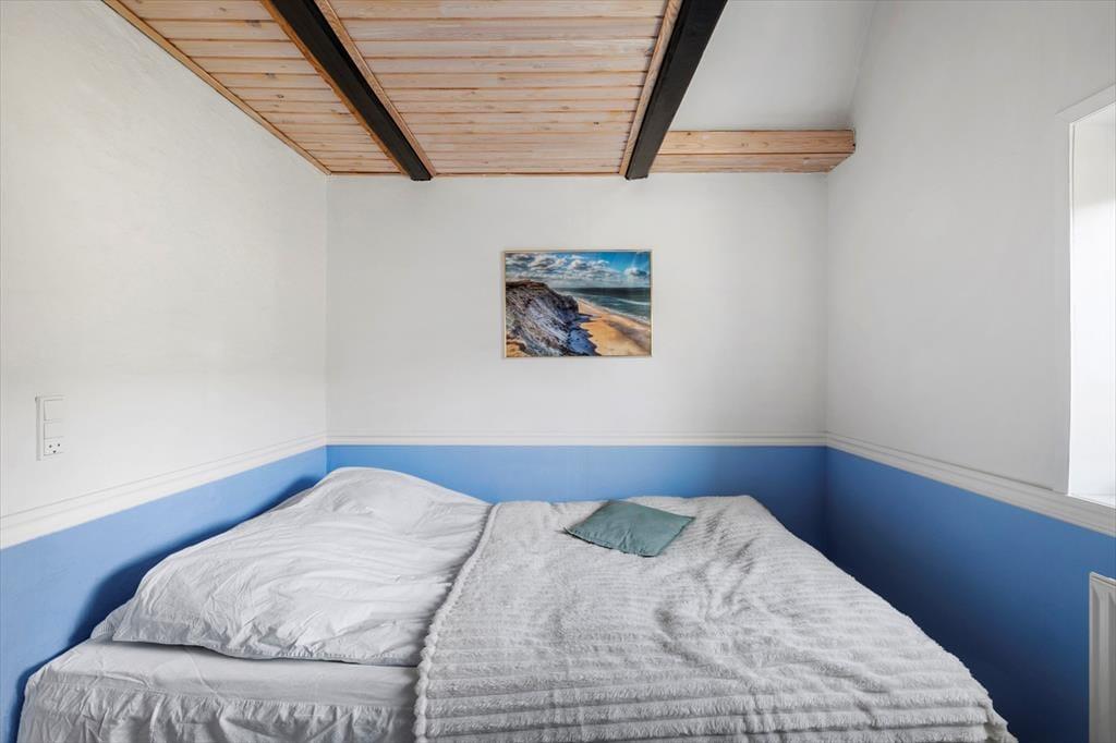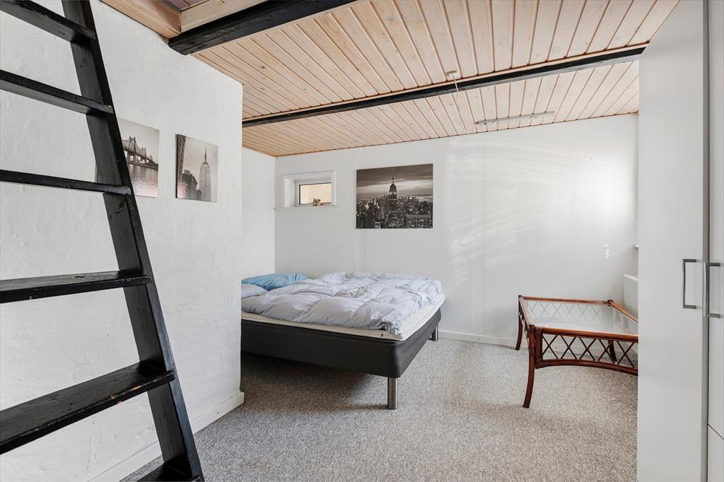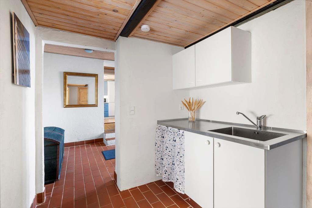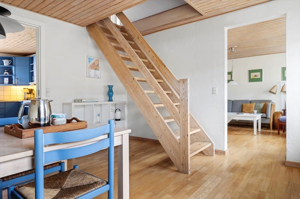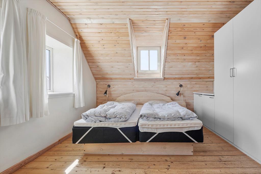 Byhuset fremstår utroligt pænt og velholdt. Stuehuset er blevet integreret med et tidligere udhus, og ved den rummelige indgang finder man et bryggers, et badeværelse og to soveværelser. Begge værelser er indrettet med dobbeltseng, og fra hvert soveværelse er der adgang til en stige, som fører op til en hems med yderligere sovepladser. Denne indretning gør huset særdeles velegnet til to familier eller børnefamilier. Til højre for indgangen ligger en gang med adgang til et gæstetoilet, og herfra går man videre ind i det rummelige og lyse køkken. Fra køkkenet er der adgang til en spiseafdeling, hvor en bred trappe fører op til første sal. Her finder man et stort soveværelse med dobbeltseng samt et stort badeværelse.