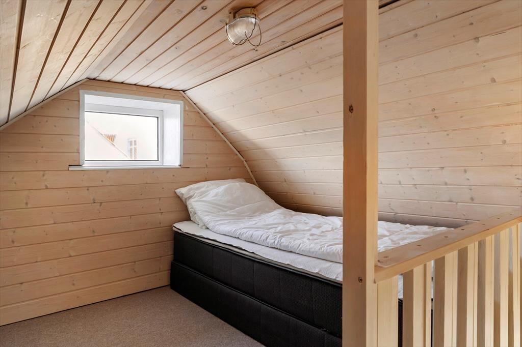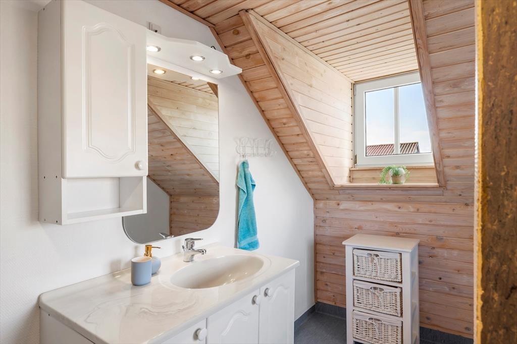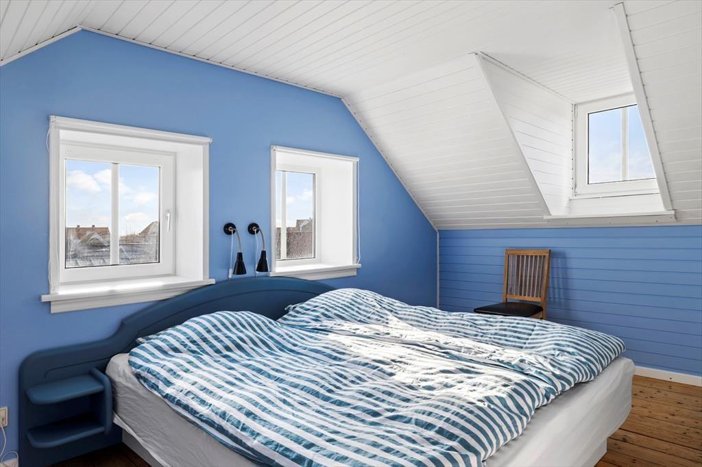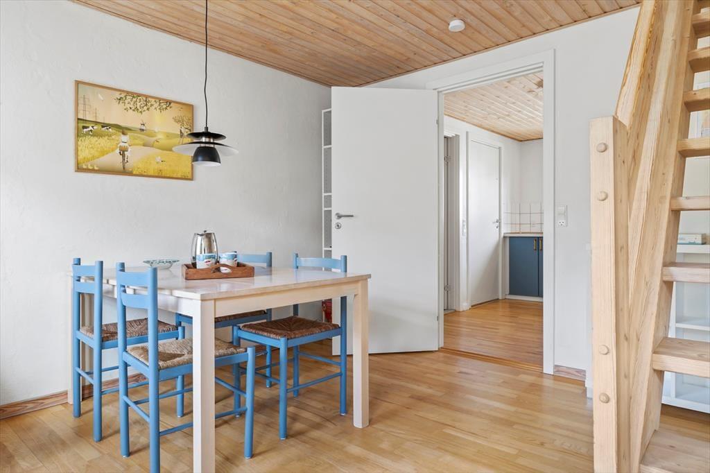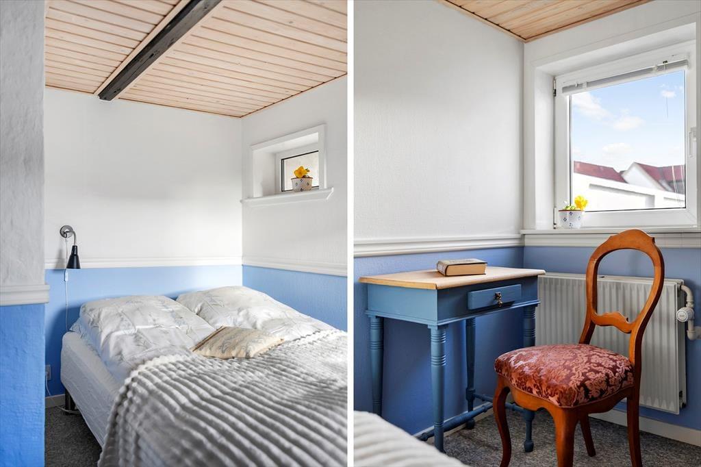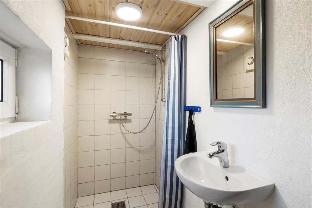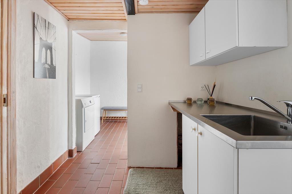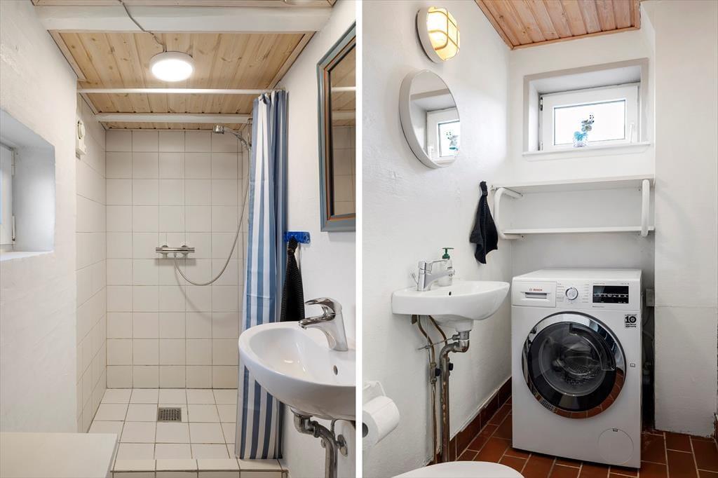 Byhuset fremstår utroligt pænt og velholdt. Stuehuset er blevet integreret med et tidligere udhus, og ved den rummelige indgang finder man et bryggers, et badeværelse og to soveværelser. Begge værelser er indrettet med dobbeltseng, og fra hvert soveværelse er der adgang til en stige, som fører op til en hems med yderligere sovepladser. Denne indretning gør huset særdeles velegnet til to familier eller børnefamilier. Til højre for indgangen ligger en gang med adgang til et gæstetoilet, og herfra går man videre ind i det rummelige og lyse køkken. Fra køkkenet er der adgang til en spiseafdeling, hvor en bred trappe fører op til første sal. Her finder man et stort soveværelse med dobbeltseng samt et stort badeværelse.