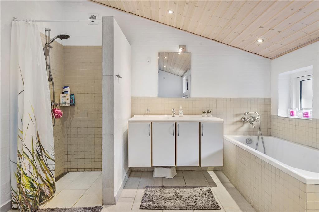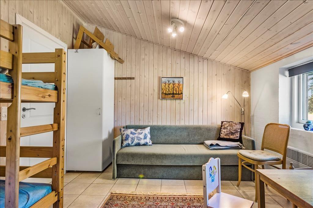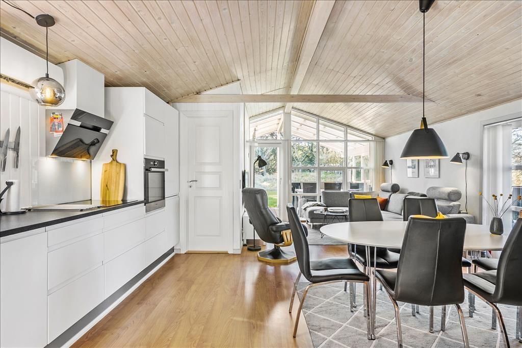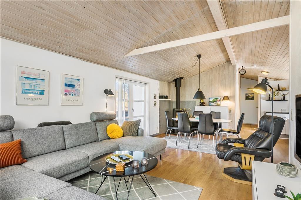 Huset er pænt vedligeholdt og fremstår i dag i god kvalitet med alle nødvendige og moderne faciliteter, fra opvaskemaskine, vaskemaskine og tørretumbler til gratis og trådløst internet, som især de lidt større børn vil sætte pris på. Det store og åbne opholdsrum, som består af køkken, spiseafdeling og stue, vil hurtigt blive det centrale rum, hvor familien mødes til hygge og samvær; måske med ild i brændeovnen, hvis man holder ferie udenfor sæsonen. I stuen er store panoramavinduer og en stor dobbelt terrassedør, som tilsammen lukker dejligt meget lys ind i rummet, og med ejernes sans for fine detaljer i indretningen, hersker her en rar og varm stemning. Udover to værelser med hhv. dobbeltseng og to enkeltsenge, råder huset over en ny tilbygning med et stort børneværelse med køjeseng og legetøj og et flot badeværelse med både bruseniche og badekar. I denne nye afdeling er indrettet med brede døre og god plads til at lege på gulvet og til at komme rundt; rigtig børnevenligt og funktionelt!