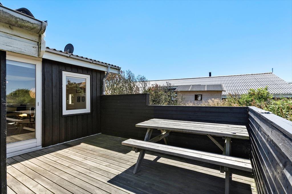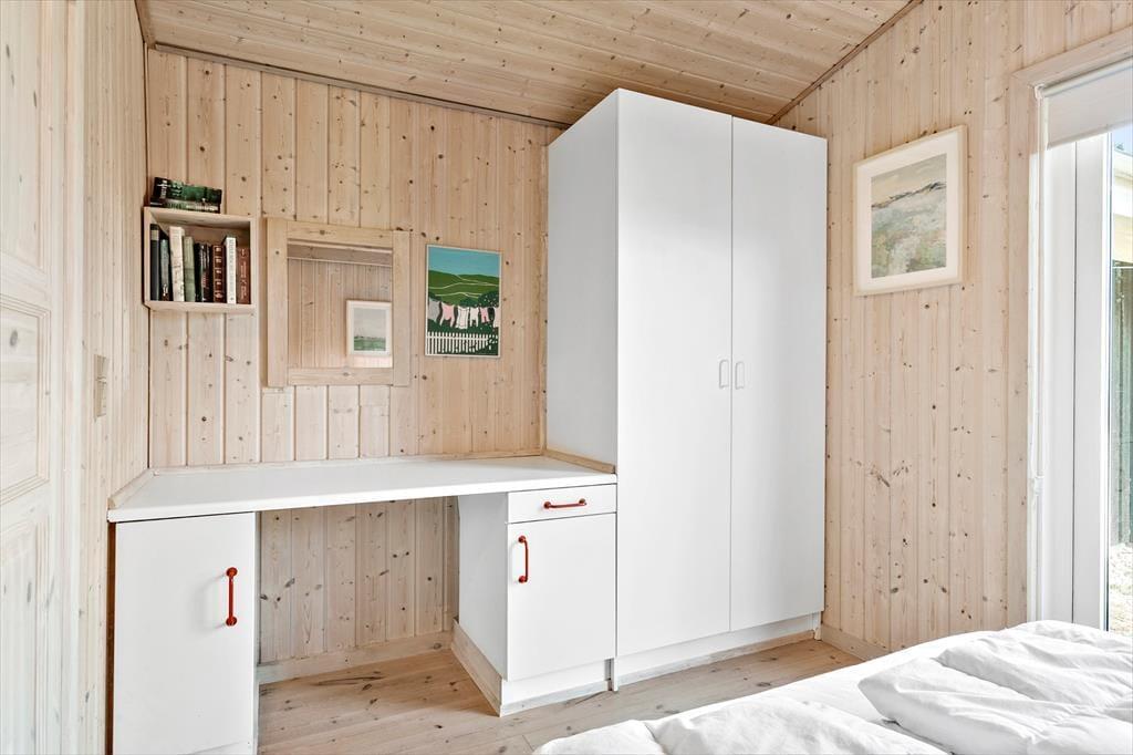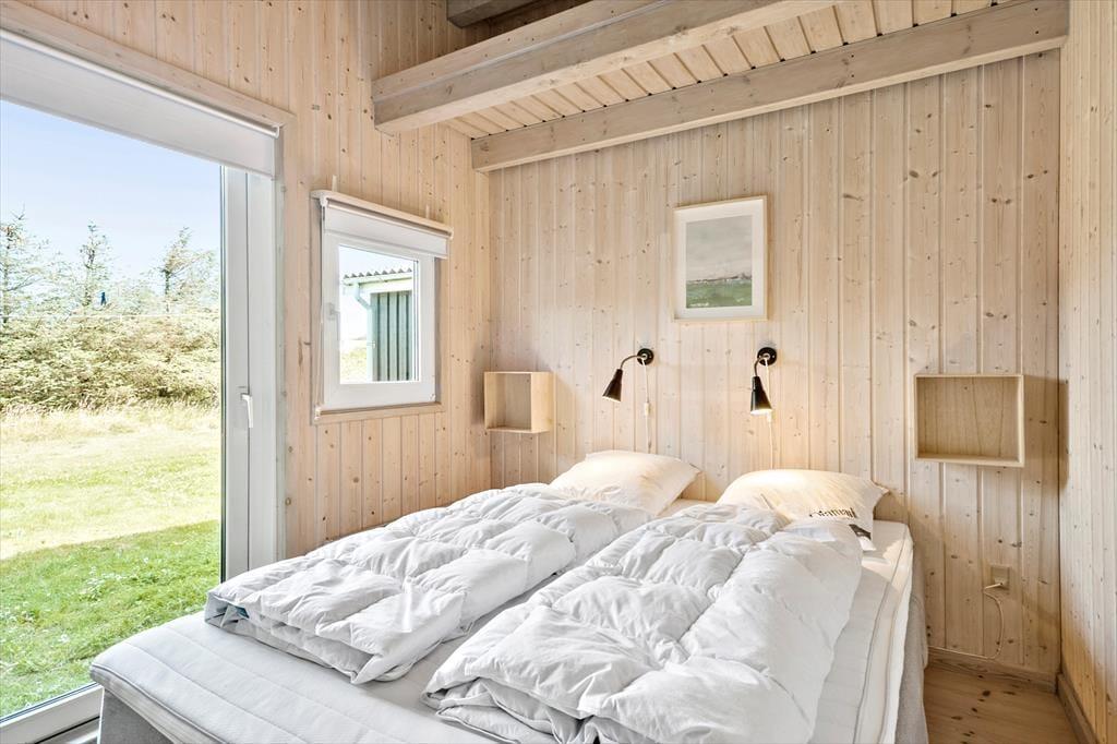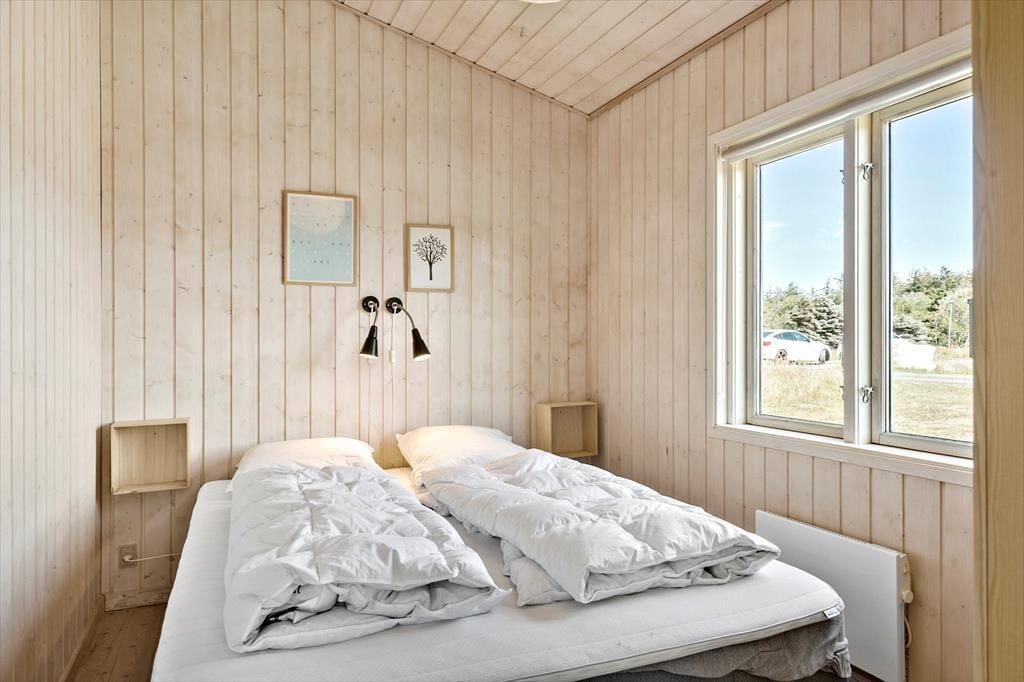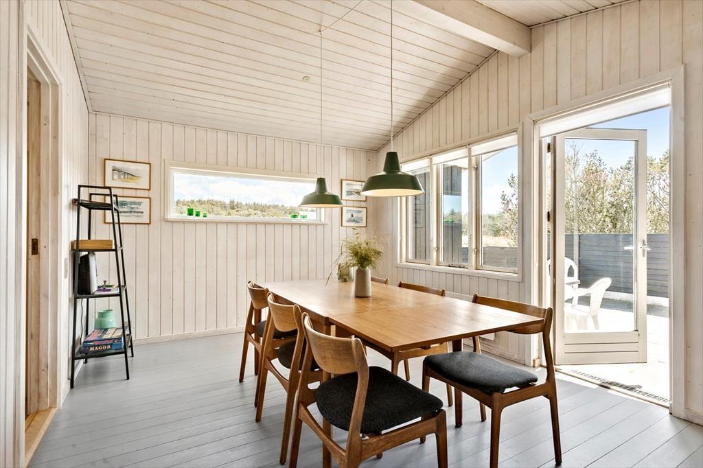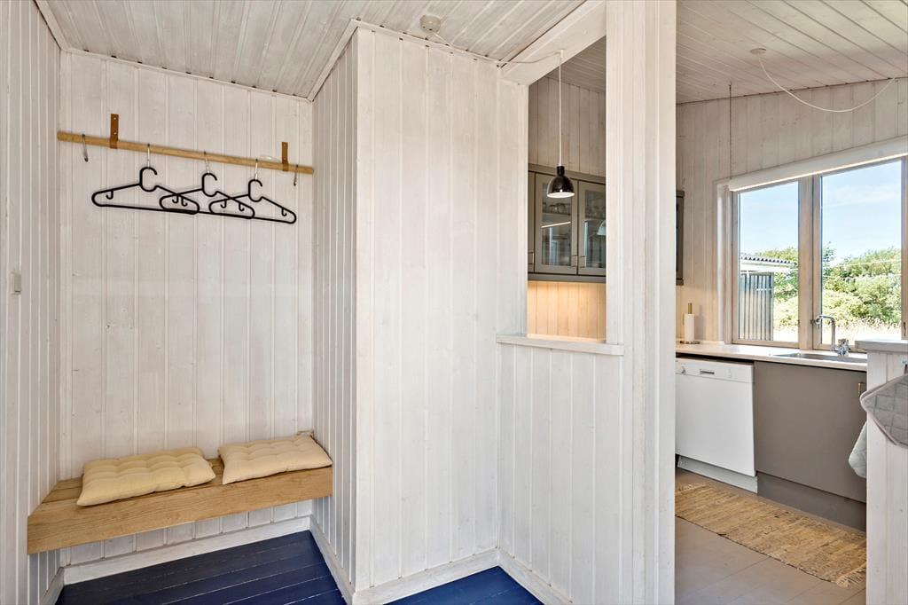 Sommerhuset er funktionelt indrettet med værelser fordelt på en måde, så to familier sagtens kan være i sommerhuset sammen og alligevel have lidt privatliv, eller man kan vælge, at lave en børne - og voksen afdeling, da værelserne er fordelt i begge ender af sommerhuset. Fra entreen kan man gå til højre ind i køkken og spiseafdelingen eller til venstre, hvor den hyggelige stue med udgang til den store terrasse er. Sommerhuset råder over et dejligt stort badeværelse med bl.a. vaskemaskine, hvilket er meget praktisk, når man bor så tæt på Vesterhavet og med garanti kommer til at bruge meget badetøj og mange håndklæder til badeturene i det friske vesterhav.
