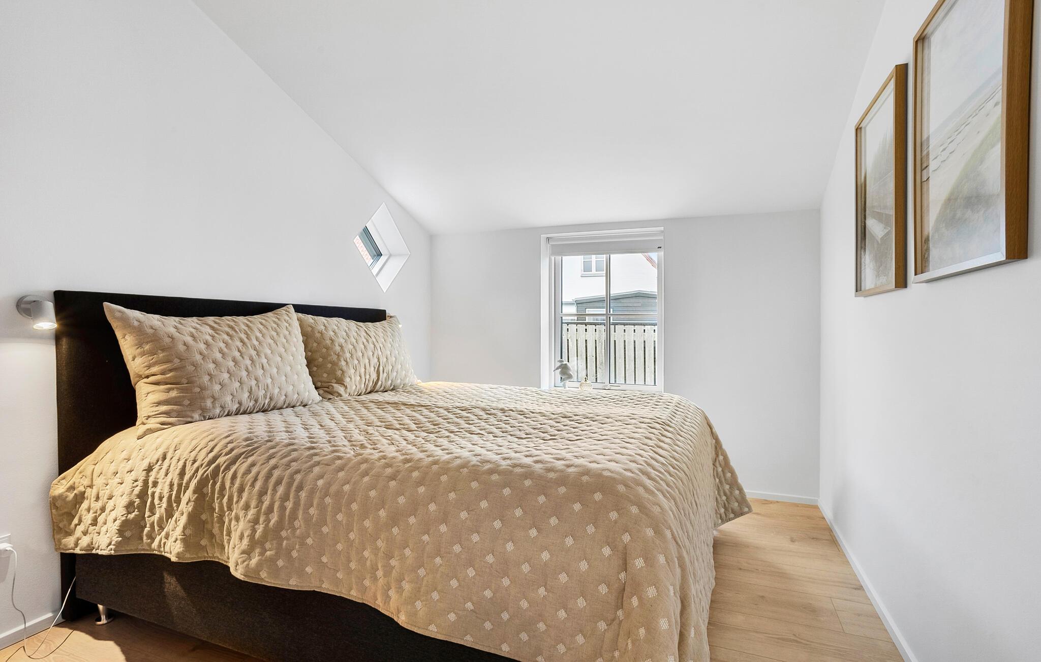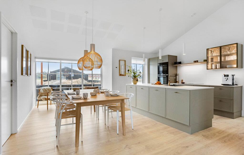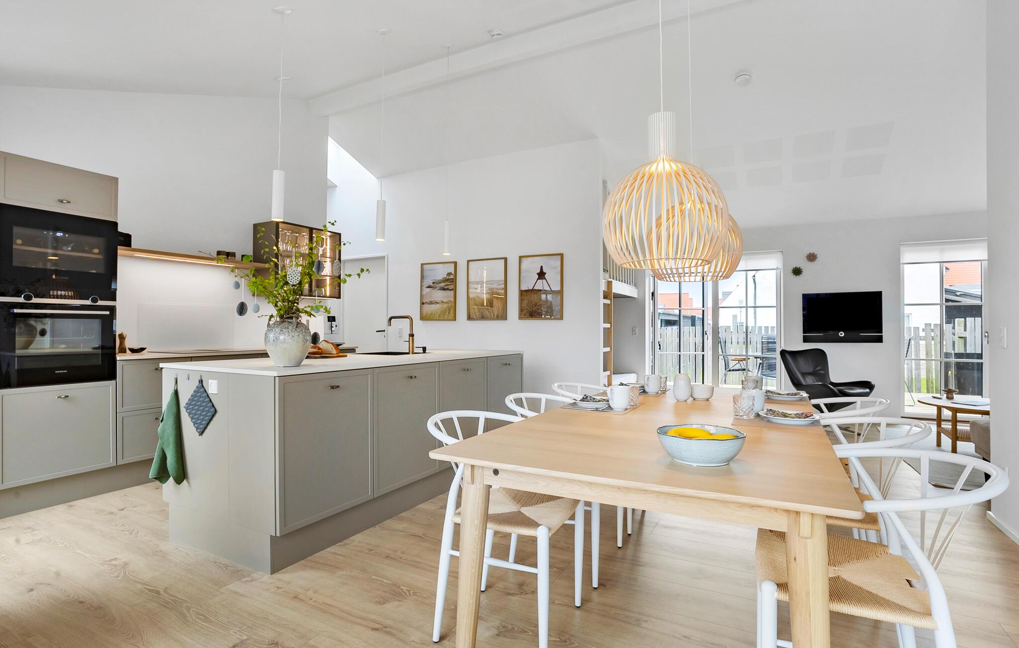 Dette moderne feriehus ligger i et roligt kvarter, kun få minutters gang fra Løkkens bymidte og den populære sandstrand. Her er der gode rammer til en børnefamilie eller to par og giver jer en skøn base i smukke omgivelser. Træd ind i den rummelige opholds- og spisestue, som får masser af lys ind gennem de store vinduespartier. Læn jer tilbage i den behagelige sofa eller planlæg feriedagen over en sen morgenmad ved spisebordet. Det åbne køkken med kogeø har lækre kvalitetsløsninger og masser af plads til at lave mad sammen. En fin detalje er den integrerede hems i stuen, som er et hyggeligt tilflugtssted for børn og voksne.