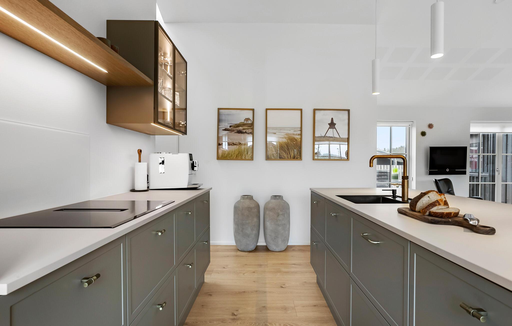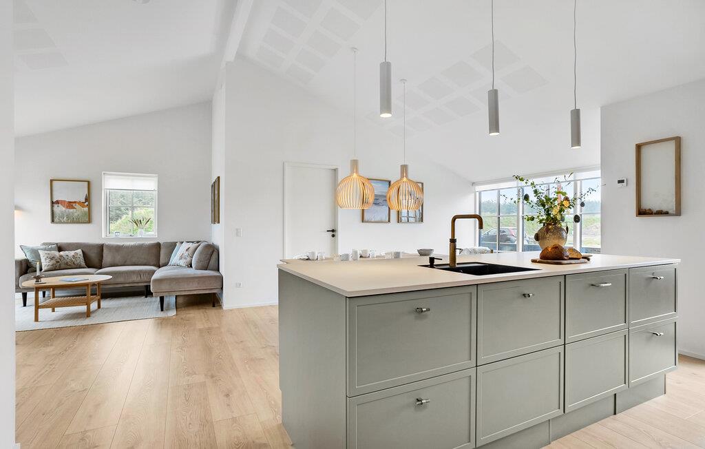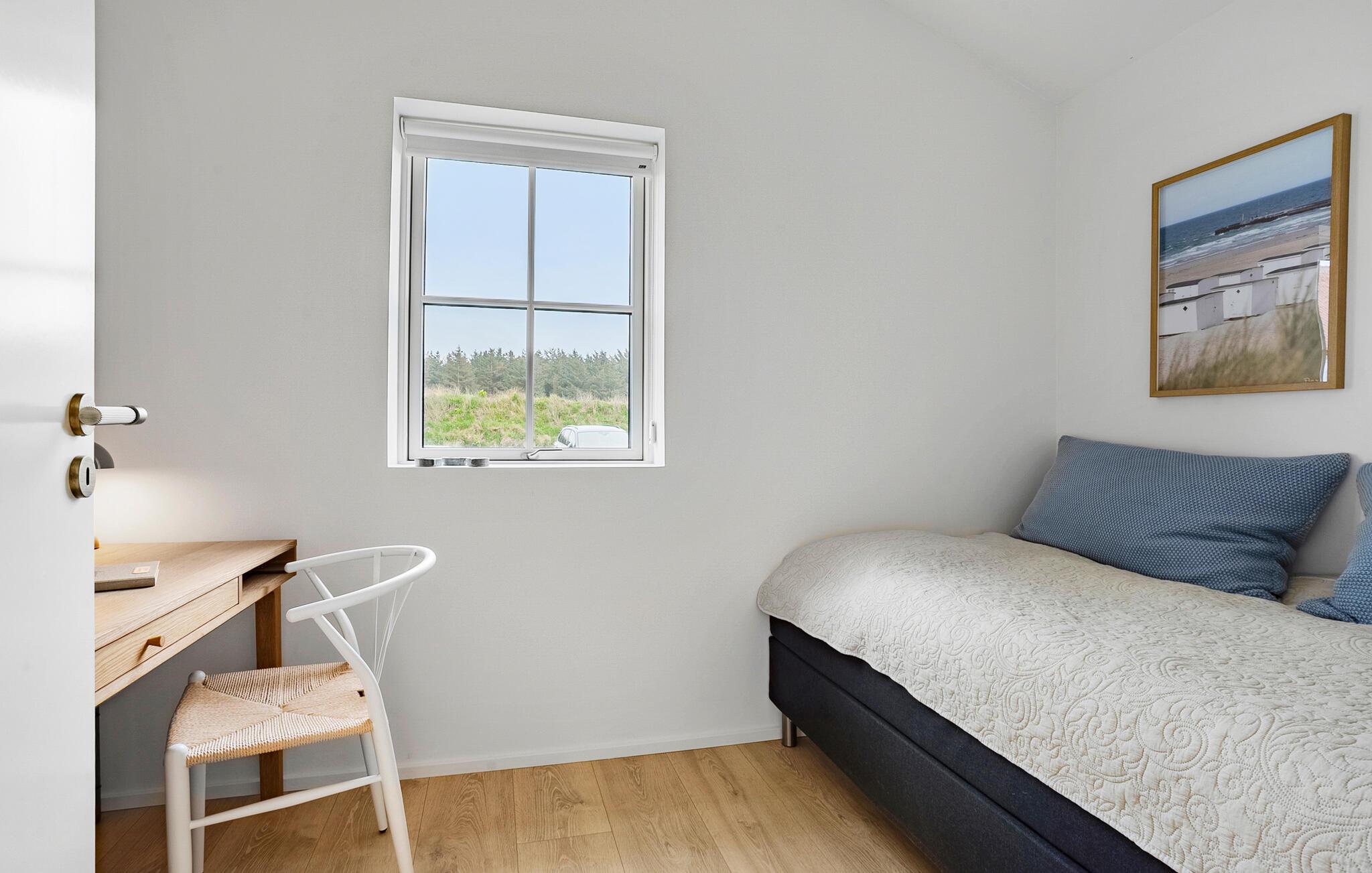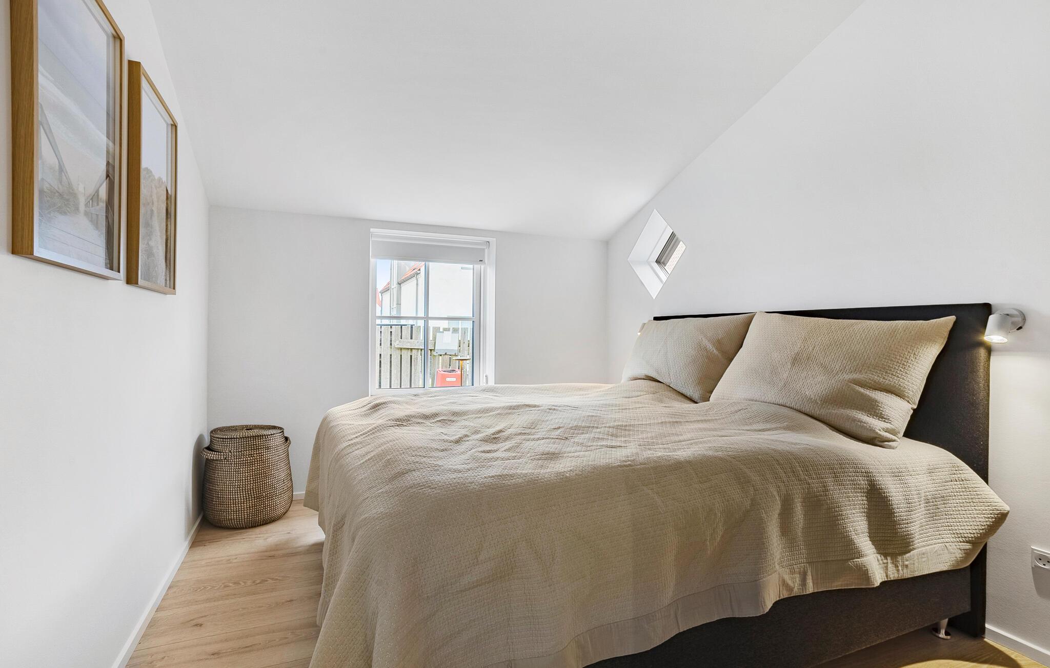 Dette moderne feriehus ligger i et roligt kvarter, kun få minutters gang fra Løkkens bymidte og den populære sandstrand. Her er der gode rammer til en børnefamilie eller to par og giver jer en skøn base i smukke omgivelser. Træd ind i den rummelige opholds- og spisestue, som får masser af lys ind gennem de store vinduespartier. Læn jer tilbage i den behagelige sofa eller planlæg feriedagen over en sen morgenmad ved spisebordet. Det åbne køkken med kogeø har lækre kvalitetsløsninger og masser af plads til at lave mad sammen. En fin detalje er den integrerede hems i stuen, som er et hyggeligt tilflugtssted for børn og voksne.