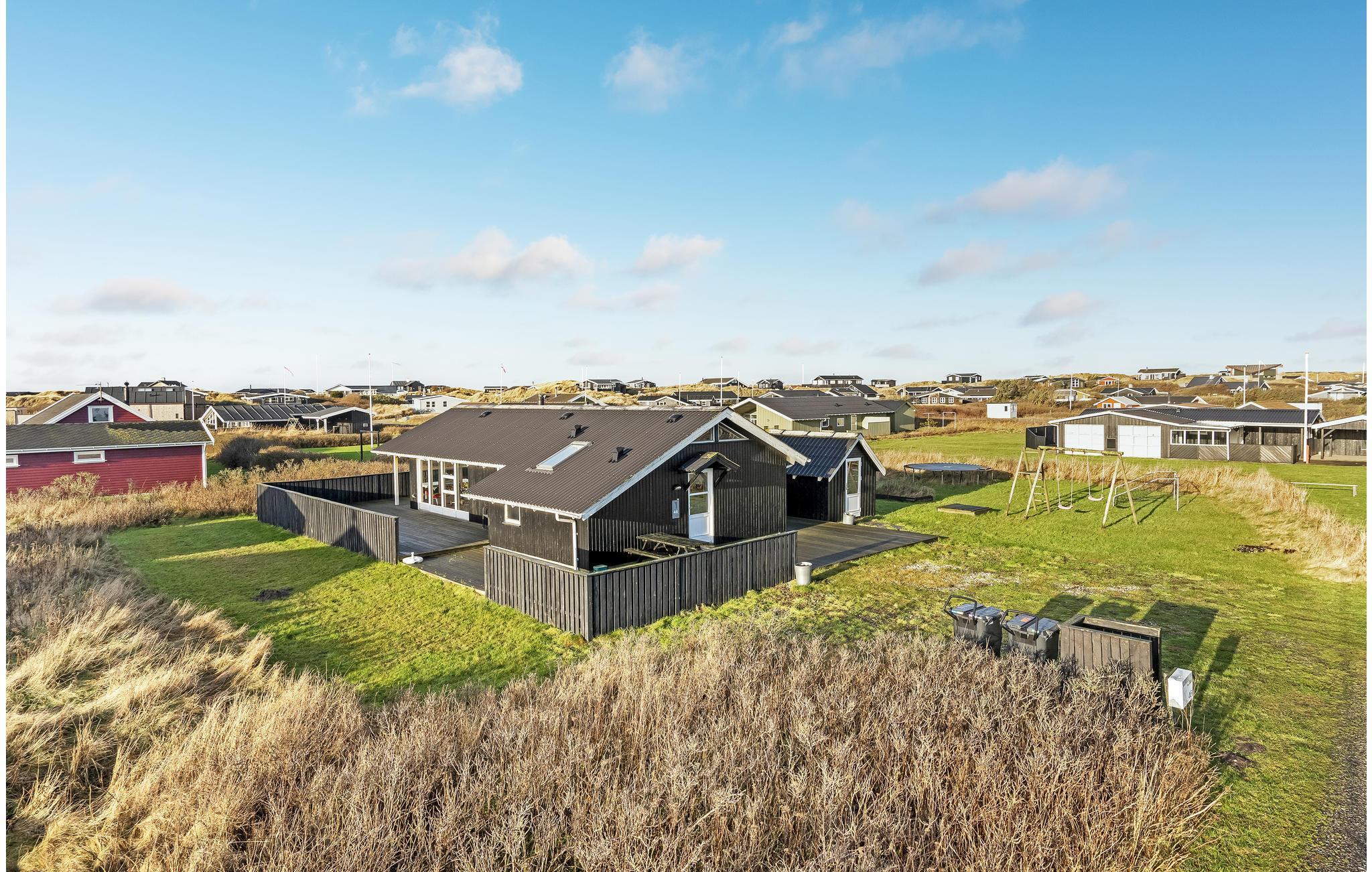 Hyggeligt feriehus nær stranden i Løkken med terrasse, brændeovn og legeplads for børn.