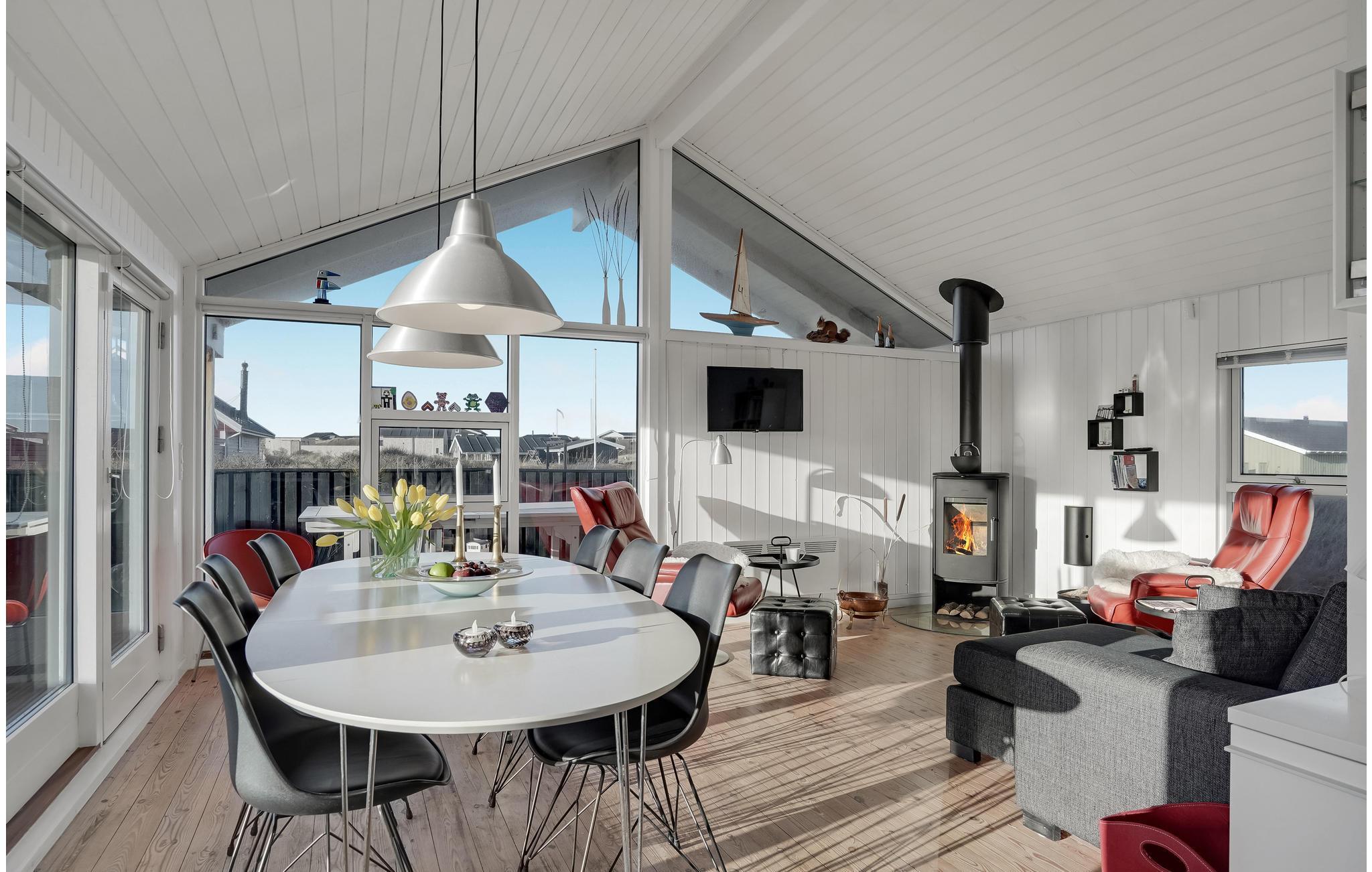 Træd ind i jeres smukke feriehus, og glæd jer til at tilbringe en afslappende ferie sammen. Den lyse stue vil blive jeres naturlige samlingssted. Spil kort, nyd lækker mad, eller sæt jer i sofaen ved den varme ild i brændeovnen, og se en underholdende film. Huset er på alle sider omgivet af en smuk terrasse. Nyd mange skønne timer i solen, eller grill jeres yndlingsretter om aftenen. I mellemtiden kan jeres børn lege, gynge og hoppe på legepladsens udstyr i haven.