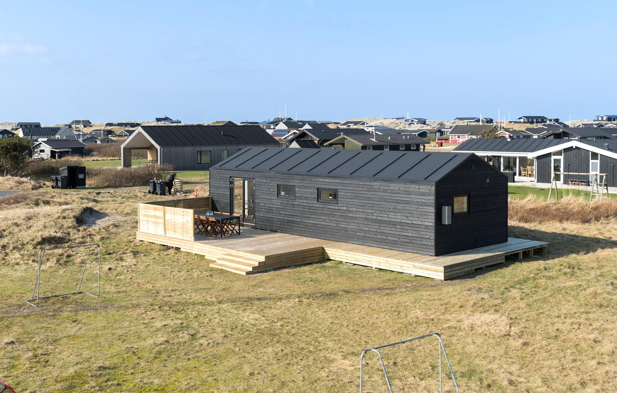 Hyggeligt og moderne træhus nær stranden i Løkken med stor terrasse og trampolin til børnene.