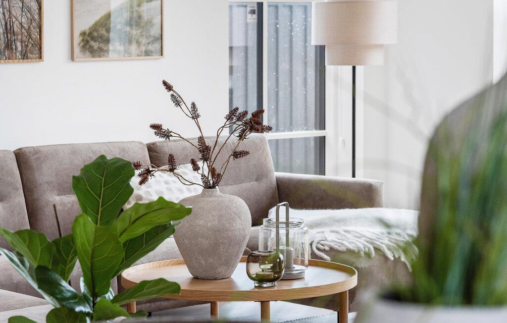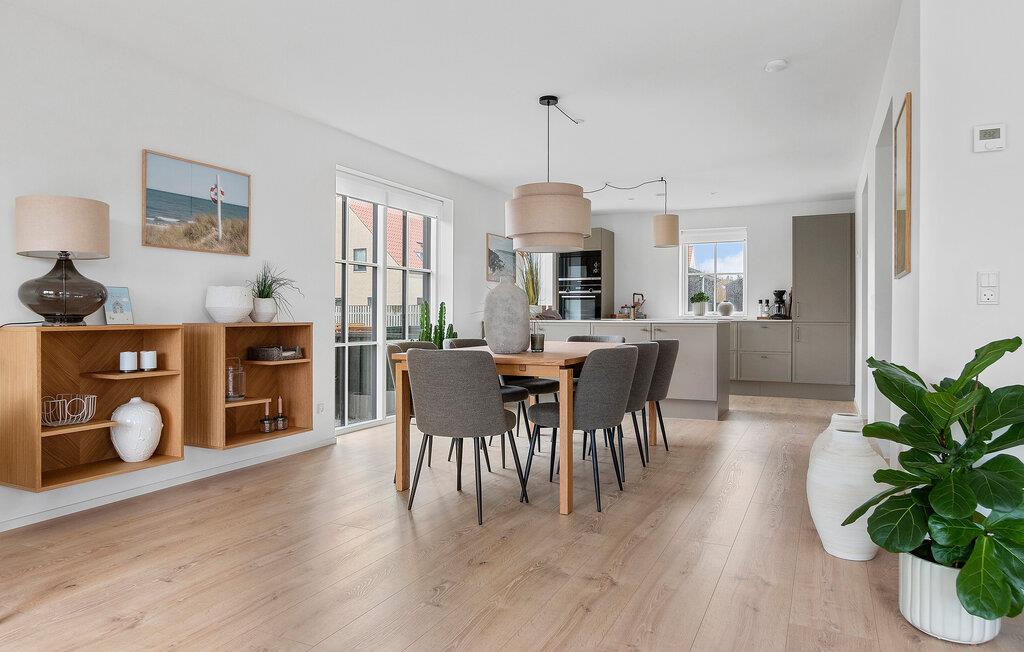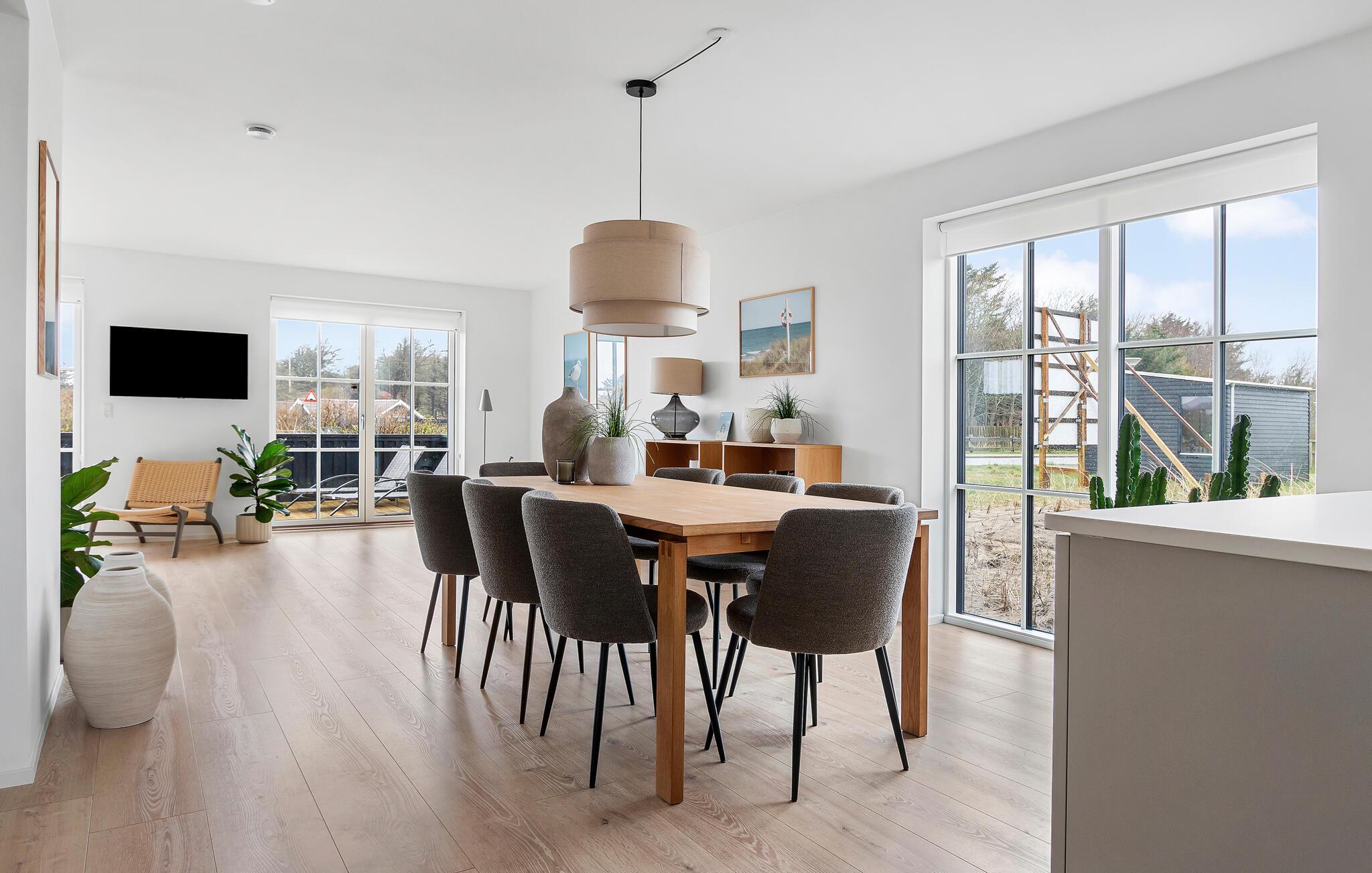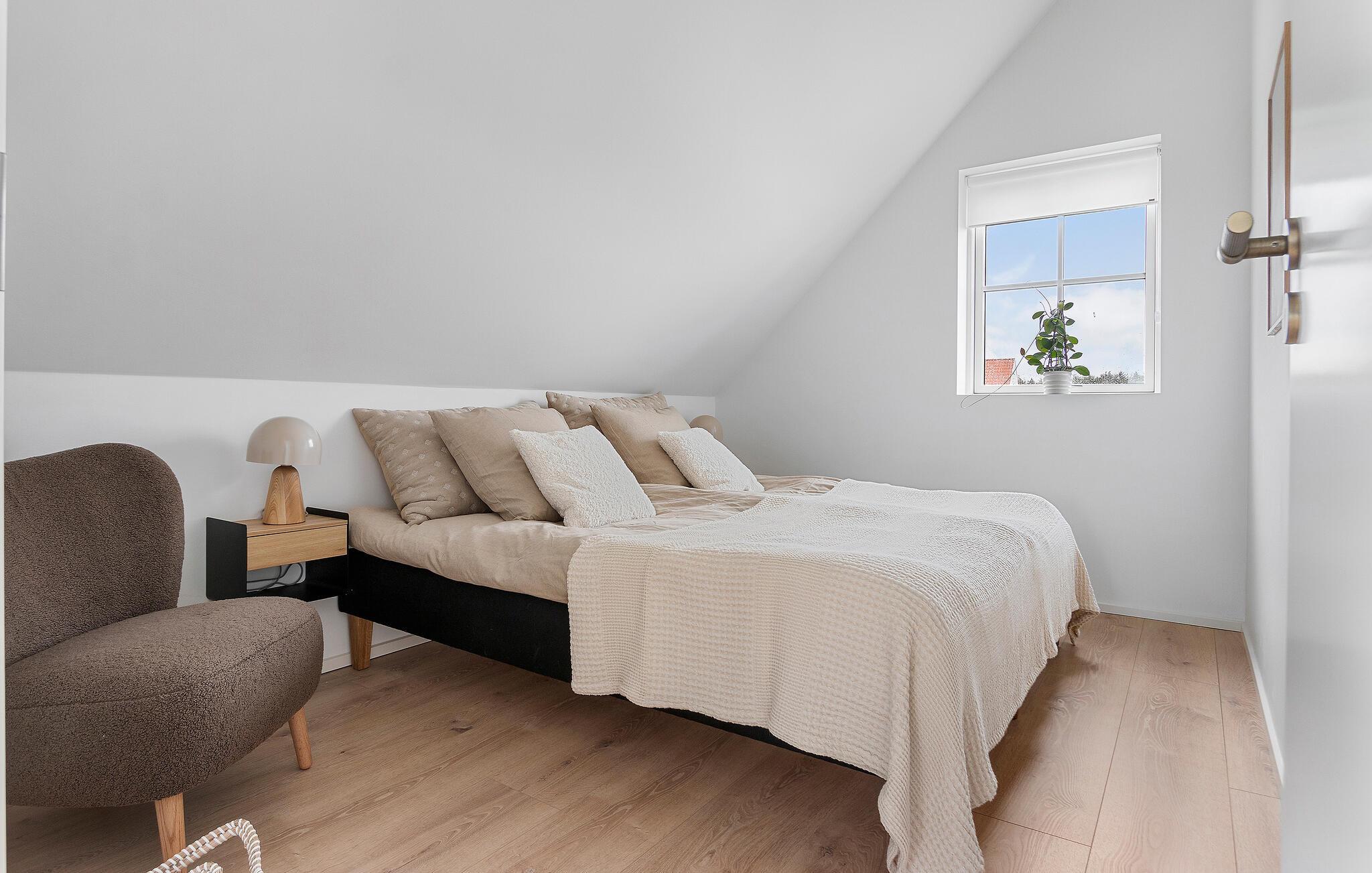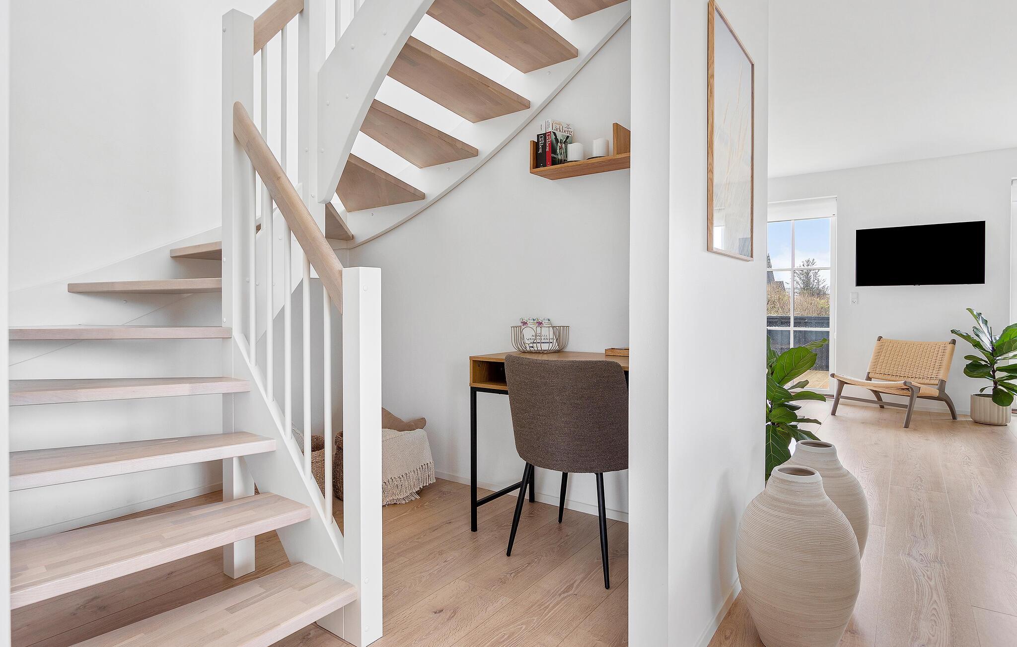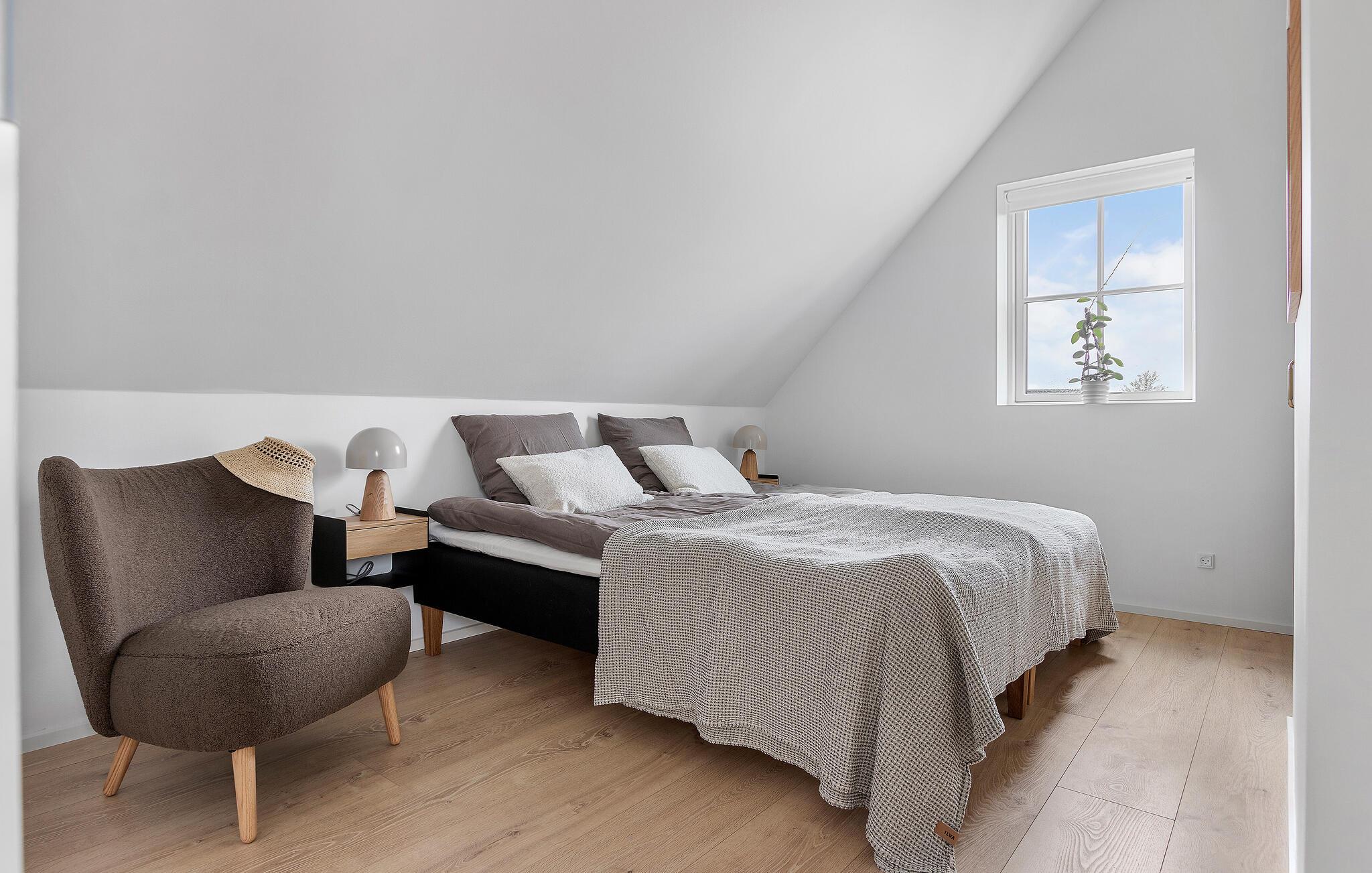 I dette flotte og komfortable træhus får I rigeligt med plads og en god rumfordeling over to etager til en ferie med den større familie. Huset er flot indrettet med varme trægulve, pæn kunst på væggene og store vinduespartier, der giver den åbne stue et dejligt lysindfald og udsigt til terrassen. Nyd godt af de moderne faciliteter i køkkenet og gør madlavningen til et hyggeligt fællesprojekt, inden der dækkes op til det store festmåltid ved spisebordet. Senere kan I hive brætspillene frem eller trække over i sofaen, der er stor og komfortabel, og som indbyder til filmhygge med gode snacks på de køligere dage.