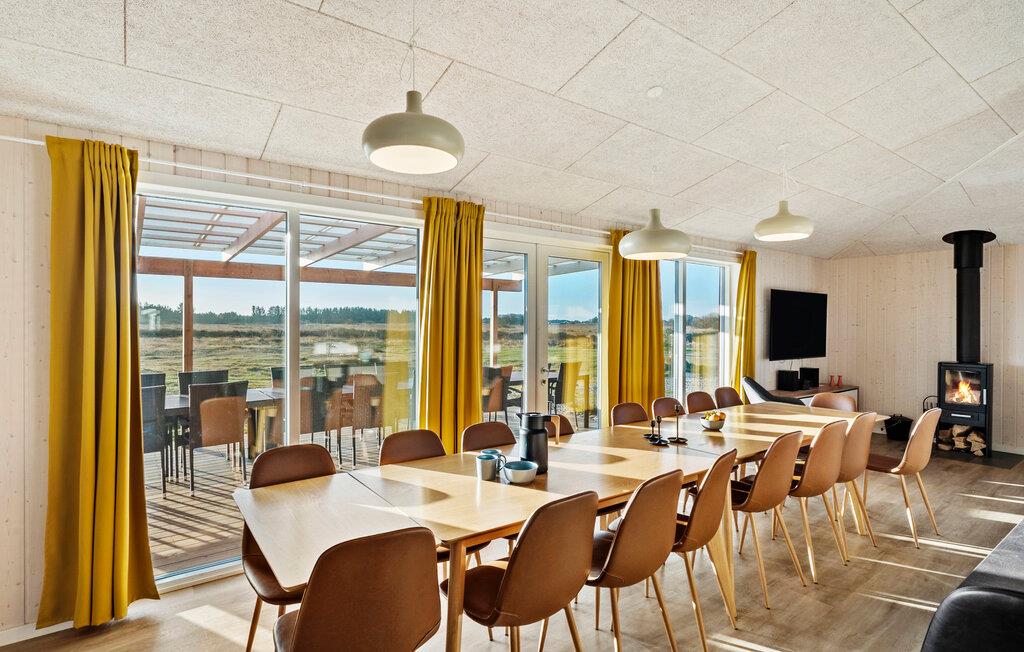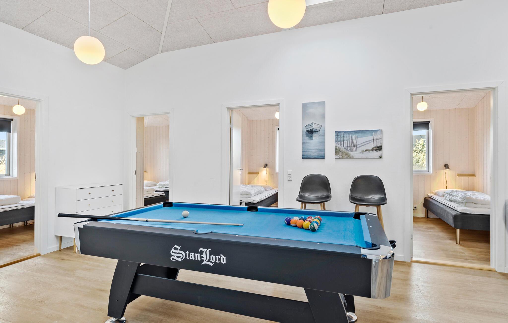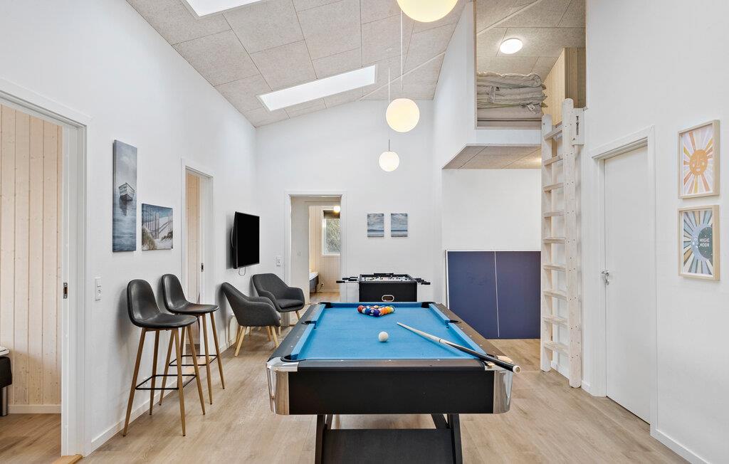 Dette rummelige og stilfulde feriehus i Løkken byder på den ideelle bolig for flere familier eller en stor gruppe af venner og garanterer et afslappende ophold fyldt med variation. Den moderne og komfortable opholdsstue er udstyret med komfortable siddepladser og hyggelige dekorative elementer. Den åbne spiseplads byder på plads til alle gæster, og køkkenet er veludstyret med moderne apparater til at tilberede jeres lækre retter. Brug pool- og bordfodboldbordet til sjov og underholdning. Det absolutte højdepunkt er dog den private pool med vandrutsjebane samt spabad og sauna, som giver ekstra afslapning.