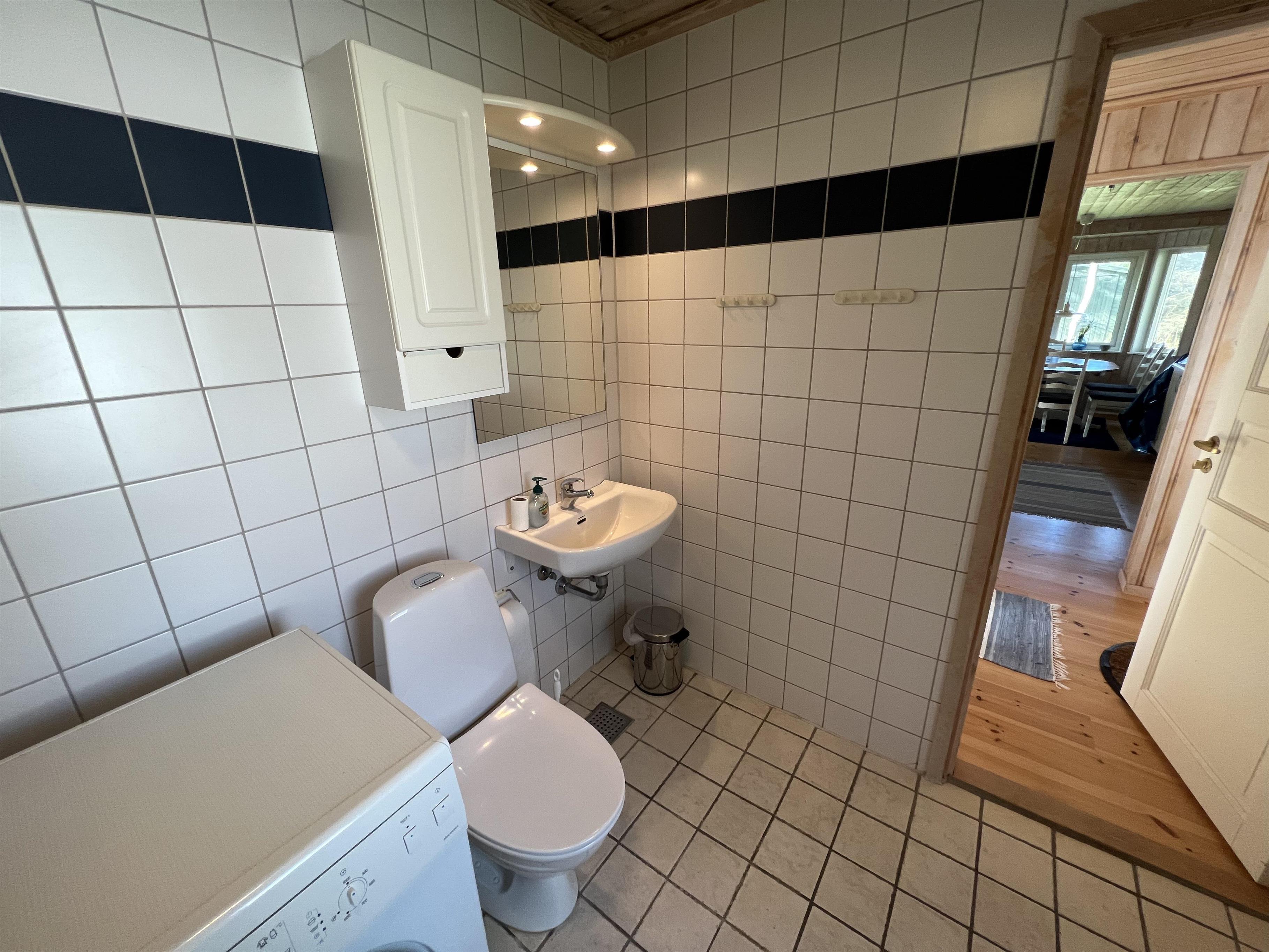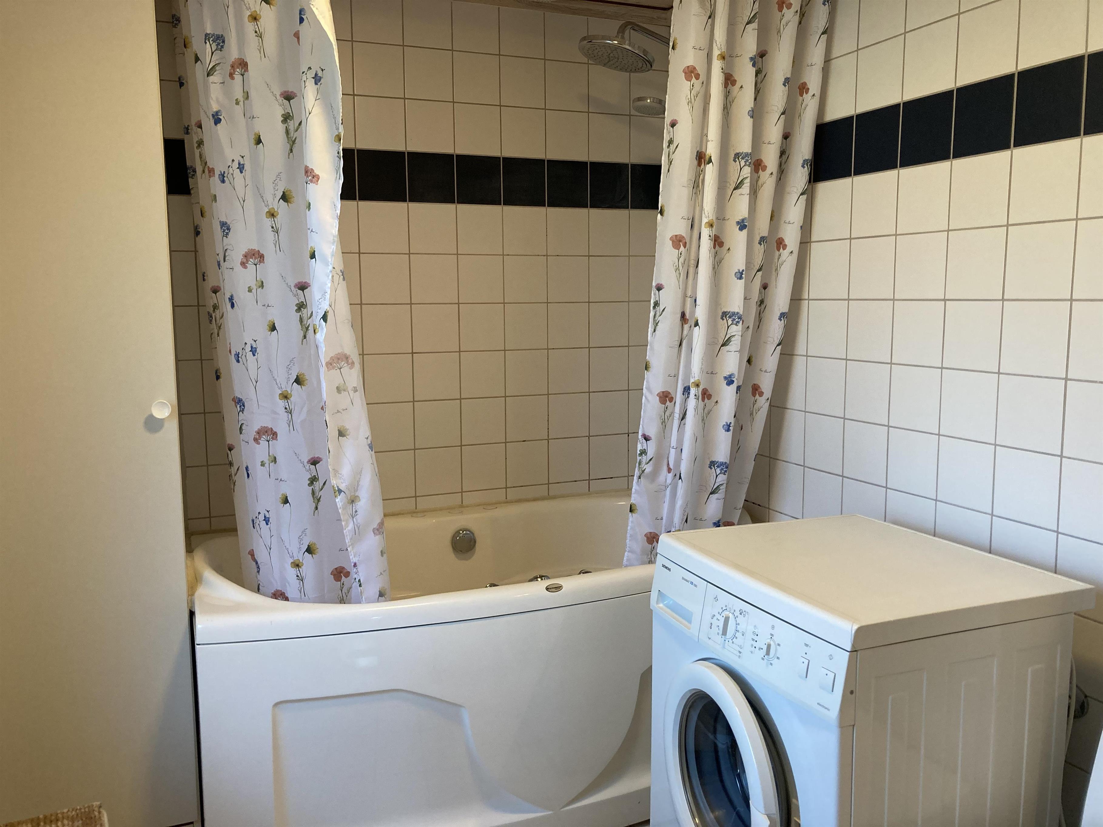 Dejligt flisebadeværelse med toilet og spa-badekar og vaskemaskine.