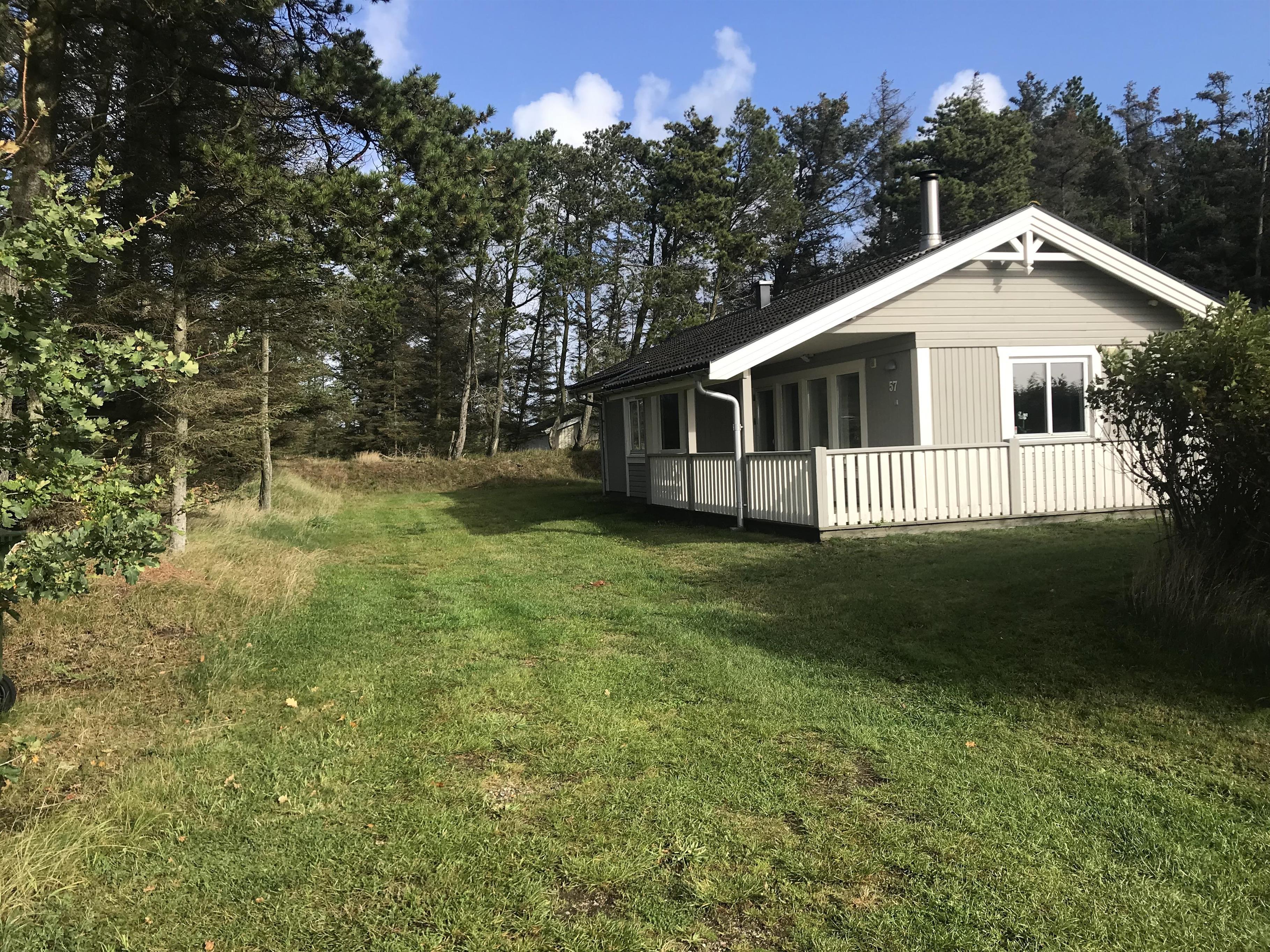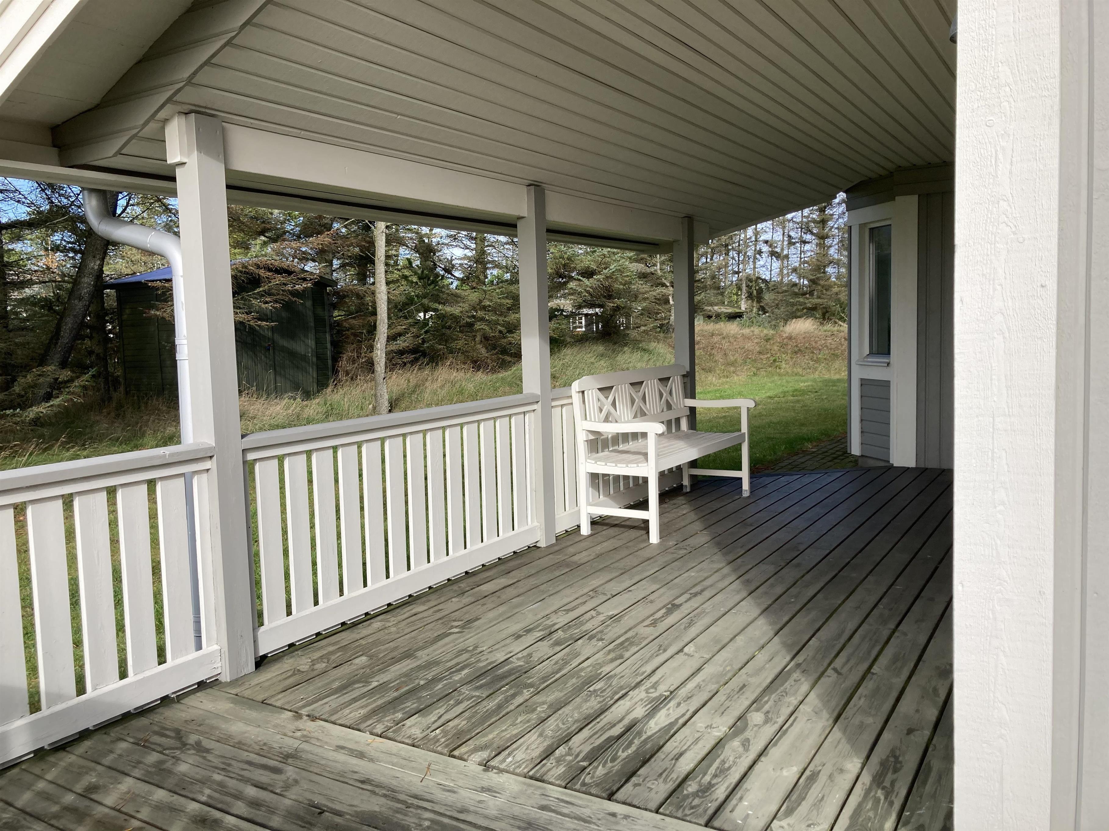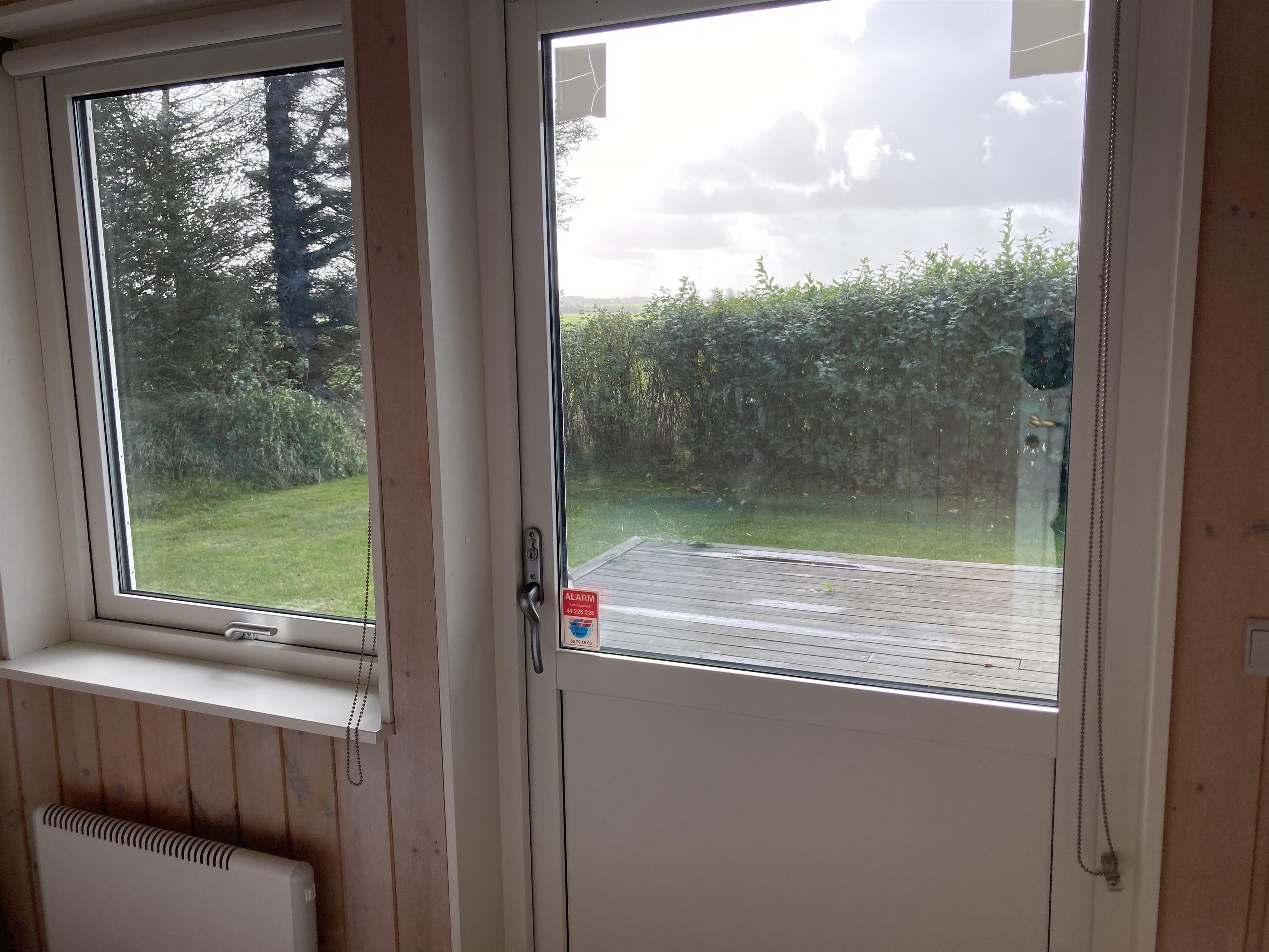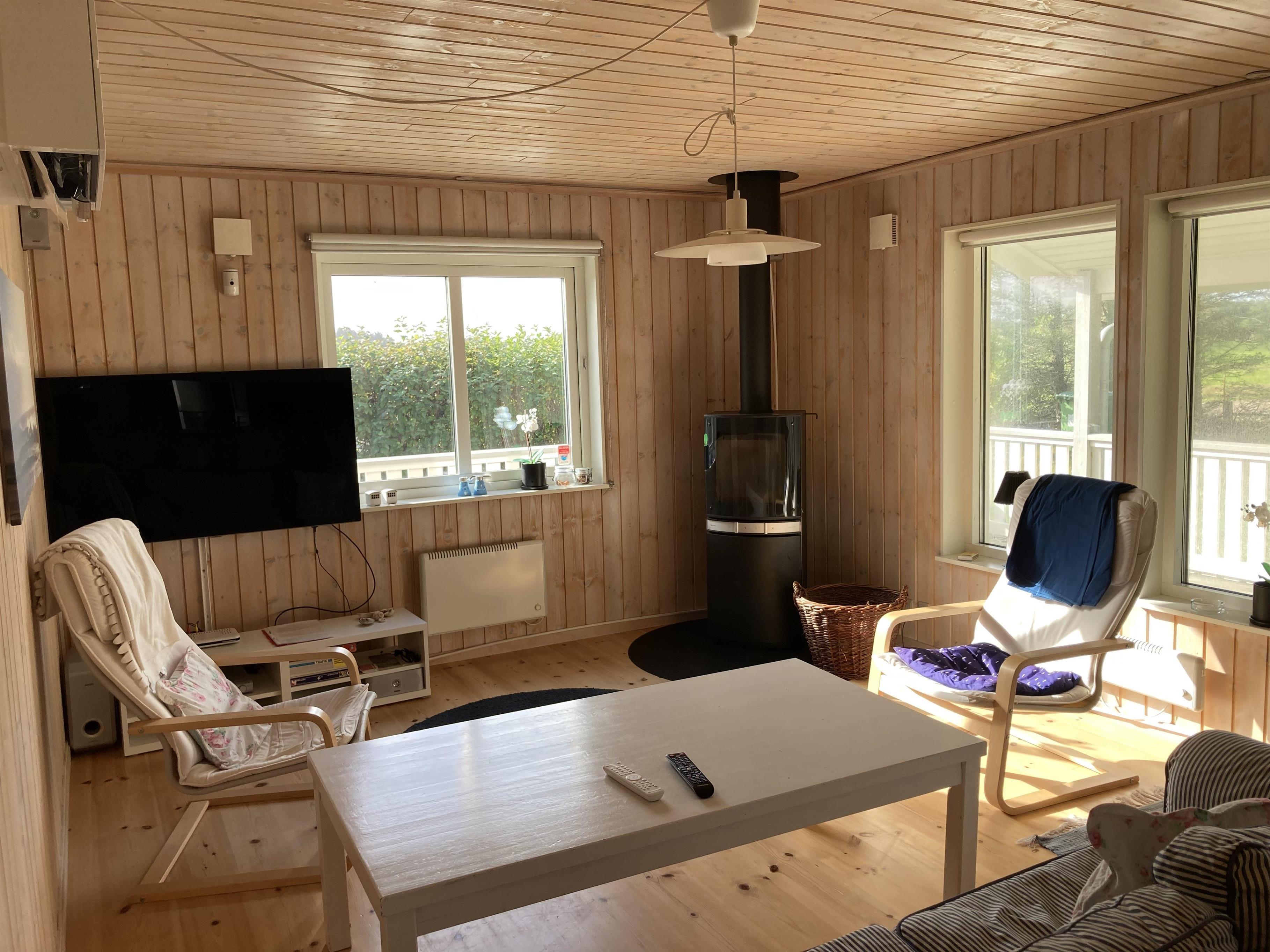 Grunden er omkranset af høje træer. Der er en stor, dejlig træterrasse med havemøbler og liggestole, og hvis vejret ikke viser sig fra sin bedste side, er der en overdækket terrasse med en bænk, så I alligevel kan være ude og nyde den skønne udsigt og den friske luft.