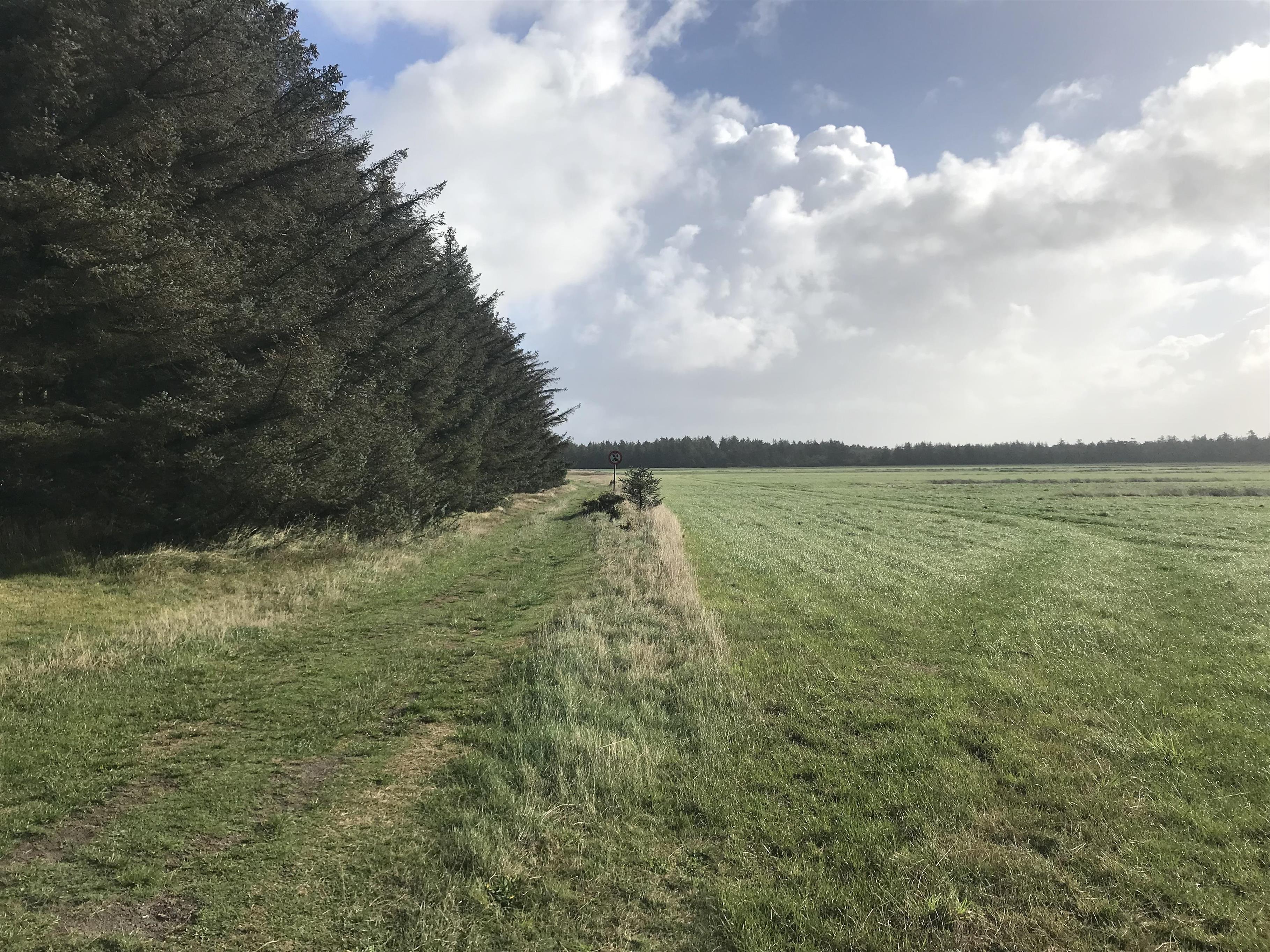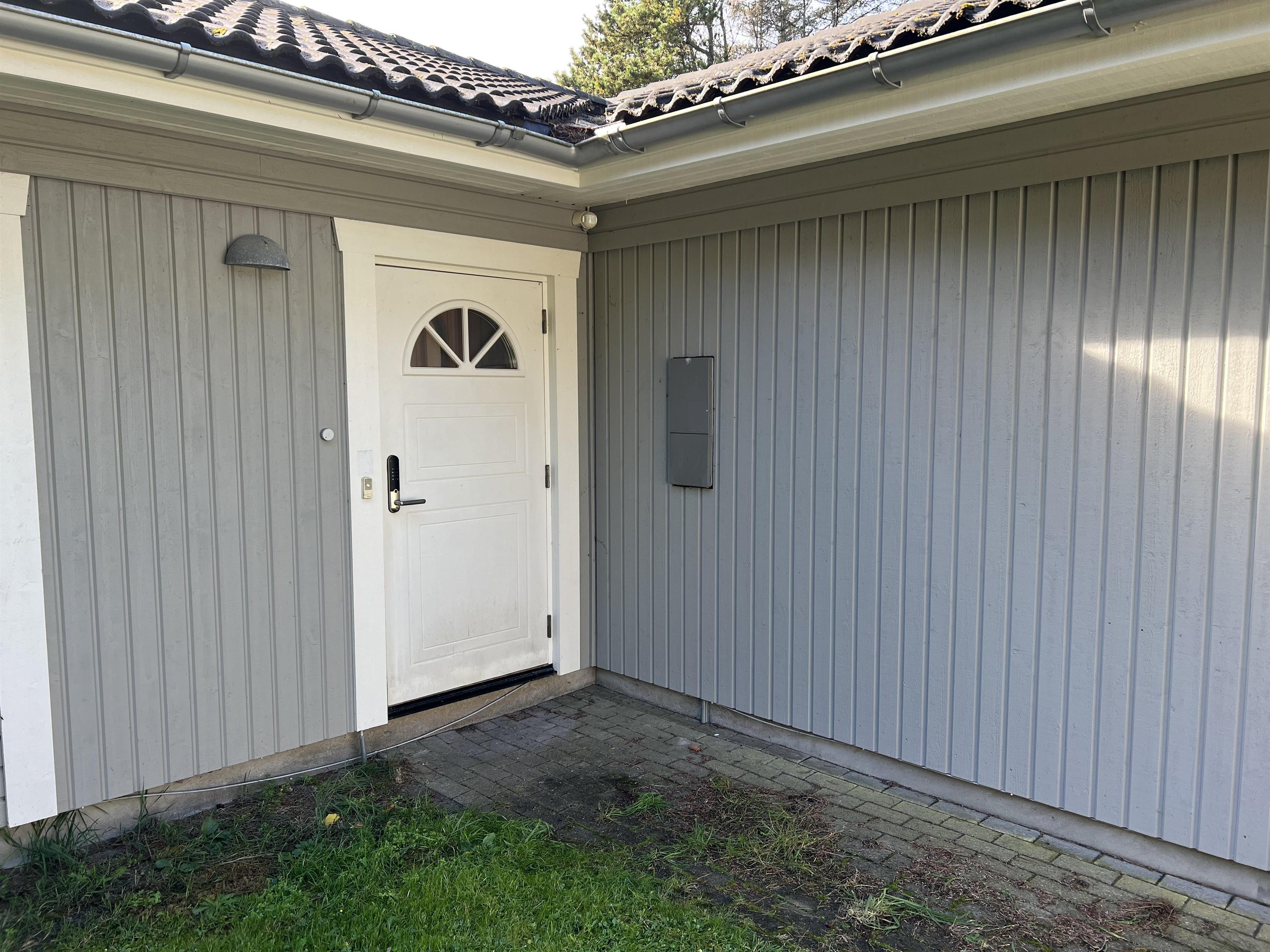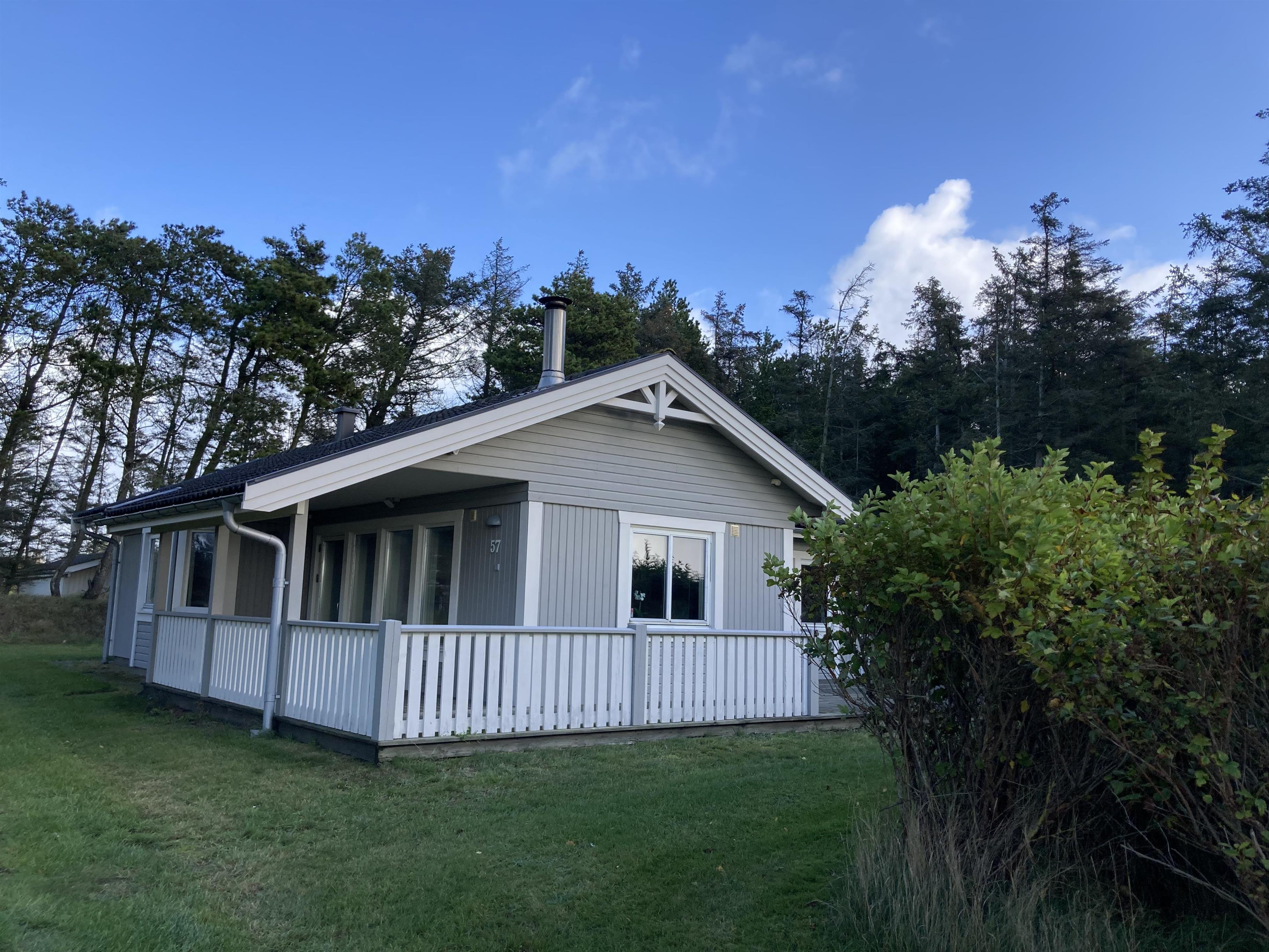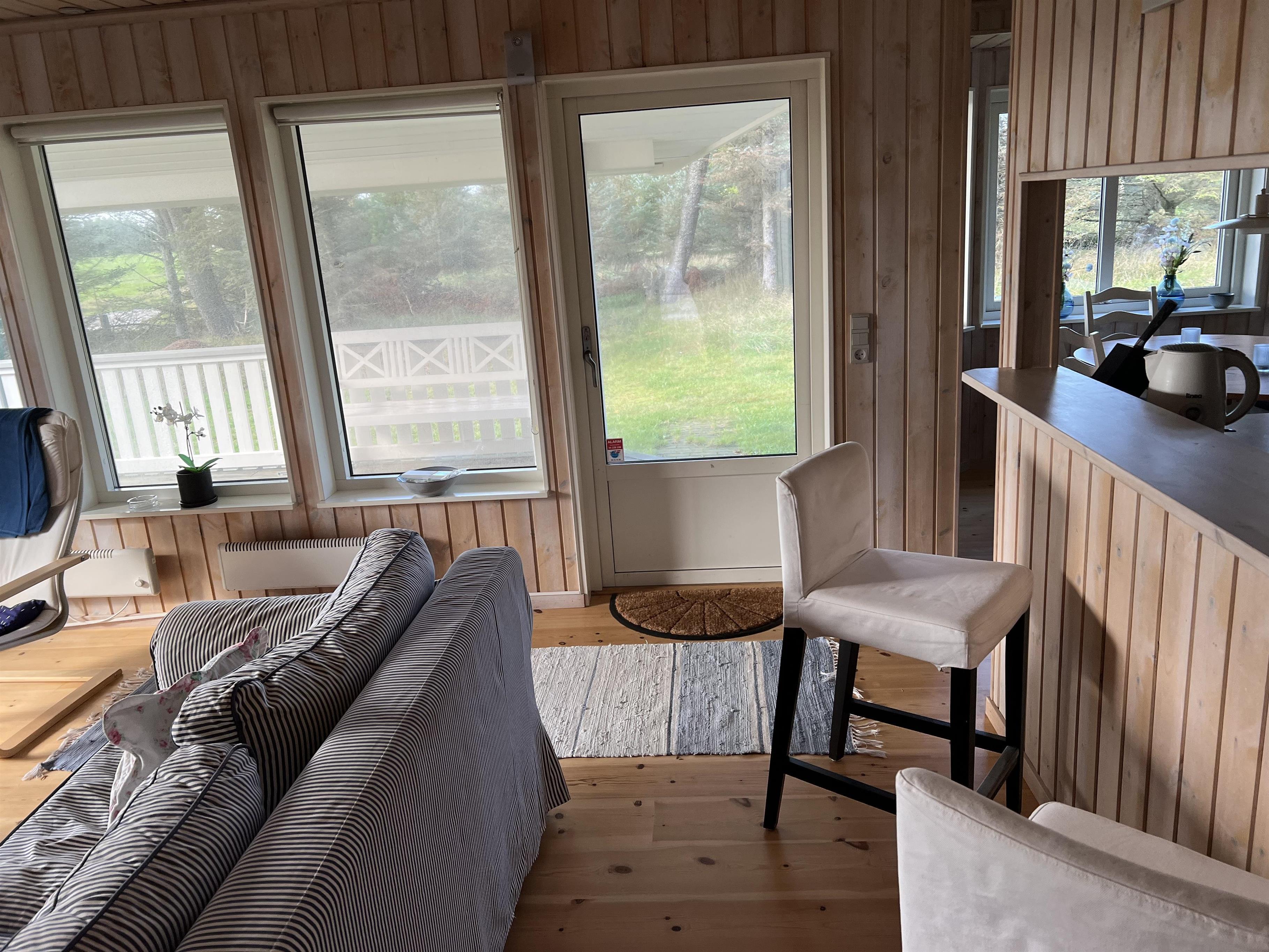 Grunden er omkranset af høje træer. Der er en stor, dejlig træterrasse med havemøbler og liggestole, og hvis vejret ikke viser sig fra sin bedste side, er der en overdækket terrasse med en bænk, så I alligevel kan være ude og nyde den skønne udsigt og den friske luft.