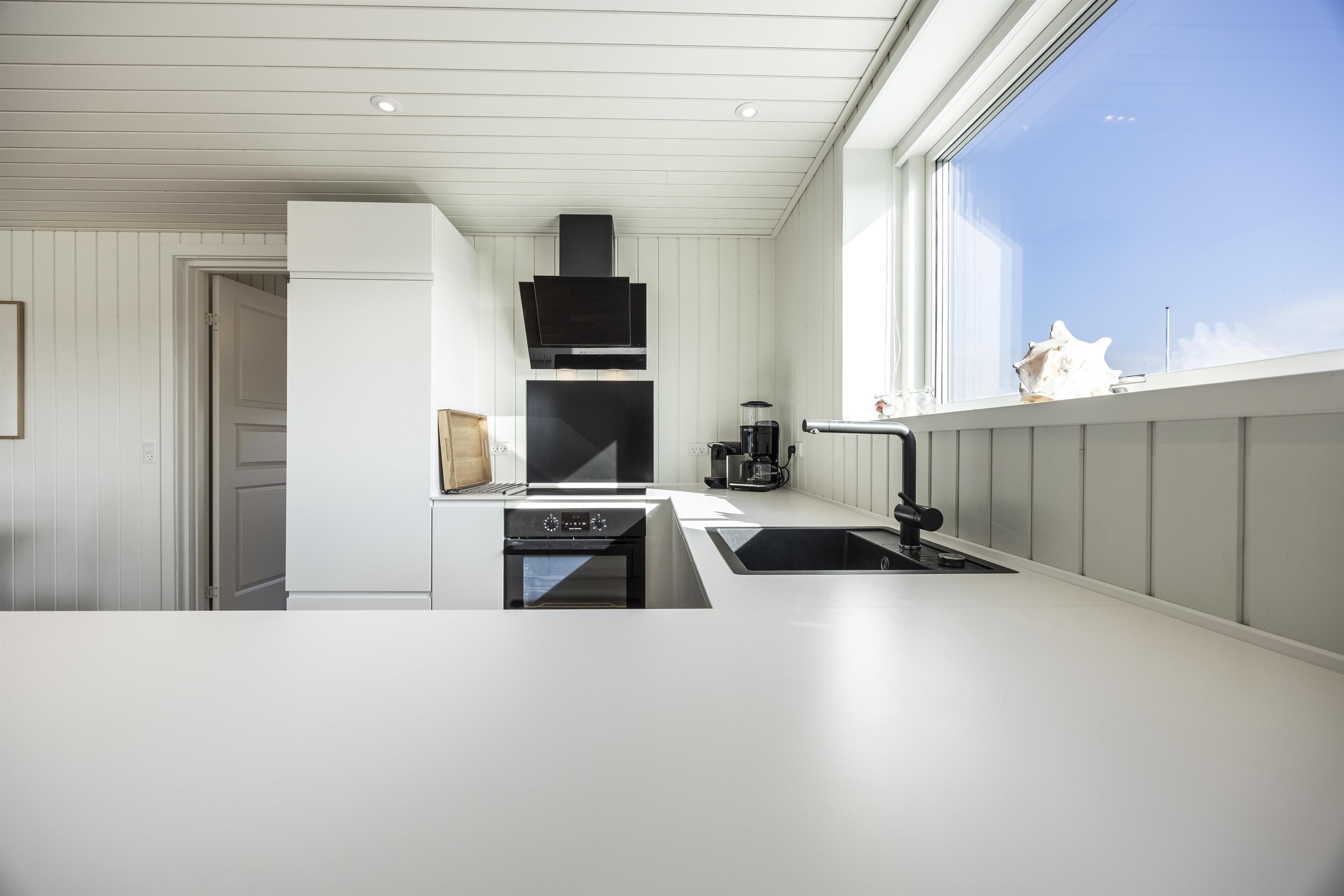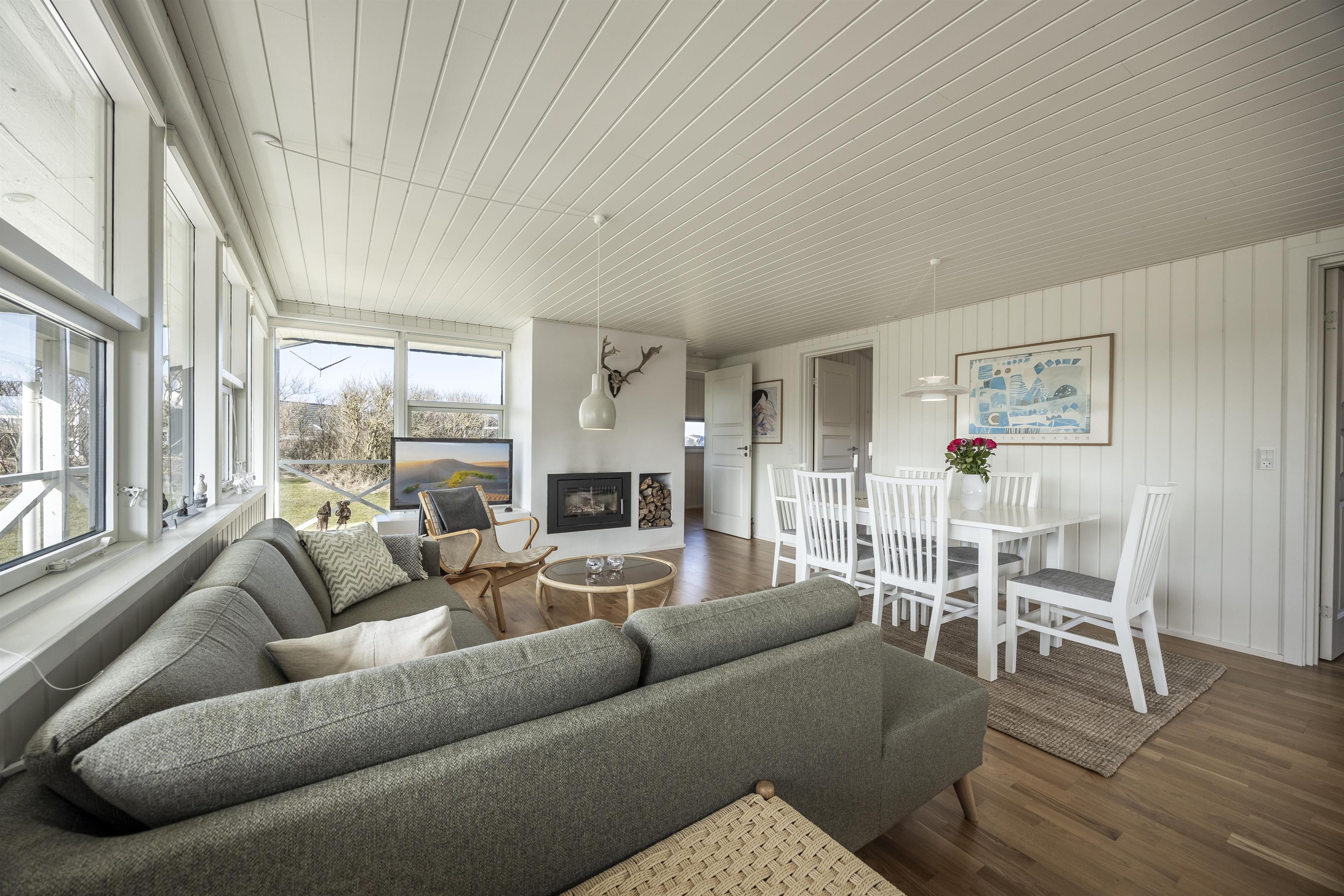 Når I træder ind i huset, mødes I af en lys og indbydende opholdstue, der ligger i åben forbindelse med det moderne køkken - husets naturlige samlingspunkt. Her vil I tilbringe mange hyggelige stunder, når vejret ikke tillader at nyde de skønne udendørsarealer.