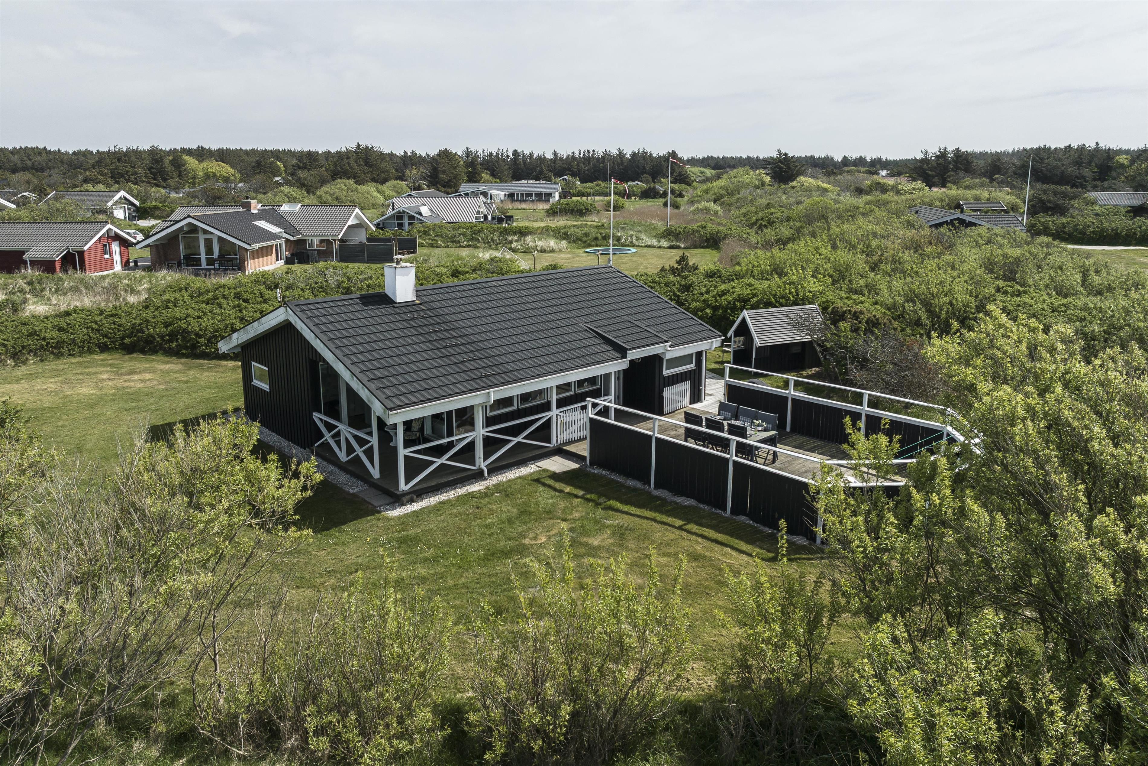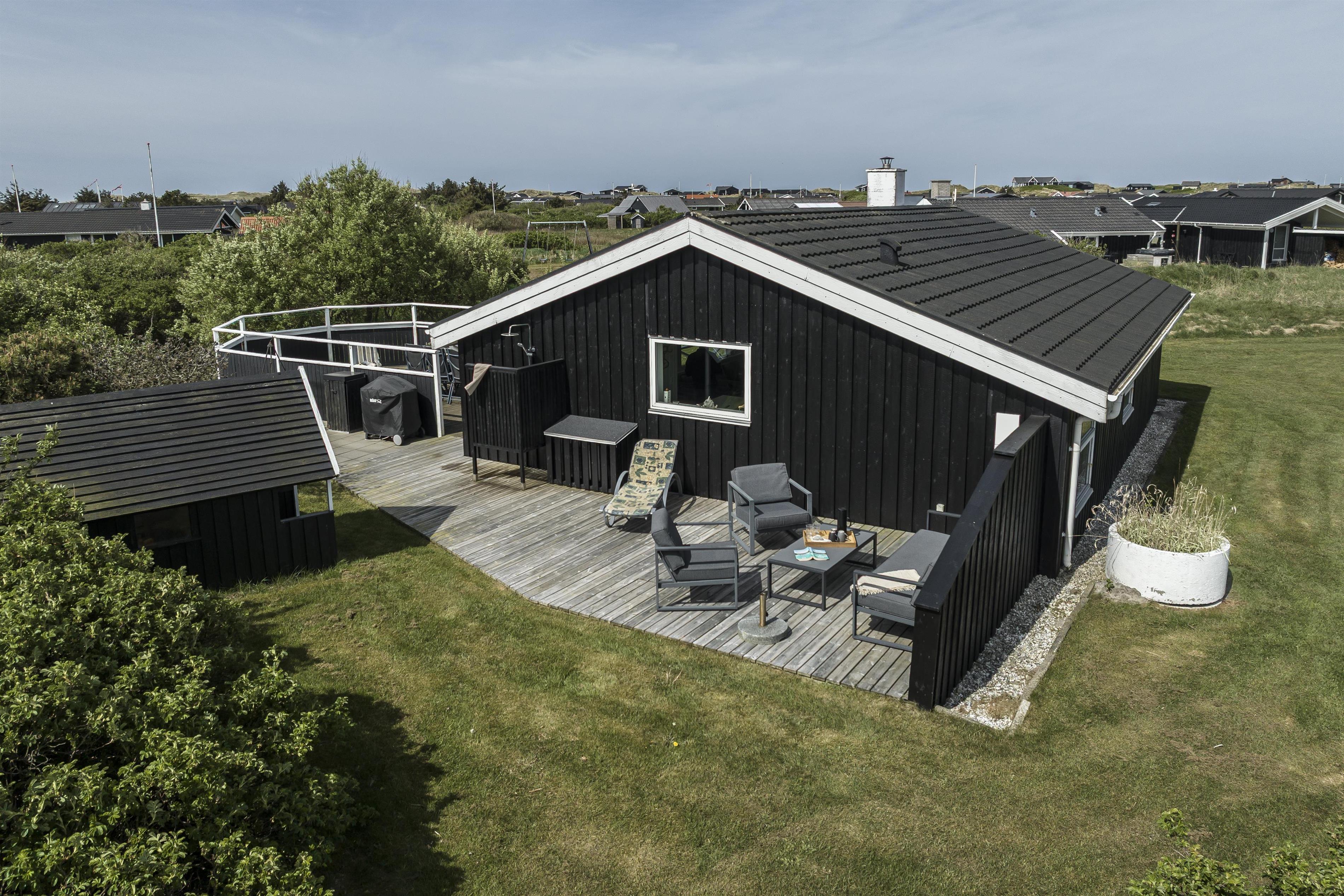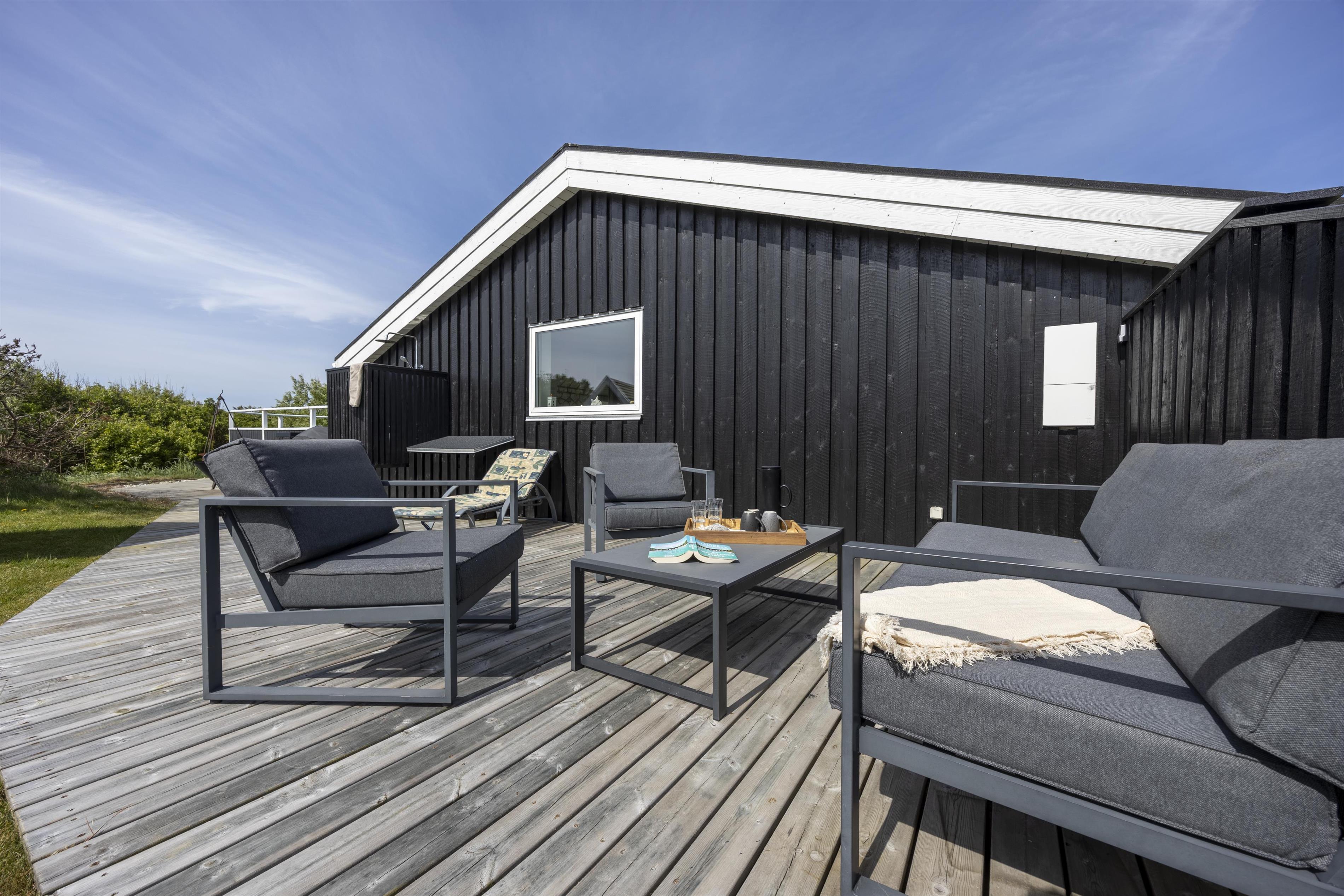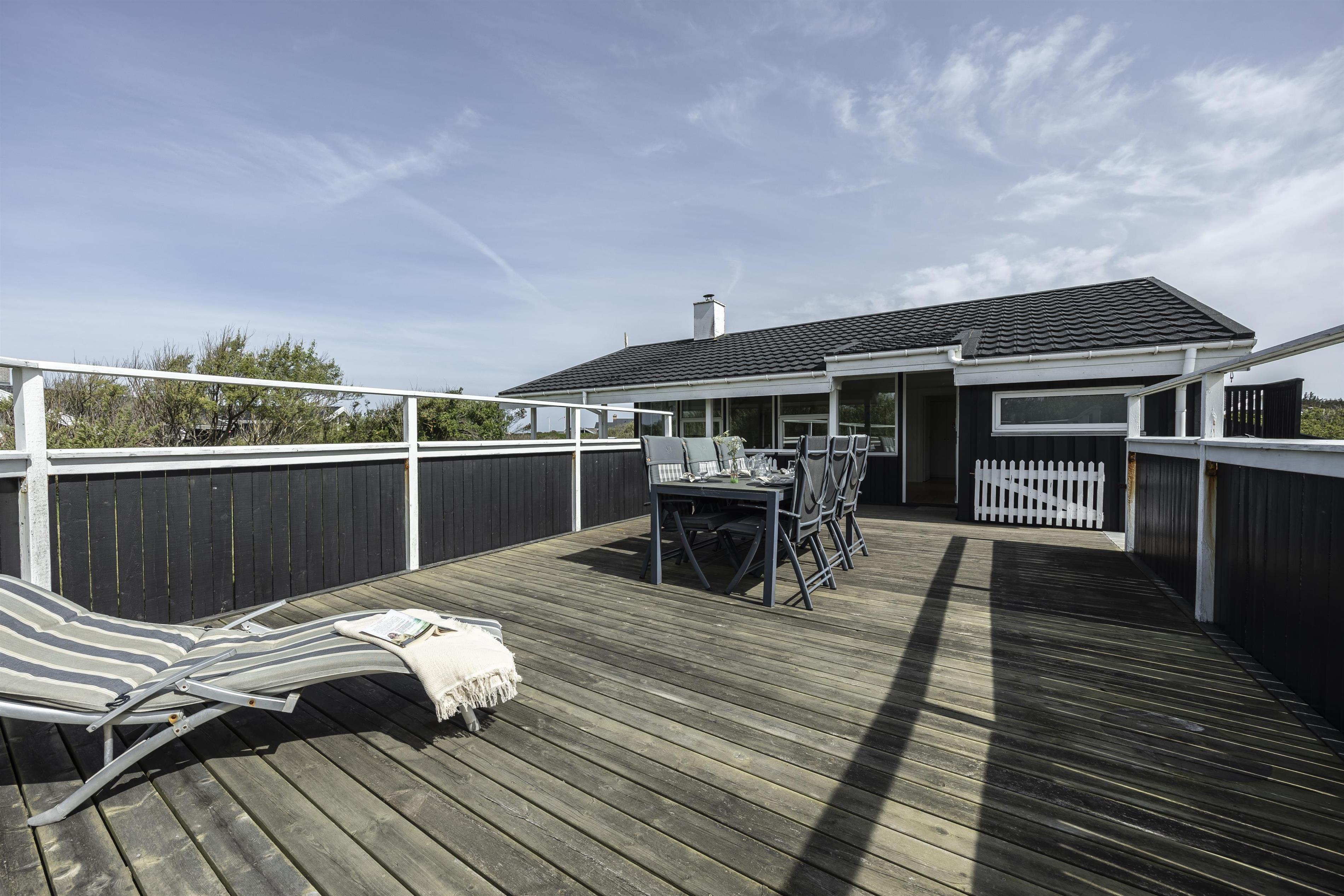Feriehuset ligger på en 2000 m2 stor grund, trukket væk fra vejen. Her finder I en stor dejlig plæne - perfekt til kongespil, boldspil og andre udendørs aktiviteter. Huset har flere hyggelige terrasser og lækroge rundt om huset, hvor I kan nyde ferien i fred og ro. Start dagen med morgenkaffe i læ bag huset og afslut aftenen på den store terrasse, hvor I kan sidde ugeneret og nyde solnedgangen over vestkysten. Den overdækkede terrasse på forsiden af huset er det perfekte sted at nyde en stille aften med aftenskaffen, mens I ser himlen skifte farve, når solen stille går ned i horisonten. Derudover kan terrassen lukkes af med et hegn, så jeres firbenede ven ikke løber på eventyr.