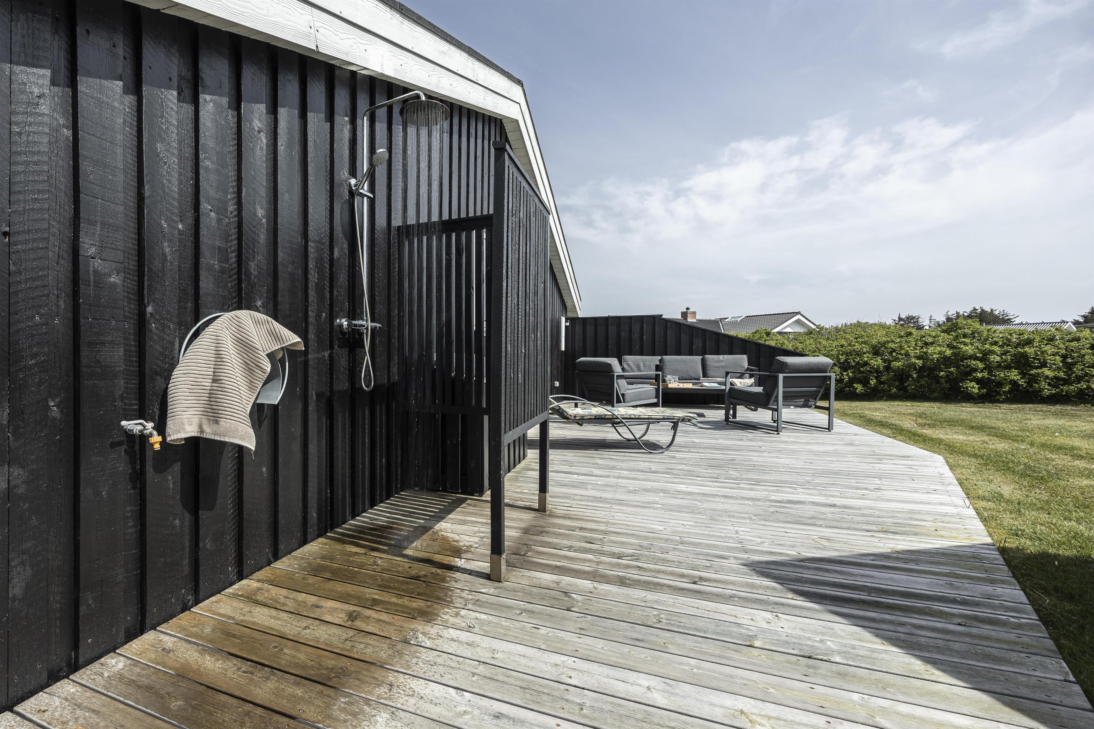 Når I har nydt en dejlig dag på stranden, kan sandet skylles af kroppen under den udendørsbruser, som er installeret ved feriehuset i sommermånederne.