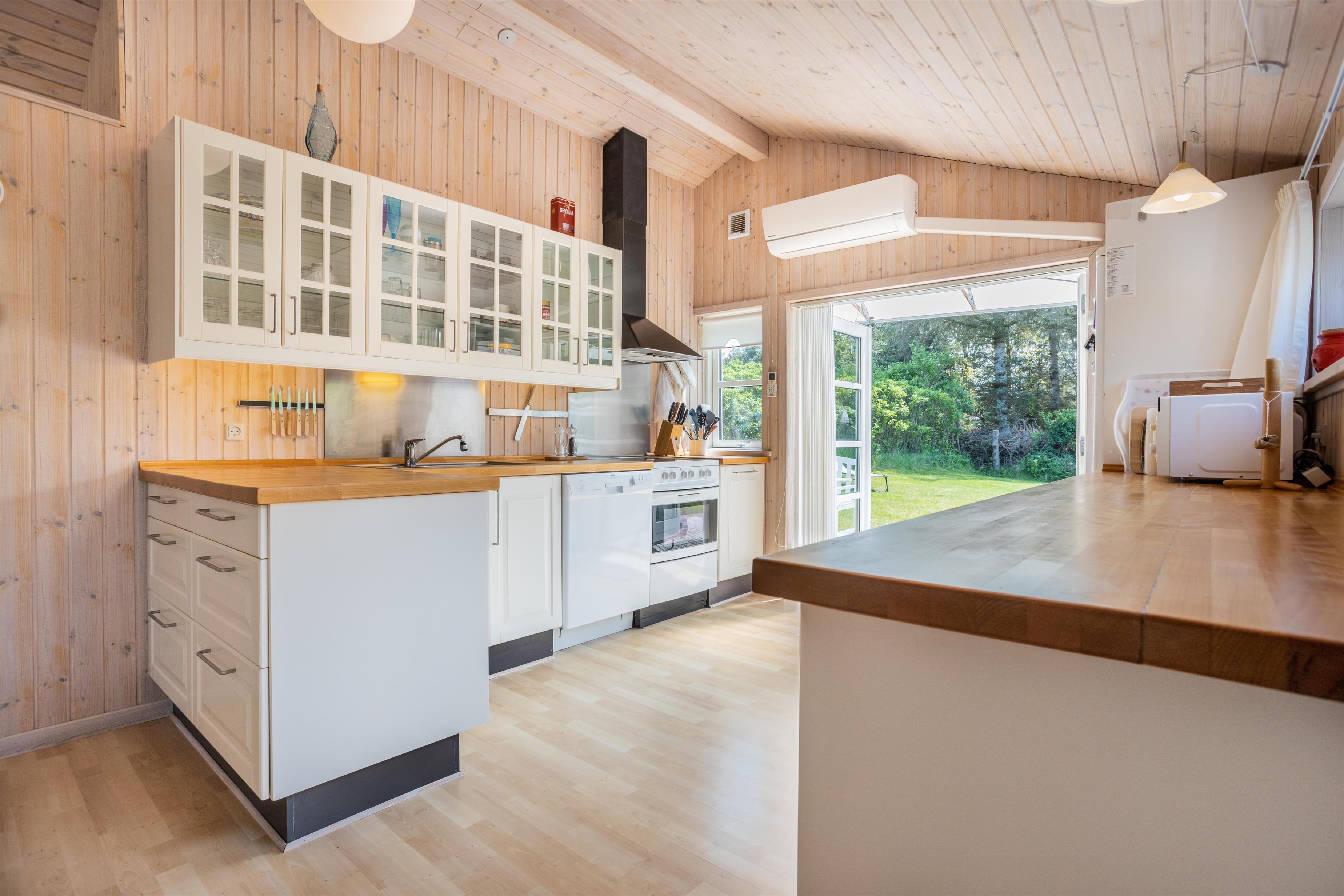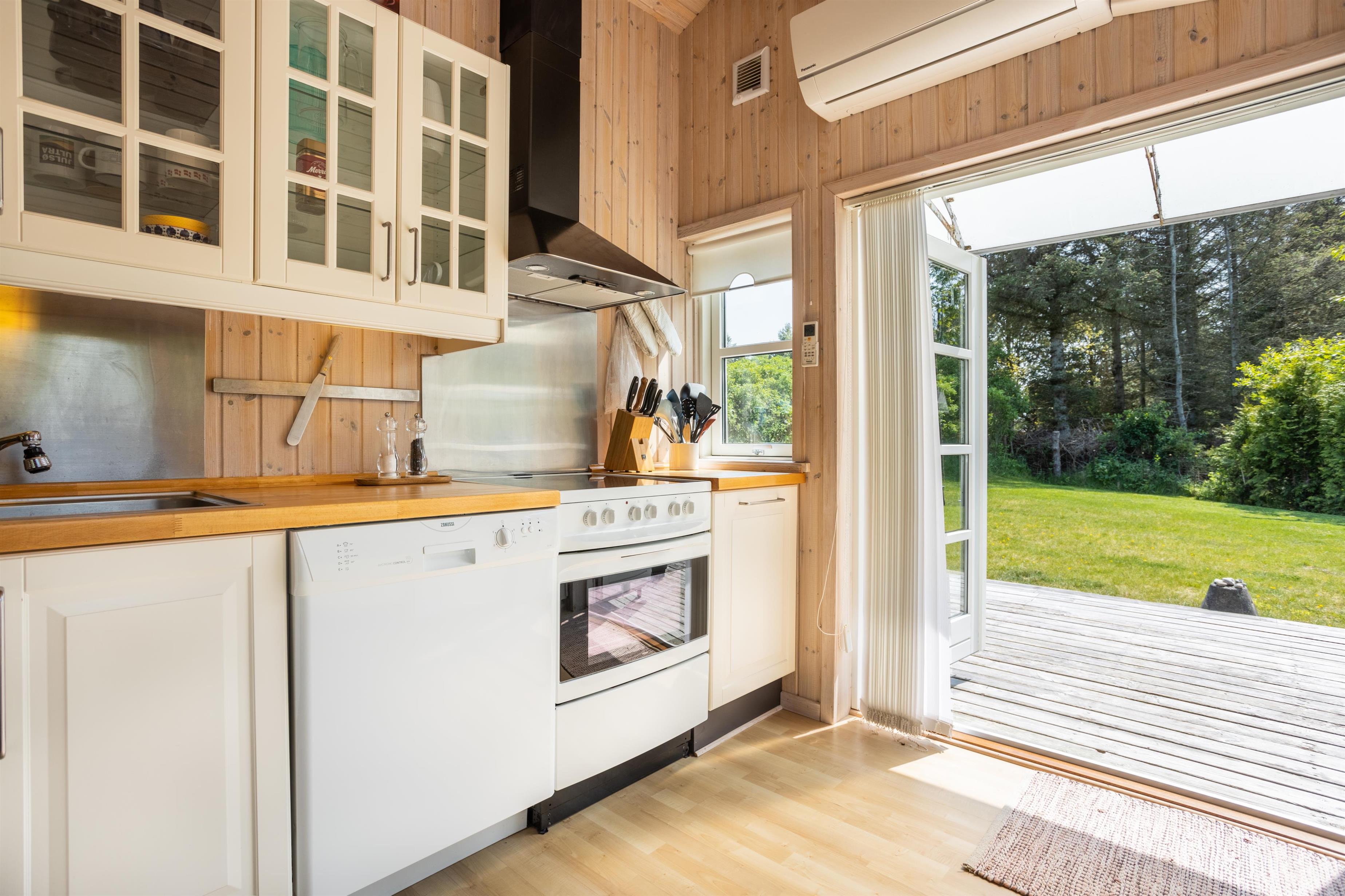 Hjertet af huset er det åbne køkken-alrum, hvor køkkenet ligger i direkte forbindelse med spisepladsen og stuen. Her kan I samles om madlavning, hyggelige måltider, gode samtaler eller brætspil. De store vinduespartier i både køkken og stue lader dagslyset strømme ind og skaber en lys og indbydende atmosfære, mens brændeovnen tilføjer varme og hygge på kølige dage. Åbn de store døre og I får direkte adgang til en dejlig terrasse, der indbyder til afslapning i det fri og måltider under åben himmel. Huset rummer desuden tre gode soveværelser og et dejligt badeværelse.