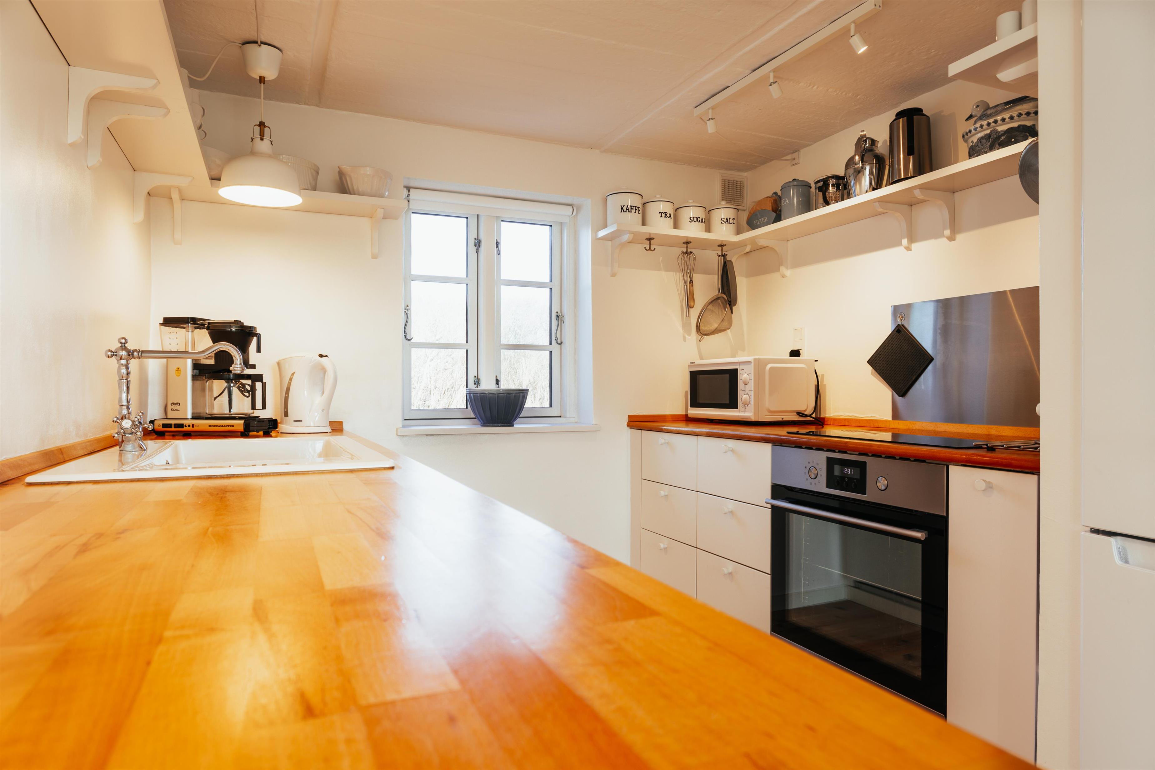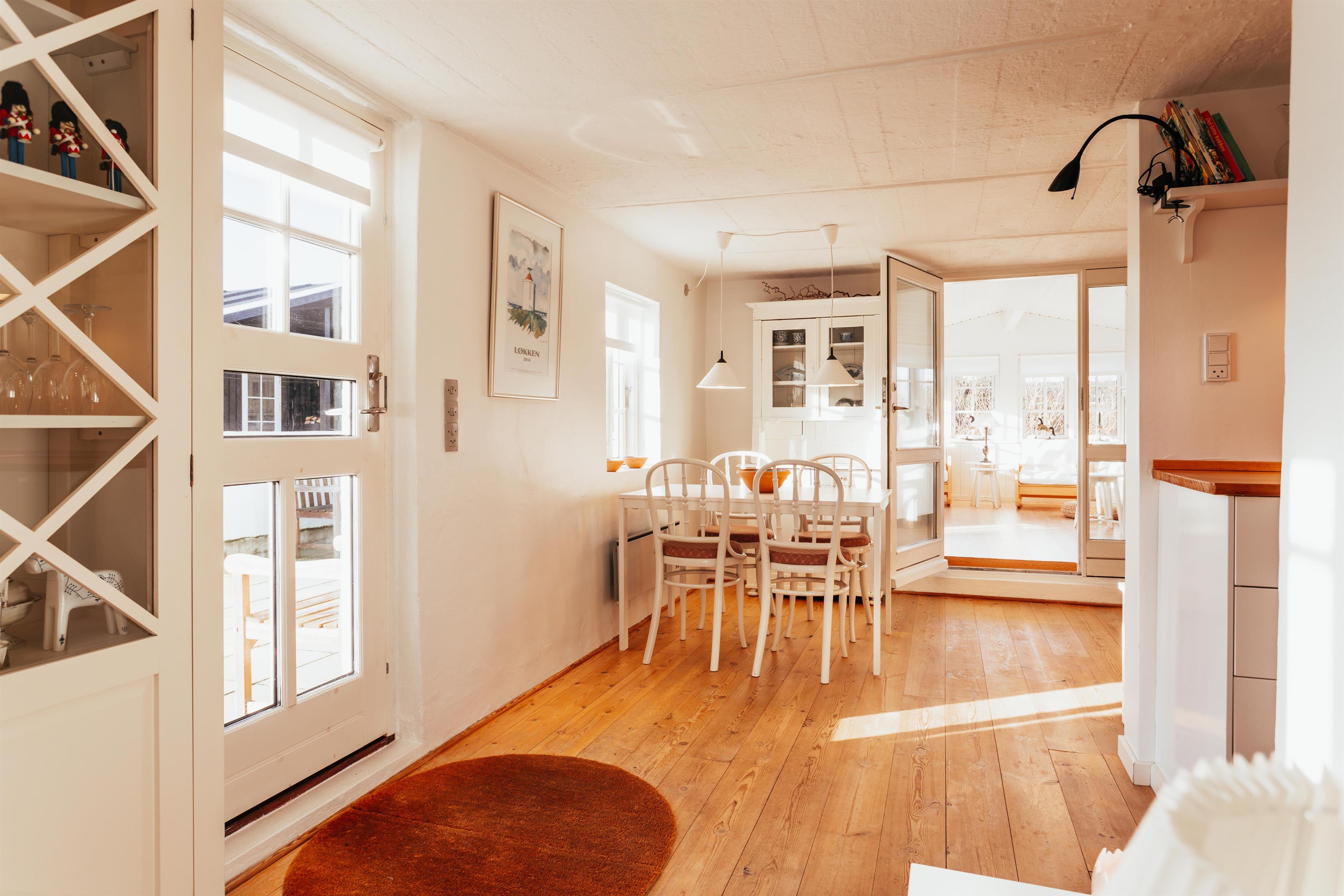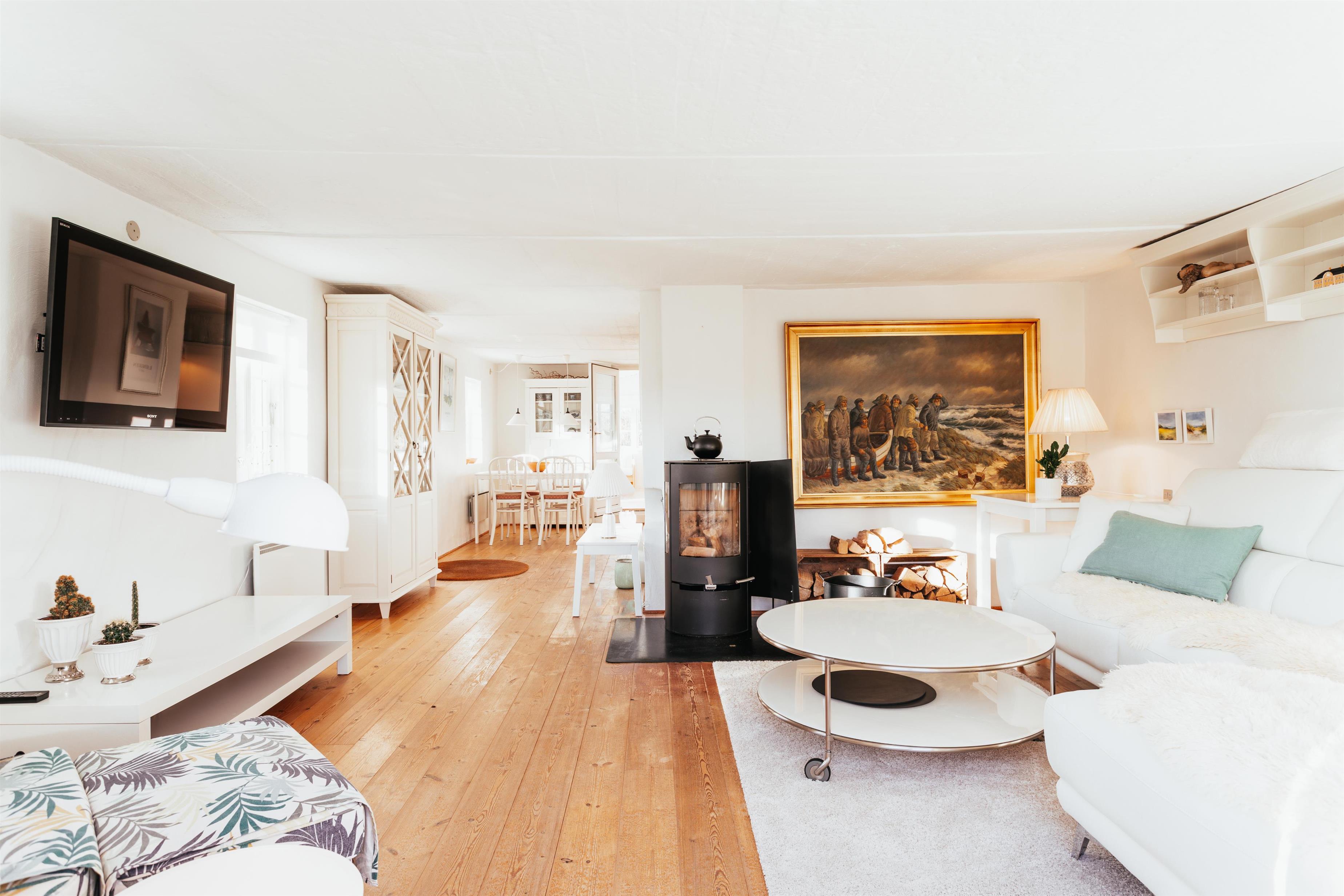 I huset findes der et veludstyret køkken samt en lys og rummelig opholdsstue, der ligger i åben forbindelse med køkkenet og spiseområdet. Det skønne lysindfald gennem vinduerne i udestuen, køkken og stuen skaber en dejlig atmosfære og gør opholdsrummene til det naturlige samlingspunkt for hele familien. Her kan I nyde feriestunder med madlavning, måltider og afslapning, mens brændeovnen sørger for varme og hygge på kølige dage.