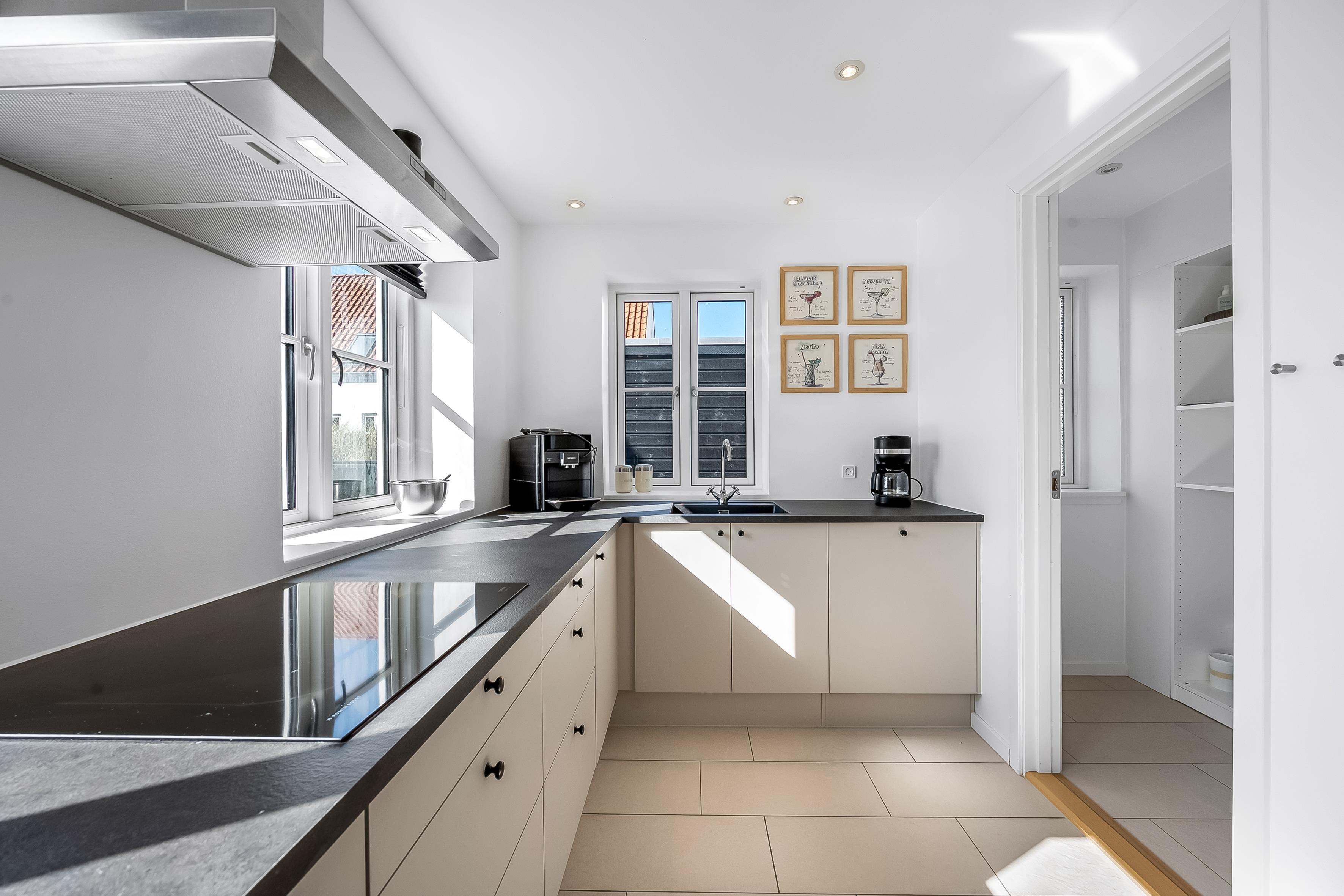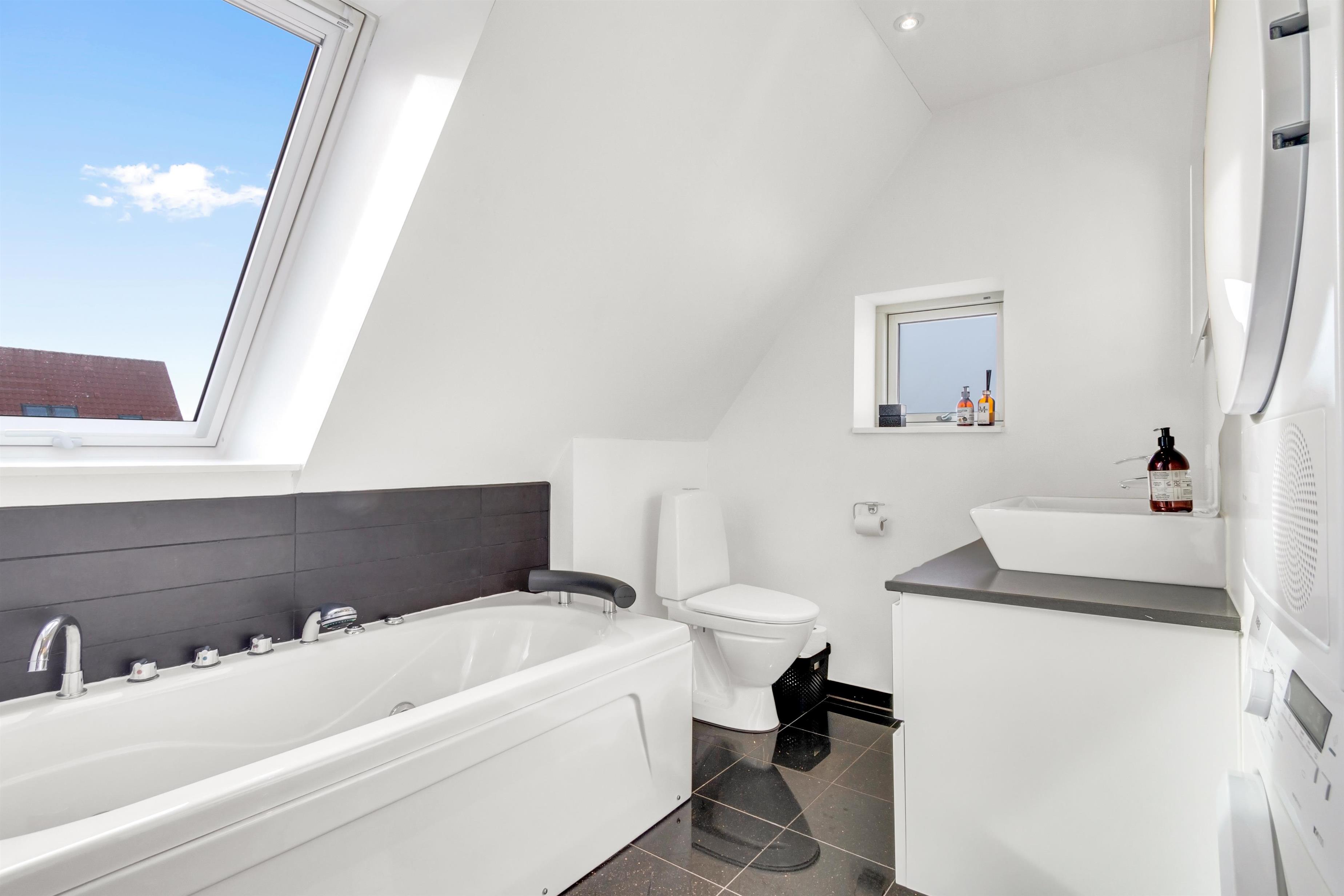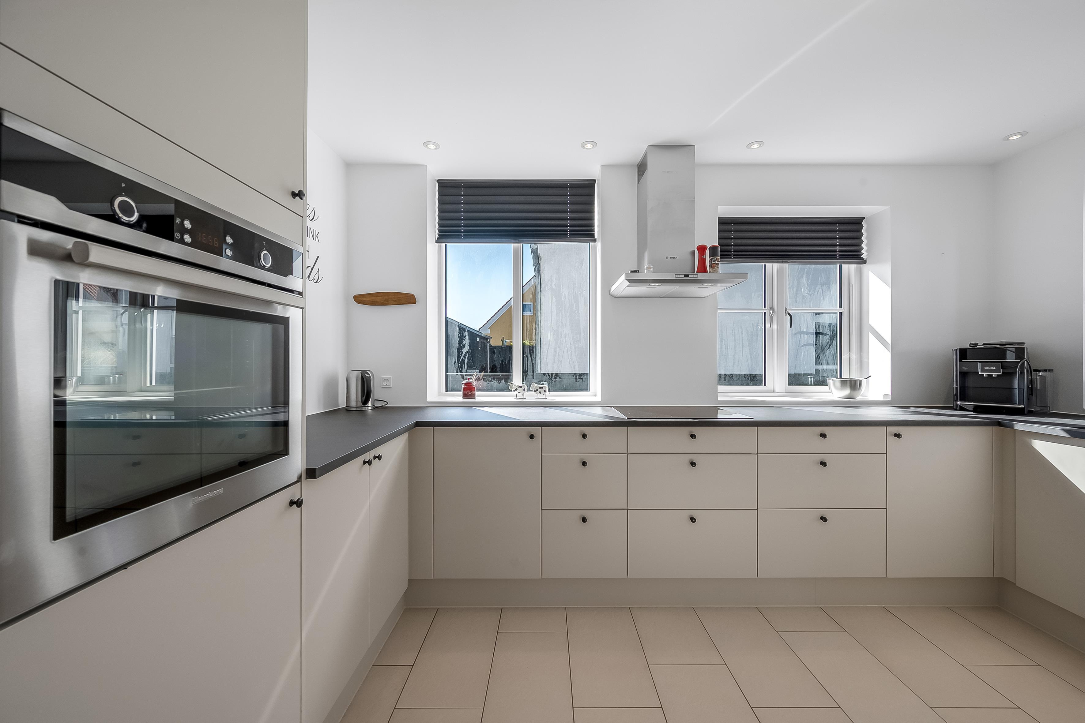 Selve huset er i to plan med tre soverum og et badeværelse på første sal. I stueetagen er der en dejlig, stor entré med badeværelse samt et super charmerende og lækkert køkken i åben forbindelse til den store, lyse stue og spisestue. Huset er stilsikkert indrettet og emmer af luksus og hygge. Hele vejen rundt om huset er der en dejlig terrasse, så det skulle altid være muligt at finde en plads i solen, når sommeren viser sig fra sin bedste side.
